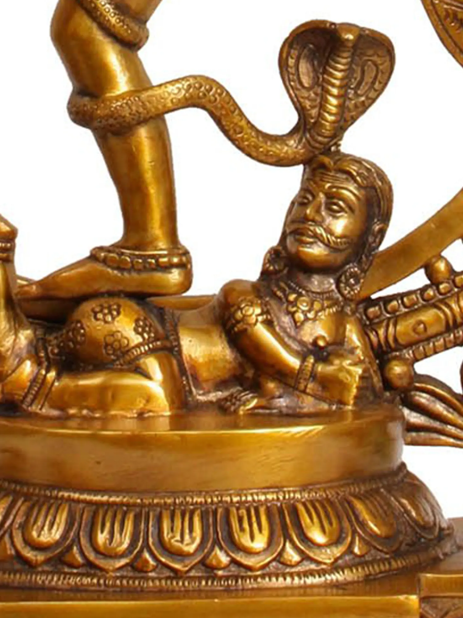 The mesmerizing portrayal of Nataraja dancing against the backdrop of the sacred symbol "Aum" intricately crafted in brass represents the cosmic dance resonating with the eternal sound of the universe. Handmade in India, this sculpture symbolizes the unity of the cosmic dance and the primal sound, inviting contemplation on the divine energy that governs creation. Each detail in this depiction invites viewers to explore the cosmic dance of creation and dissolution, resonating with the primal sound that permeates the universe.