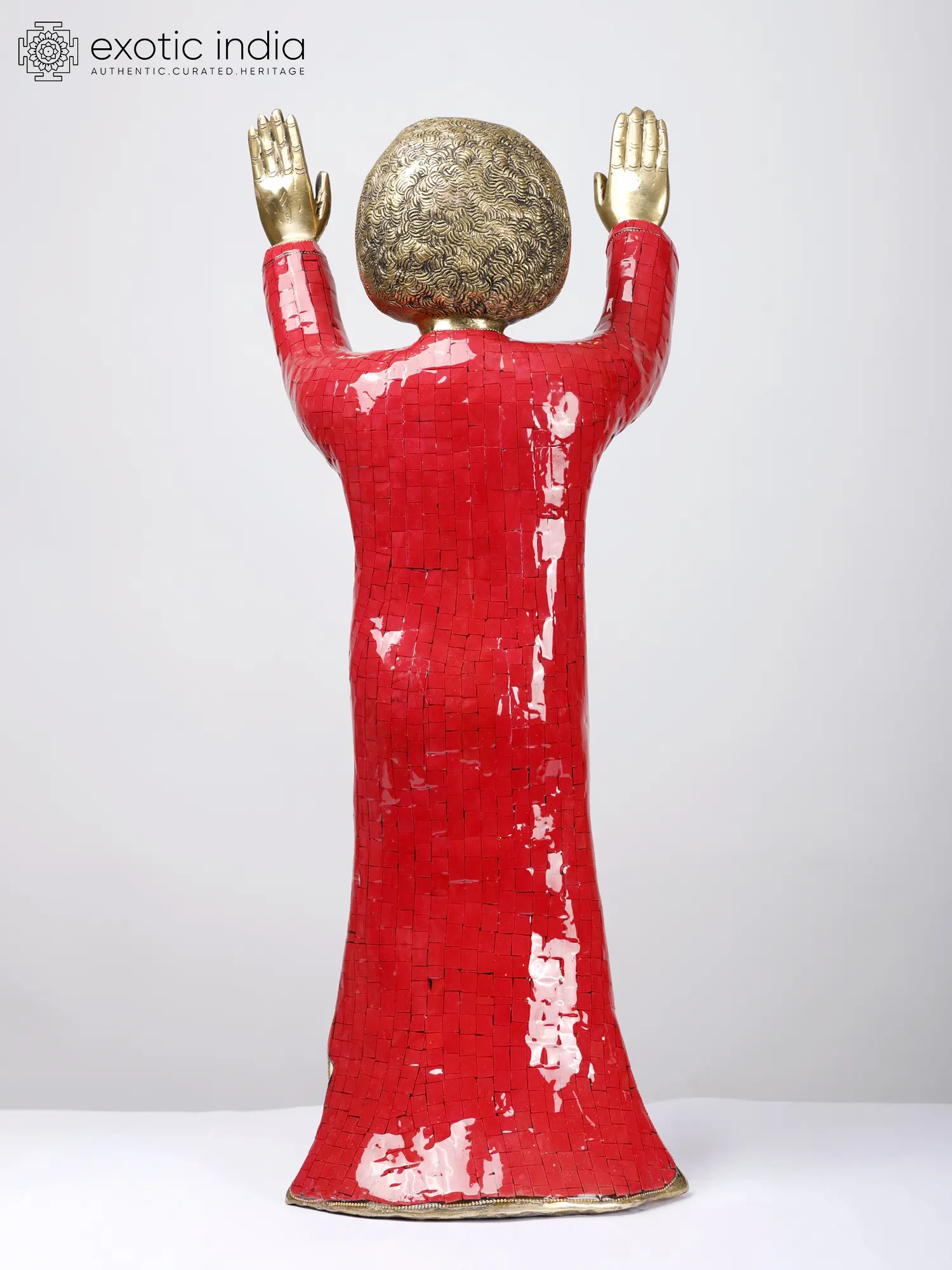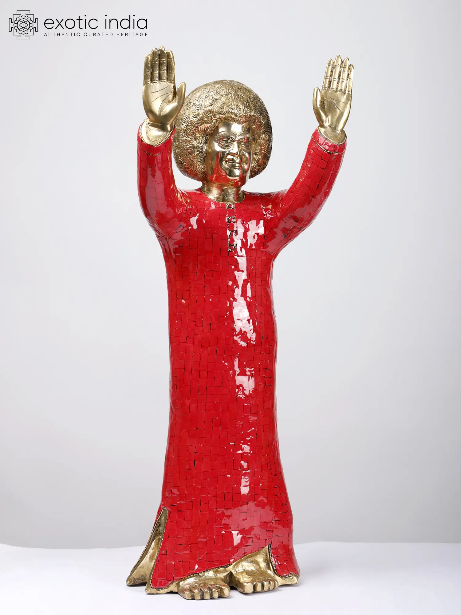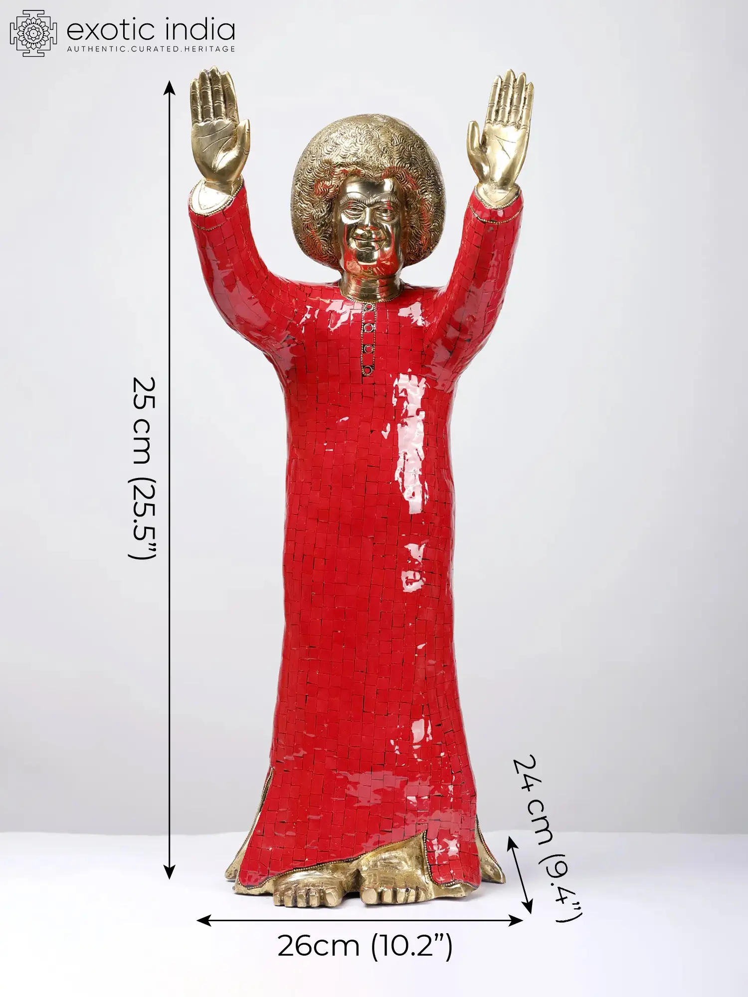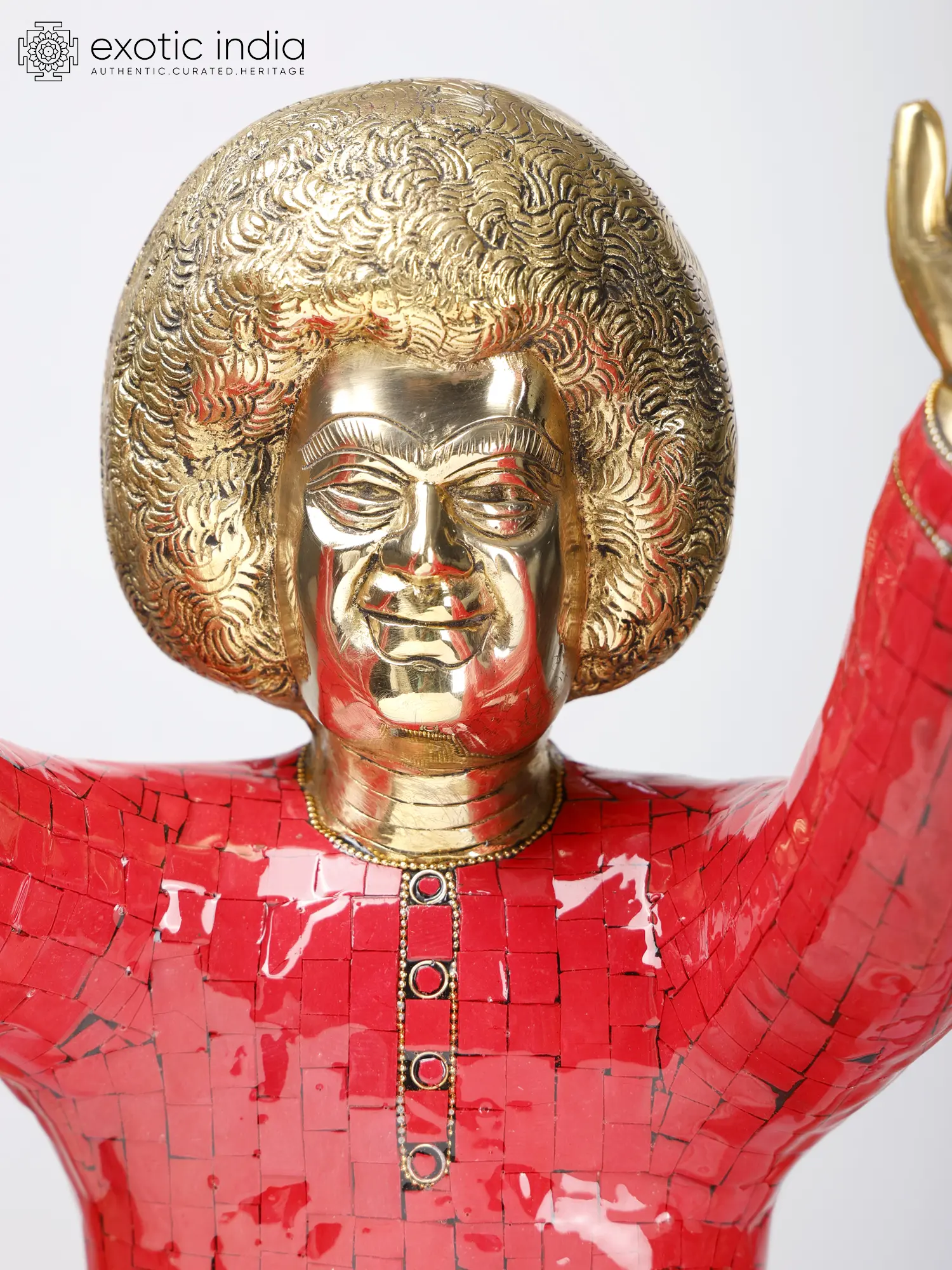 In the radiant brass statue of Sathya Sai Baba, with hands raised in a gesture of divine blessing, his powerful presence is brought to life. The sculptor's choice of pure brass, decorated with rich red inlay pieces, breathes vibrant energy into the figure.