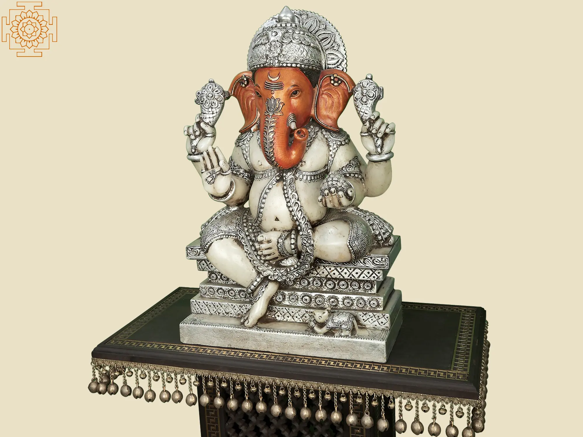 25" Silver Embellished Marble Lord Ganesha | Handmade