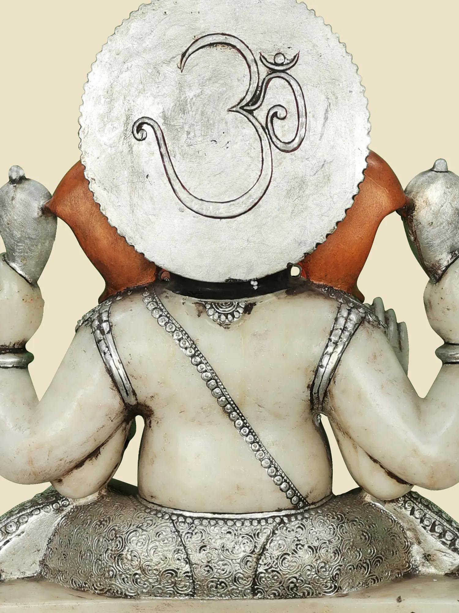 This exquisite statue brings the divine presence of Lord Ganesha into your home, a powerful symbol of wisdom, prosperity, and good fortune. Crafted from luminous white marble, each detail is meticulously rendered by hand, showcasing the devotion and artistry of skilled artisans. Lord Ganesha, the beloved elephant-headed deity, is depicted in his iconic seated posture, radiating an aura of peace and serenity. His gentle expression invites contemplation, while his four arms, each adorned with symbolic objects, convey his multifaceted nature and blessings. The body of the deity is sculpted from pure white marble, offering a pristine canvas that accentuates the intricate silver embellishments. These adornments are not merely decorative; they are imbued with spiritual significance, depicting divine patterns and symbolic motifs that represent the cosmic order and the auspicious power of Ganesha. The warm, earthy tones of his face and trunk are a striking contrast to the cool marble and gleaming silver, adding depth and vibrancy to the overall composition. According to Hindu mythology, Lord Ganesha is the son of Lord Shiva and Goddess Parvati. He is revered as the Vighnaharta, the remover of obstacles, and is invoked at the beginning of all auspicious undertakings, from new ventures to ceremonies and rituals. His large ears symbolize his ability to listen to the prayers of his devotees, while his single tusk represents the overcoming of duality and the pursuit of singular focus. His prominent belly signifies his capacity to digest and absorb all experiences, both good and bad.
