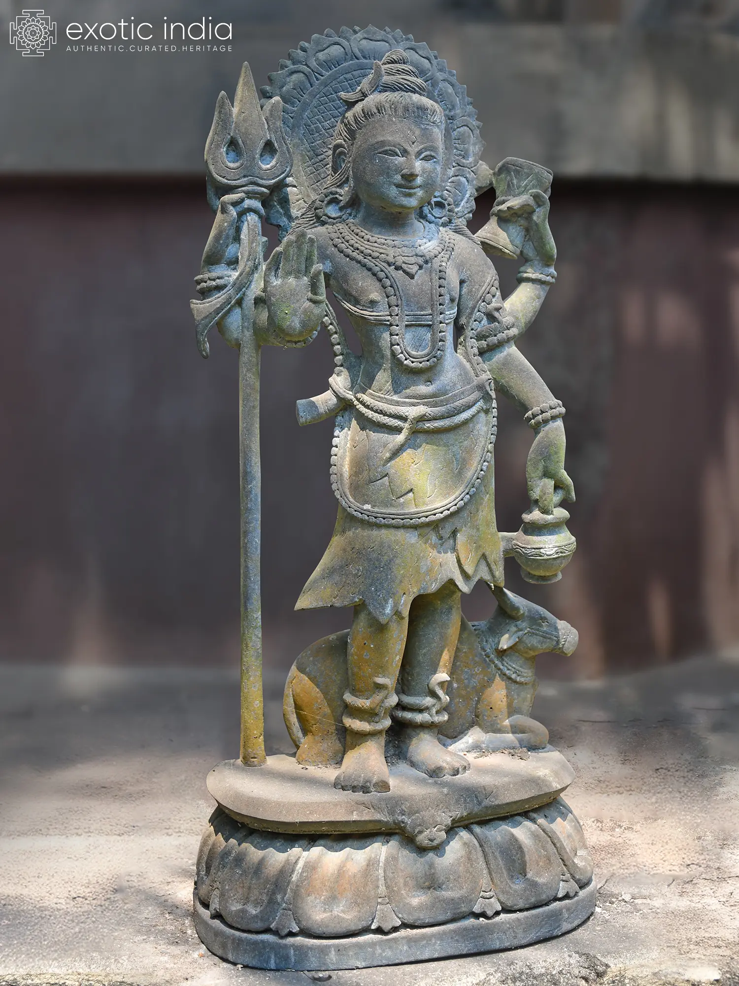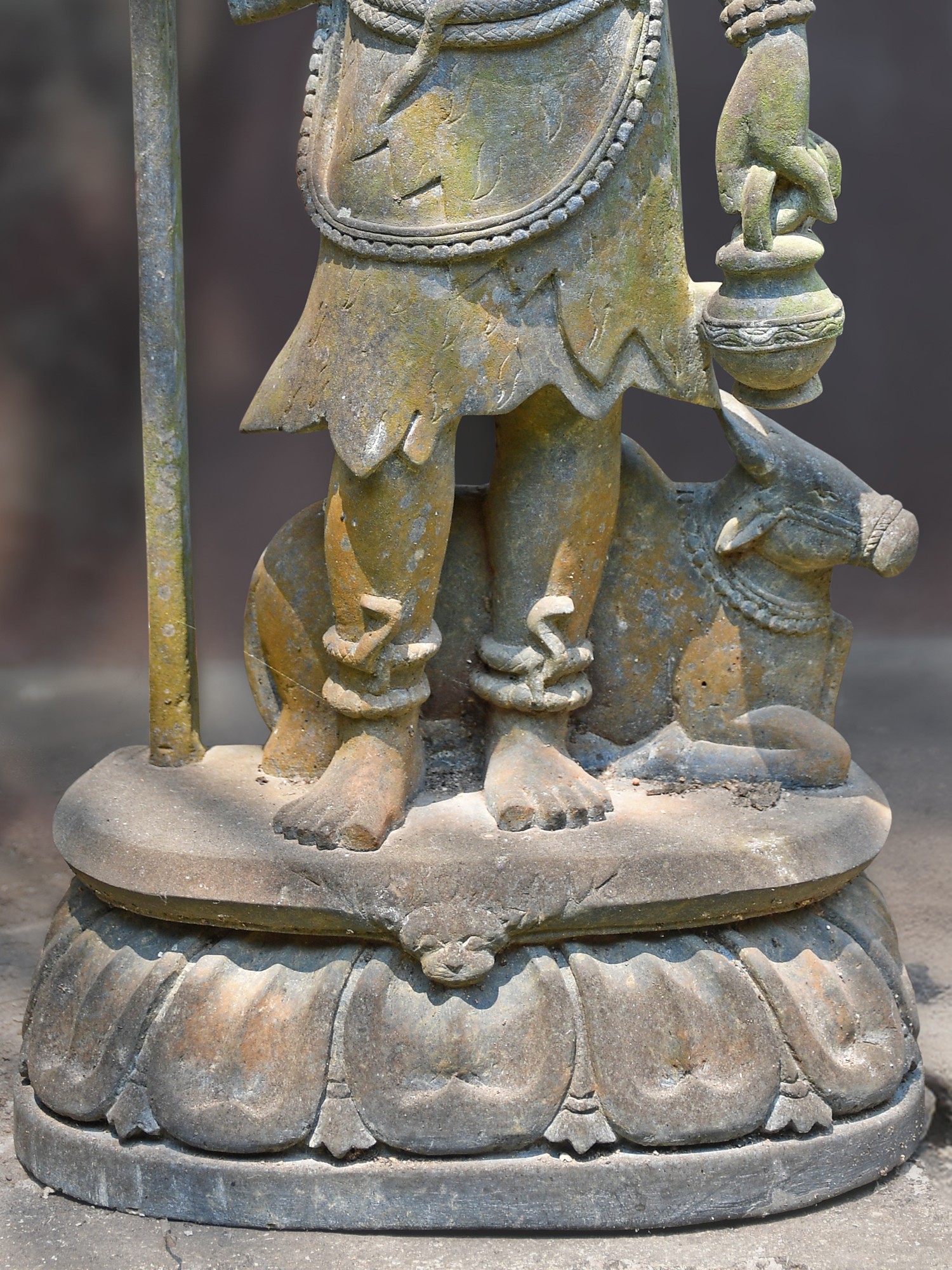 Standing tall at twenty-five inches, this sculpture captures Shiva in a posture of serene authority, holding his iconic trident. Observe the delicate rendering of his divine adornments, from the elaborate headdress to the intricate necklaces and armbands, each detail meticulously preserved. Beside him, the bull Nandi, his celestial vehicle, rests in quiet devotion, completing the powerful iconography.