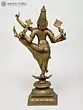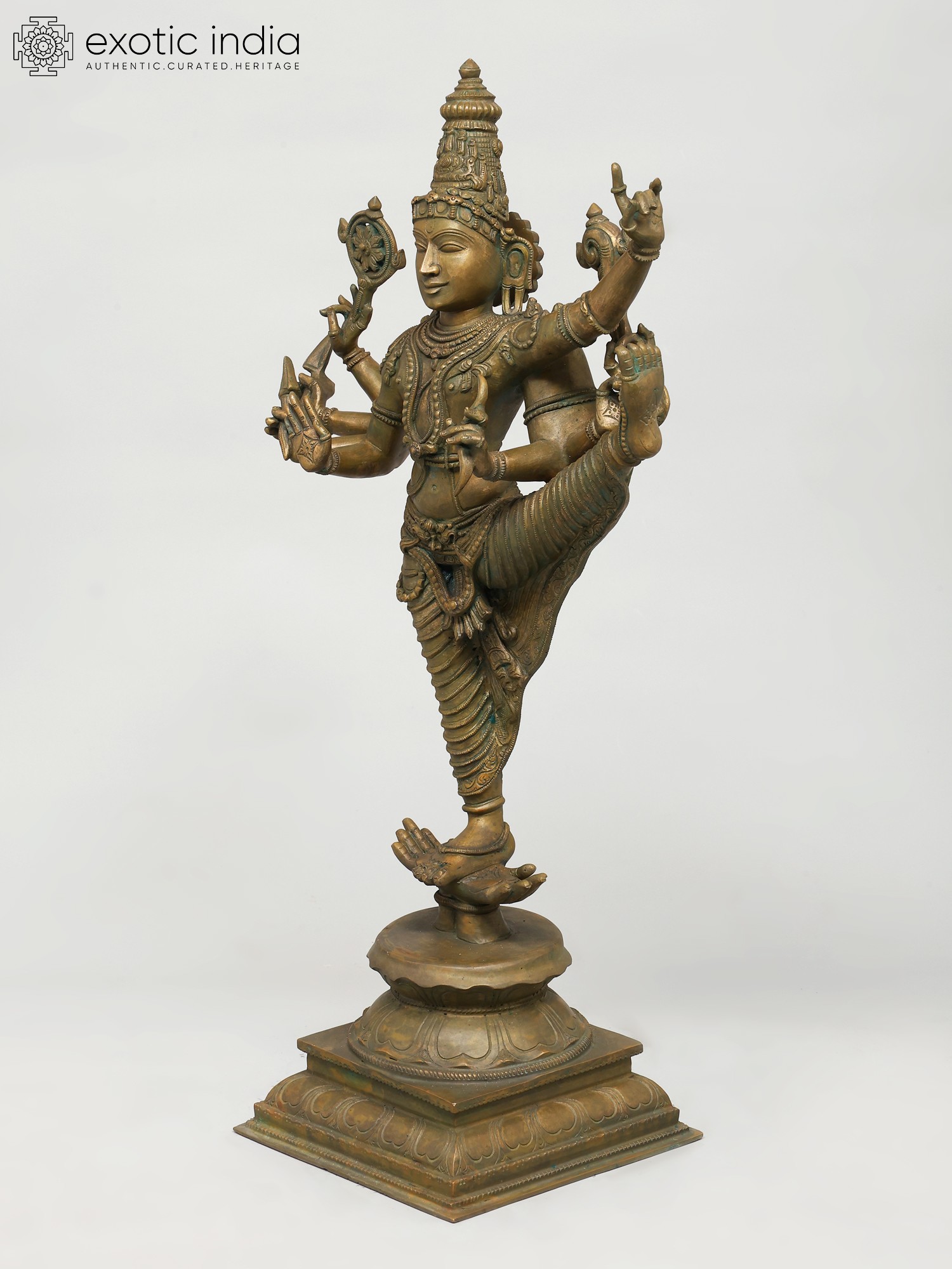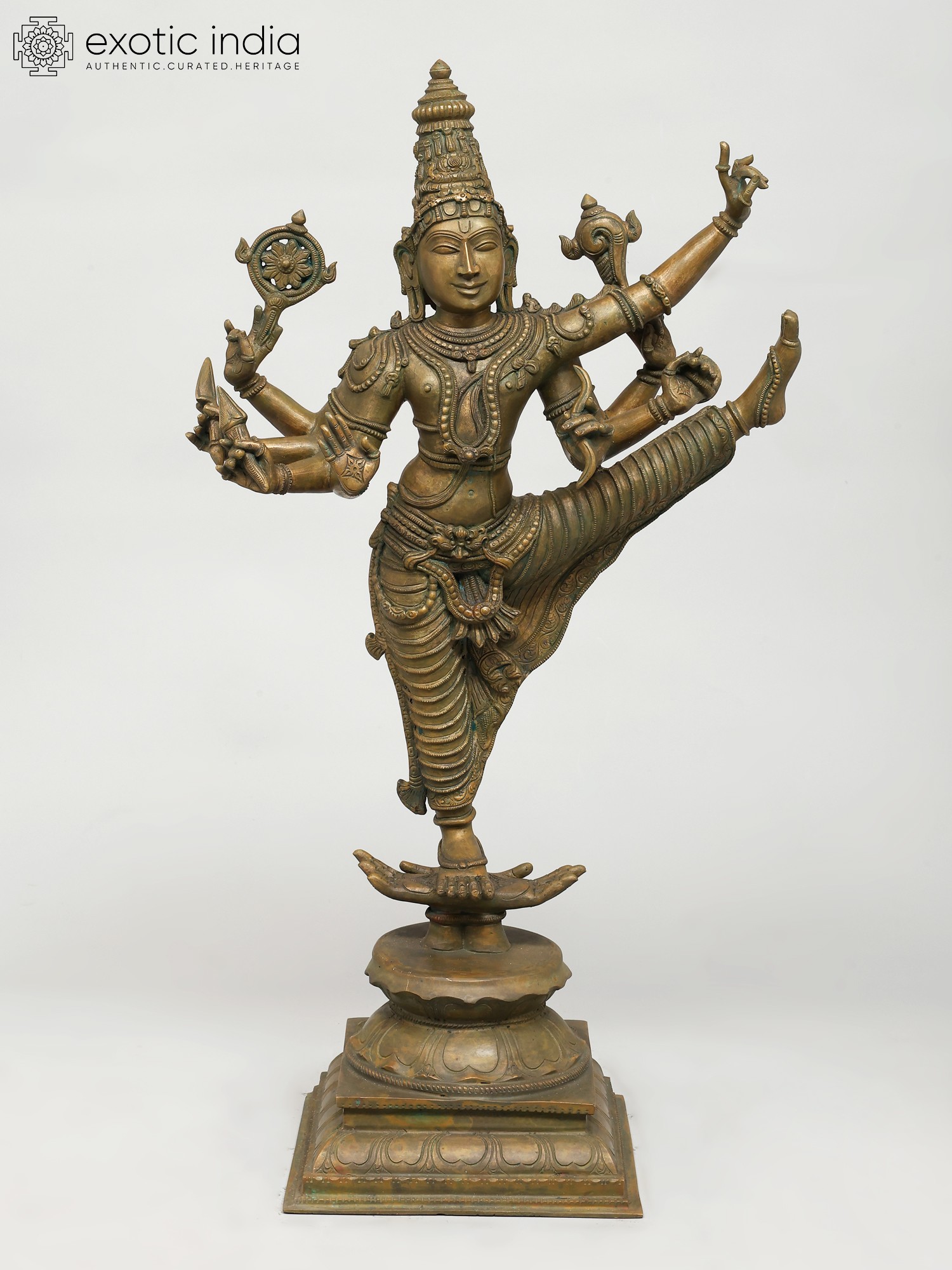 His arms, gracefully adorned with ornate decorations, hold symbols of his divine power, while a gentle smile graces his face, radiating serenity amidst cosmic action. The vivid details breathe life into the sculpture, transforming bronze into an animated display of divine drama that feels less like a statue and more like a mystical vision of Vishnu’s transcendental dance in time and space.