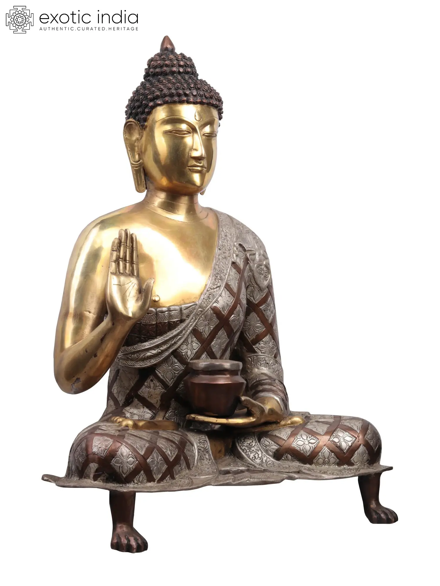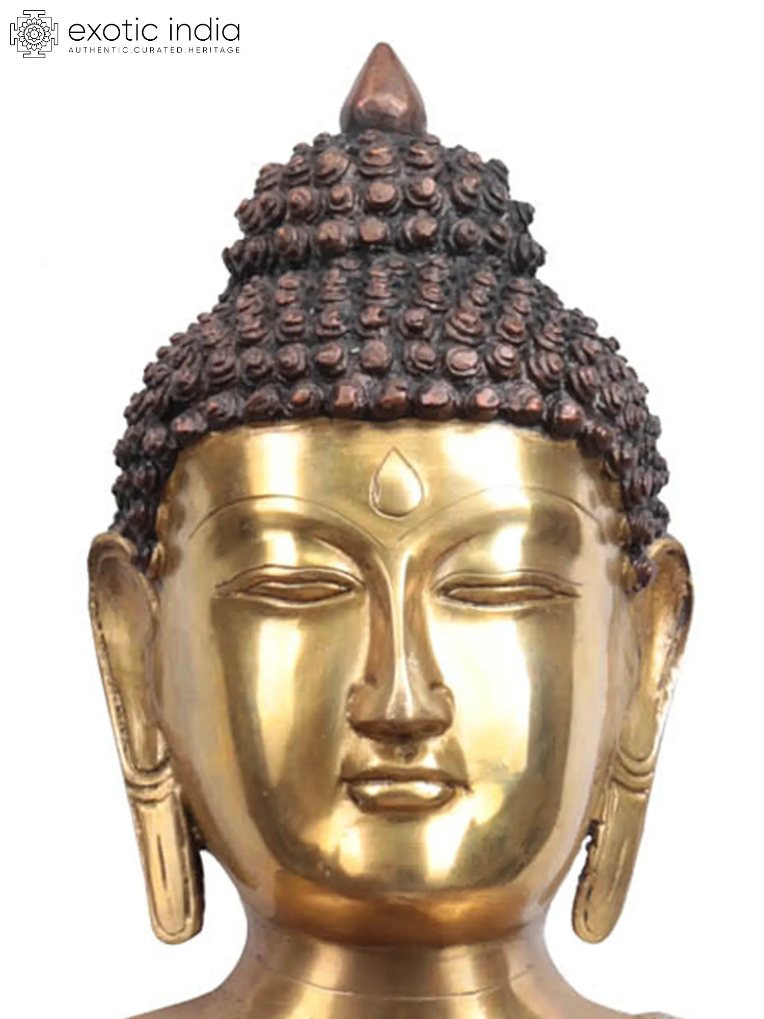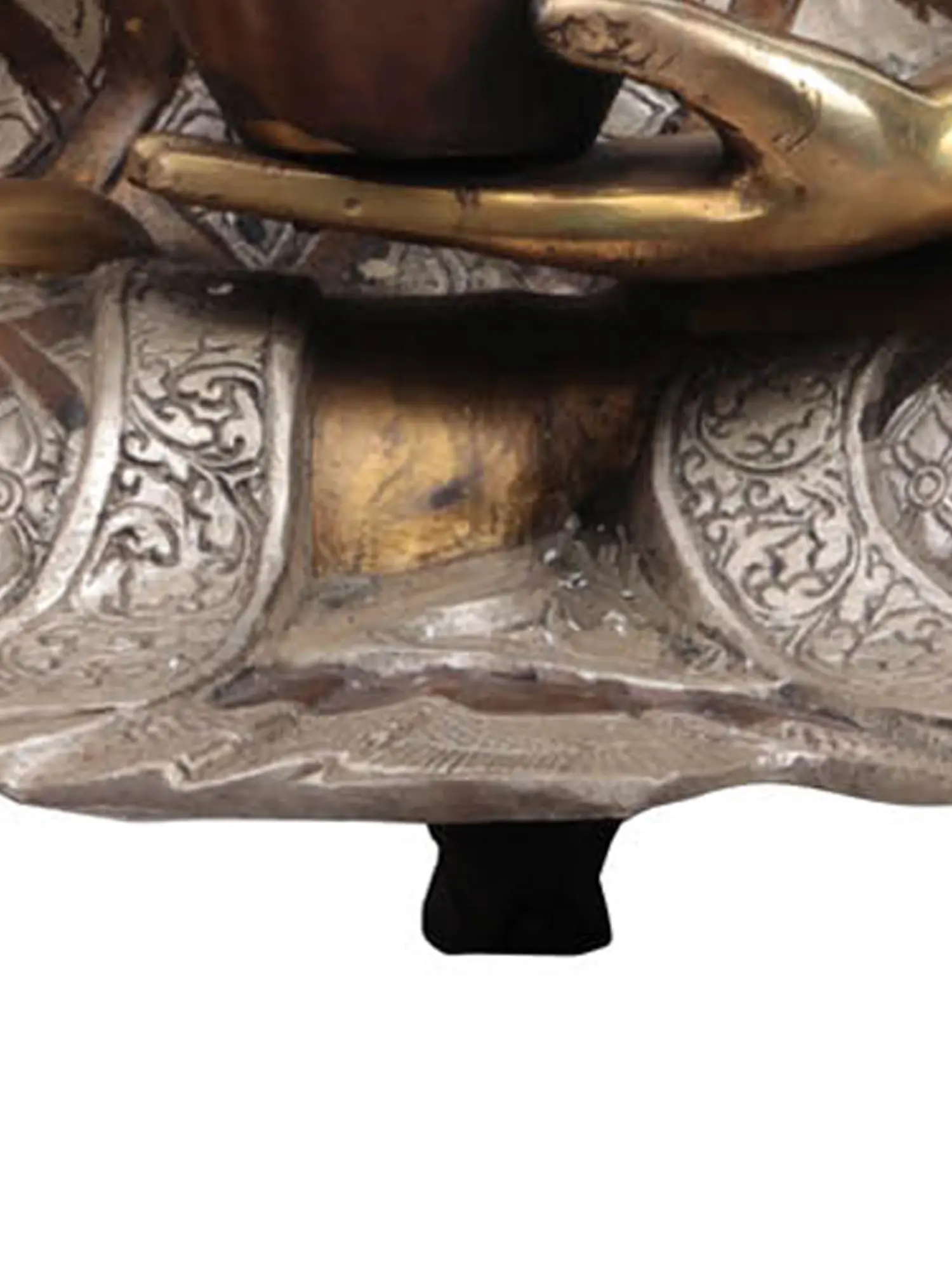 Seated atop a vast lotus form as lustrous as His own form, Lord Buddha is depicted in this one-of-a-kind brass sculpture with His hand raised in eternal blessing. The copper and silver of the fluid robe complement the sheen of the skin as much as the intricate brasswork on the crown.