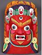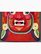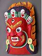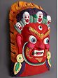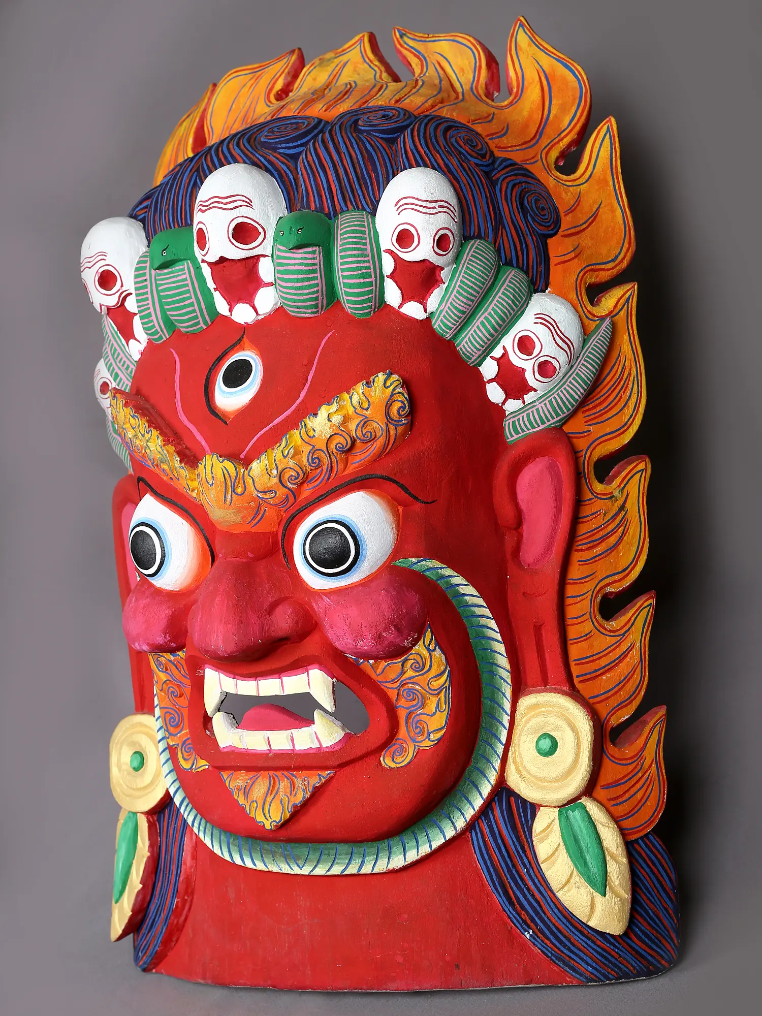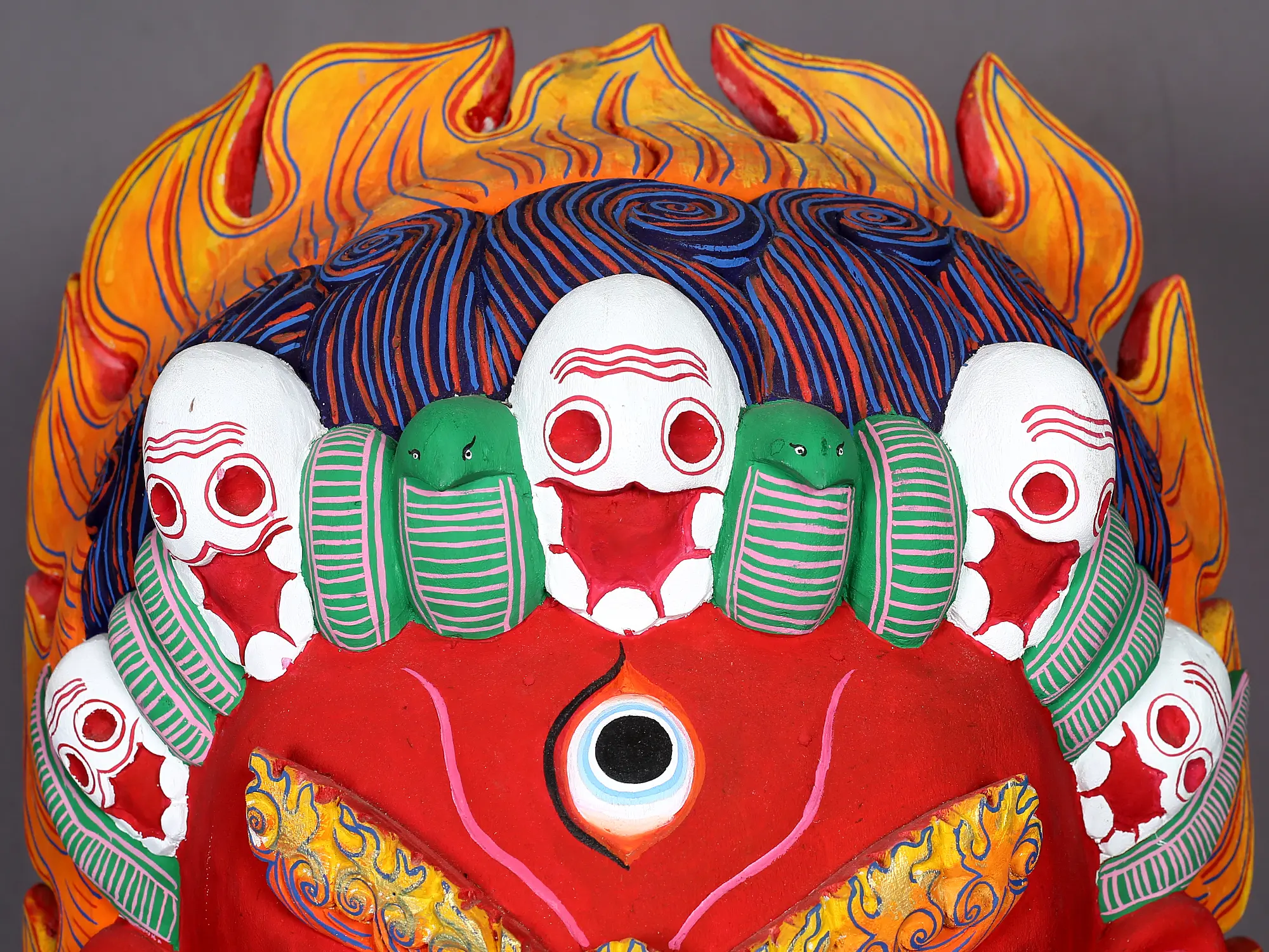 Bhairav's mask shows a fierce countenance that reflects the essence of Lord Shiva himself. Notably, the mask encapsulates distinctive attributes such as bulging eyes, facial hair, and a wide-open mouth, characteristics commonly associated with wrathful deities in both Hindu and Buddhist traditions. Adorned with a crown embellished with five skulls and two serpents, the mask resonates with the quintessential features of Lord Shiva, underscoring his iconic imagery.