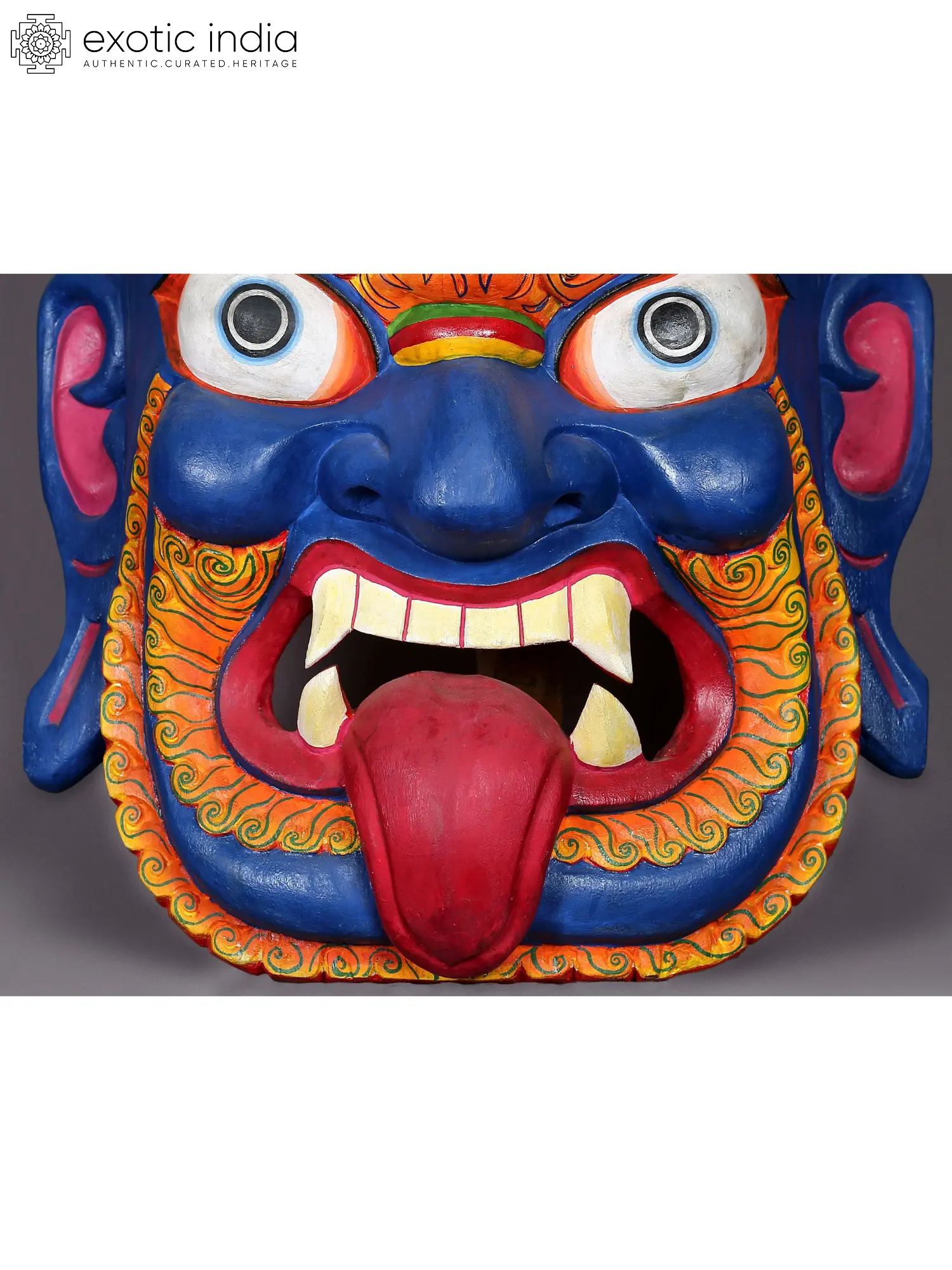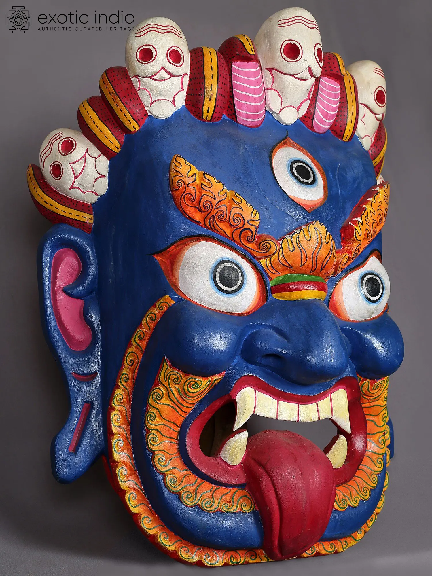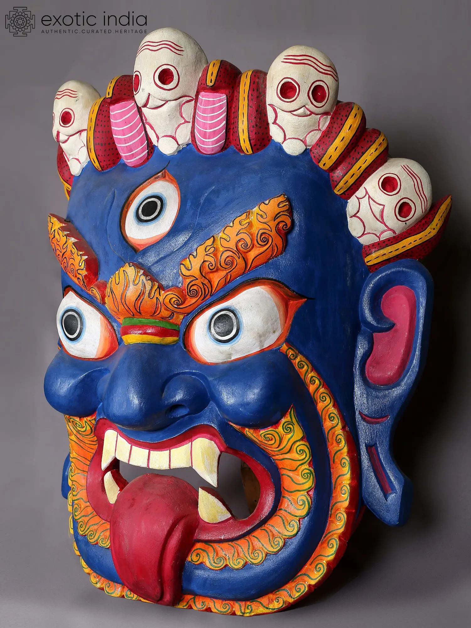 The Wooden Bhairava Mask is a fierce embodiment of divine energy, painted in a striking palette of blue and orange. Bhairava's expression is fierce, with intricately carved features conveying his protective and transformative nature. The blend of blue symbolizes his transcendence, while the fiery orange represents his powerful energy. The wooden texture adds a tactile dimension, grounding the mask in earthly presence. This artwork captures Bhairava's dynamic essence, inviting contemplation on the interplay between opposing forces within life. The fusion of colors and intricate carving brings forth his role as a guardian and guide through life's challenges. The Bhairava mask, with its intense hues and intricate features, serves as a visual reminder of the power of spiritual transformation and the fierce determination to overcome obstacles.