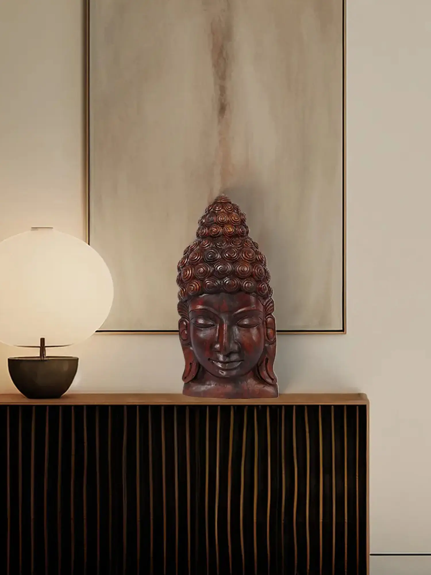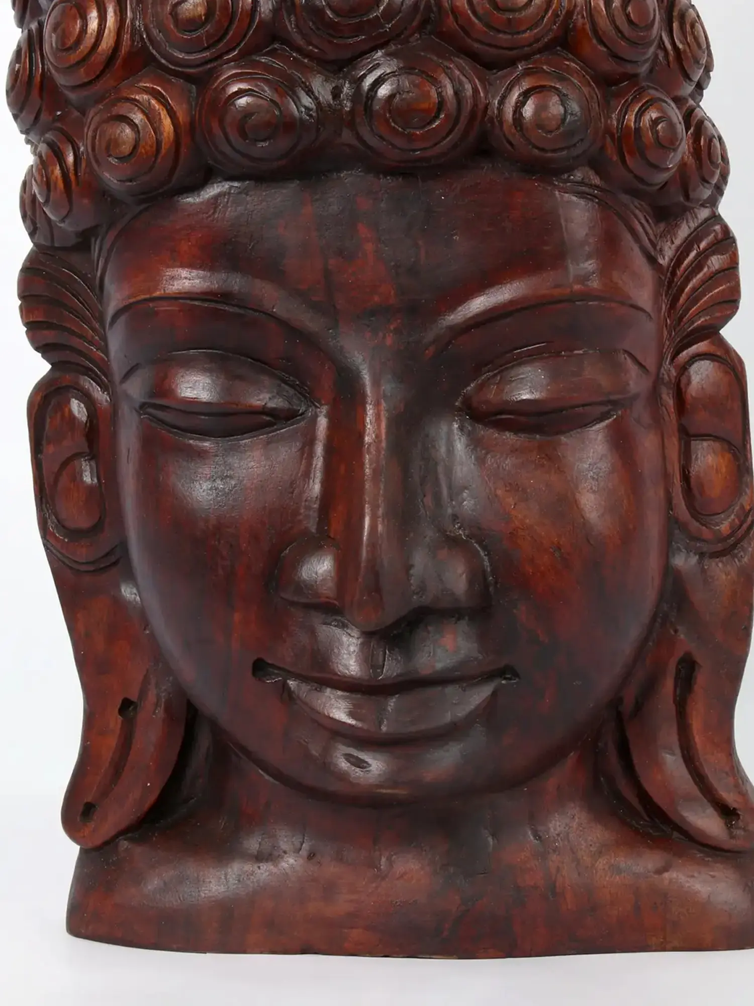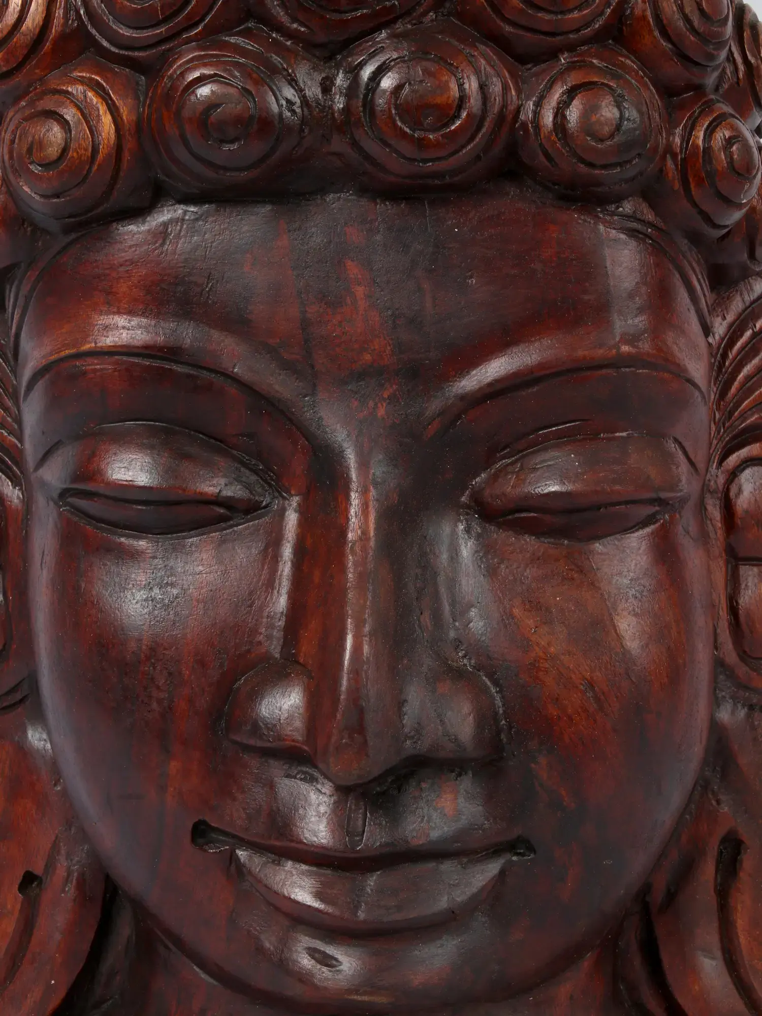 This wooden statue of Lord Buddha, “the Awakened One”, a sublime embodiment of serenity and wisdom, beckons with a timeless allure. His snail shell curls, like ripples in the tranquil pond of enlightenment, cascade down in graceful harmony. Elongated earlobes, whispered symbols of profound listening, resonate with the universe’s secrets. His closed eyes, veiled windows to an inner universe, invite us to seek solace within. A serene smile graces his lips, an eternal testament to the peace that radiates from his being. In this sublime visage, we find an eternal source of solace, an enduring symbol of tranquility that transcends time and space.