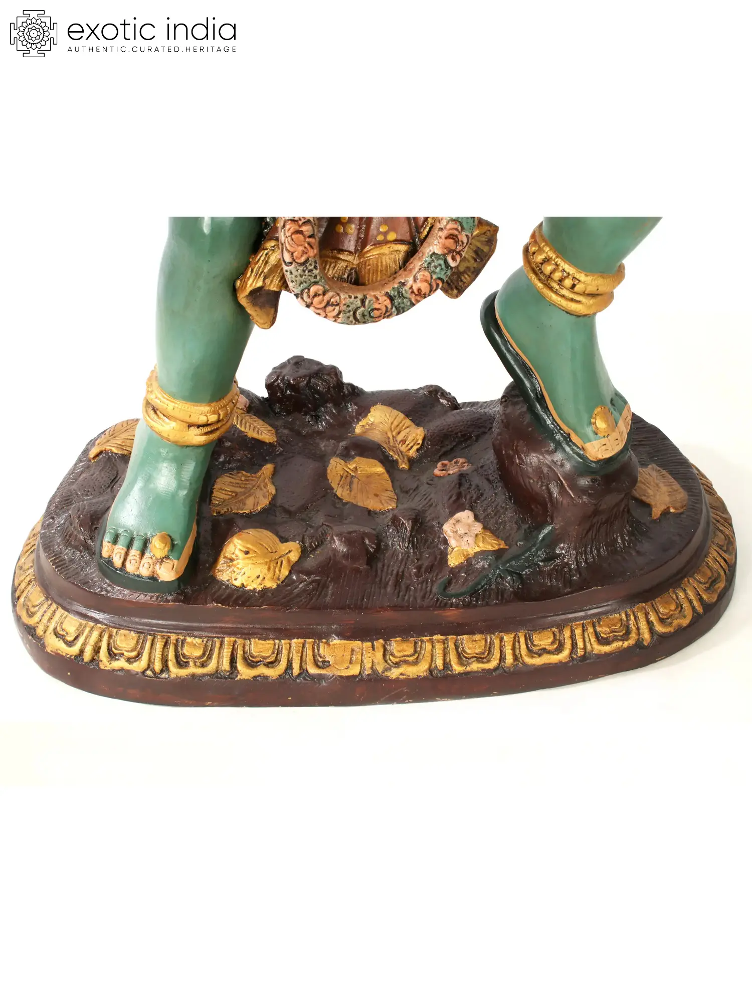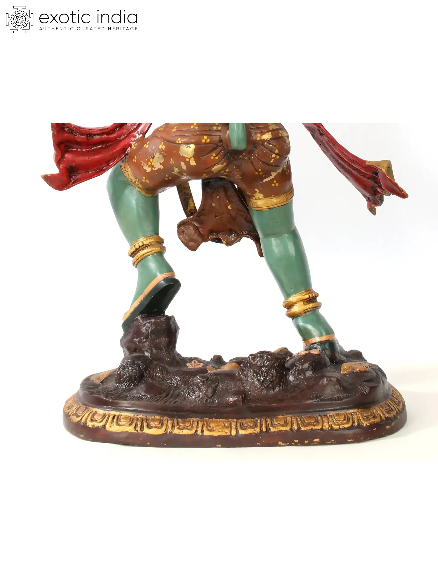 The murti of Lord Hanuman that you see on this page depicts Him having plucked the all-important mount. Compared to the ashtasiddha yogi, the mountain appears to be small and lightweight. Bits of mountain beneath His feet.