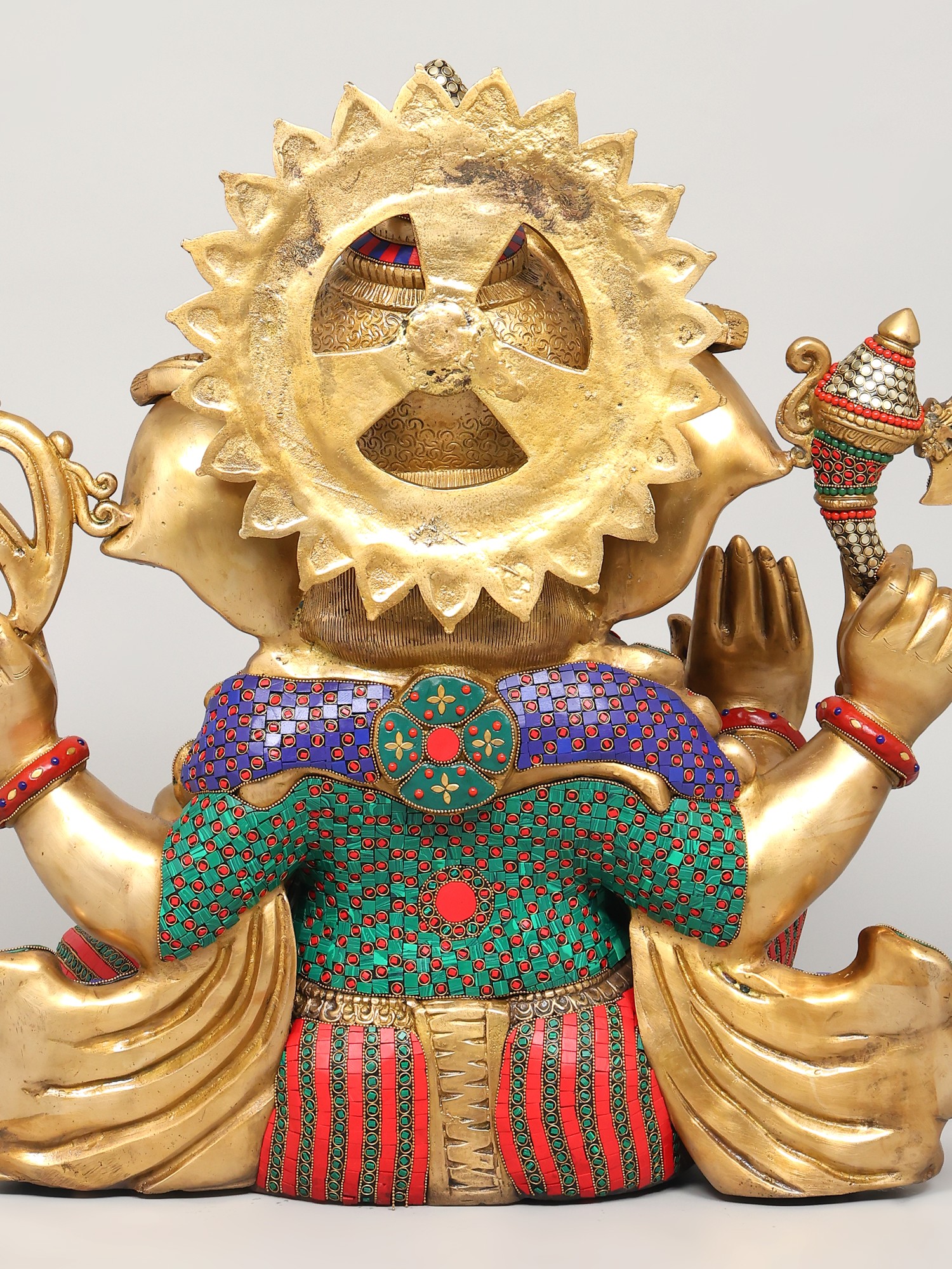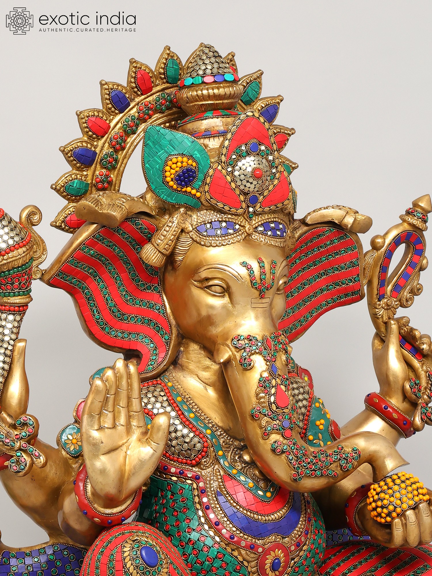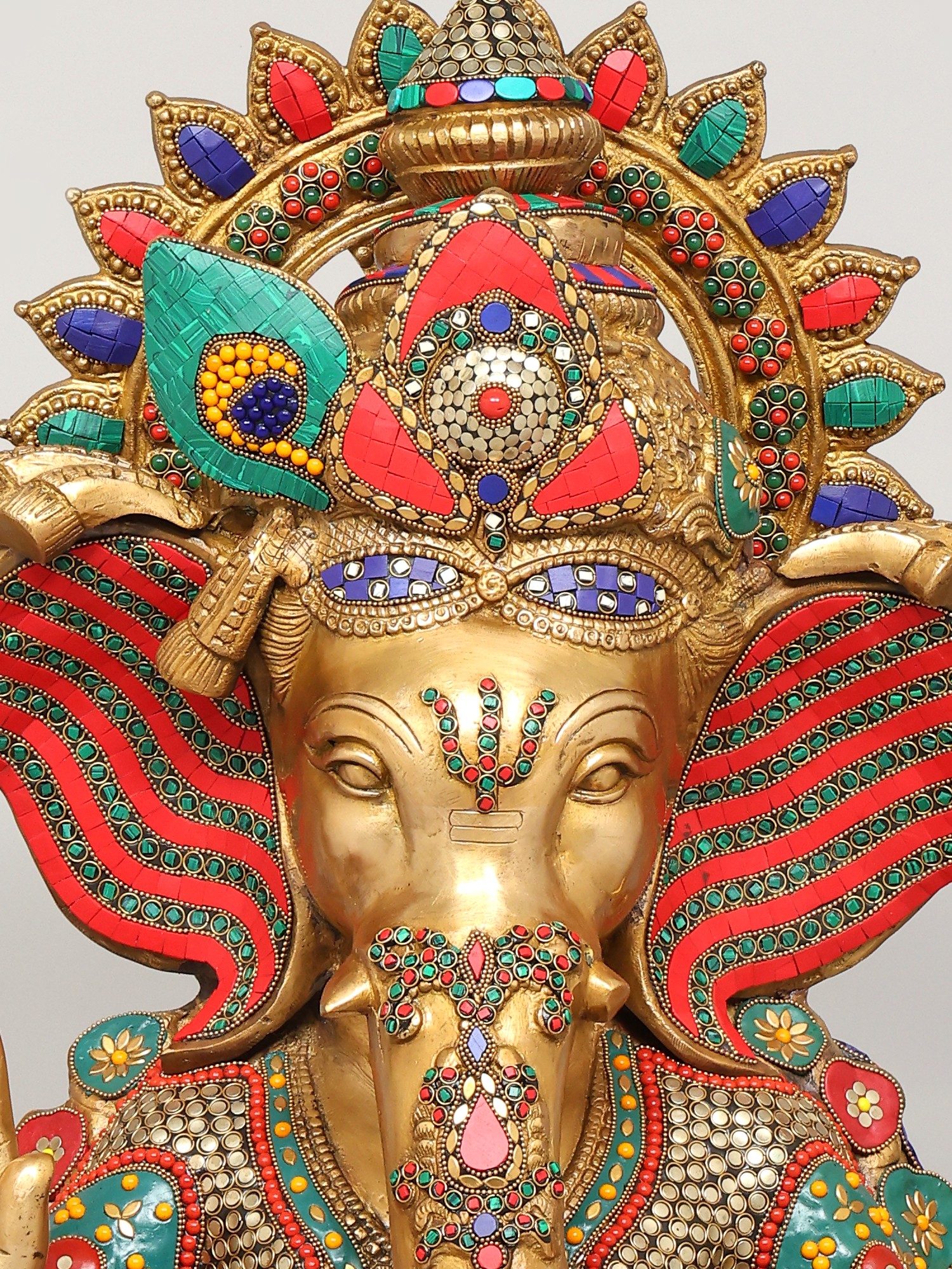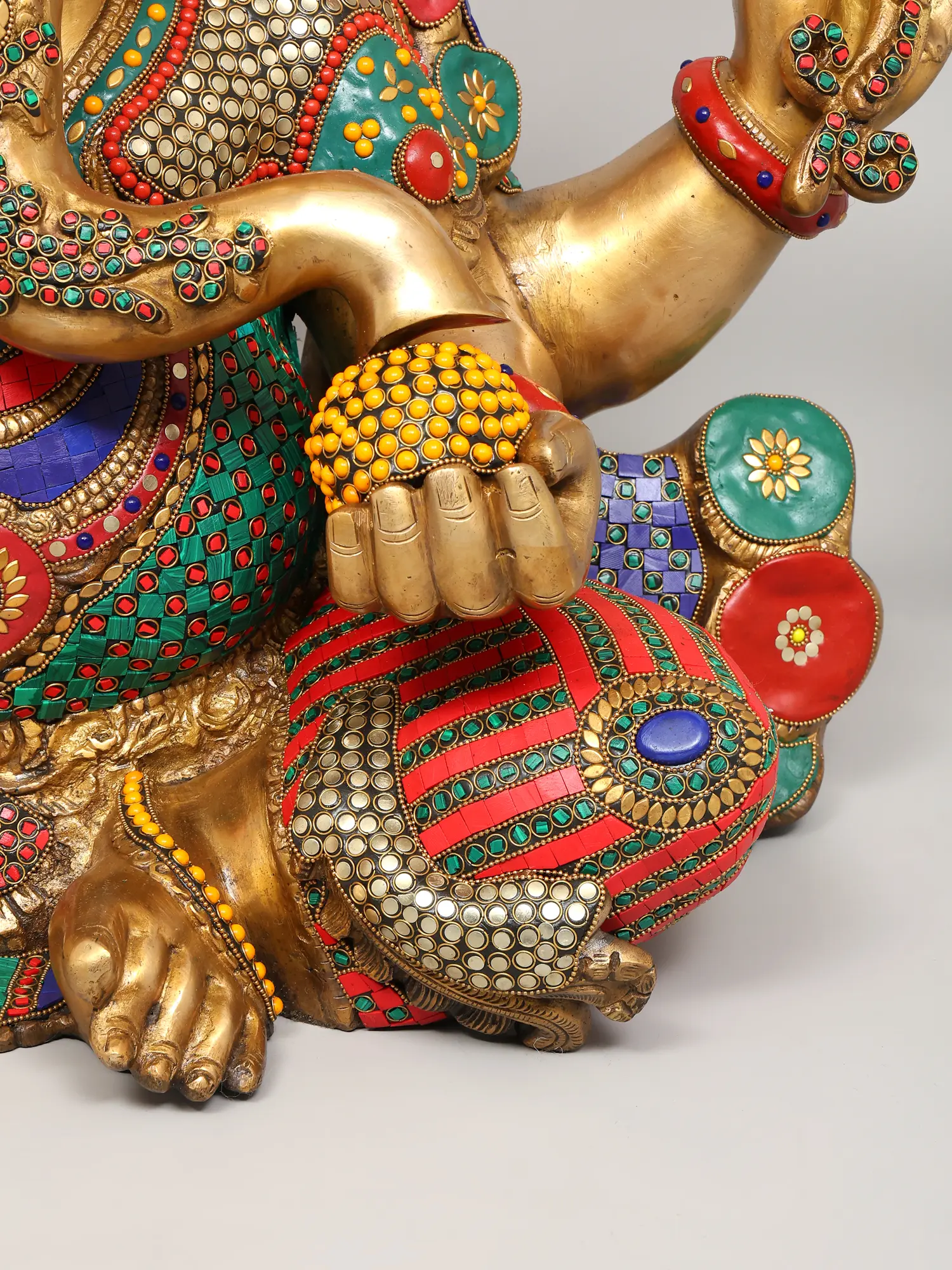 The statue itself is a testament to the skill and dedication of the artisans who created it. The solid brass form provides a weighty and grounding presence, while the meticulously inlaid stones add a touch of vibrancy and opulence. The bright colors used in the inlay are carefully chosen to complement the golden brass, creating a visual symphony that is both captivating and inspiring. From the intricately detailed crown to the carefully rendered facial features, every aspect of this statue speaks to the deep reverence for Lord Ganesha and the desire to create a truly exceptional work of art. This is not merely a decorative piece; it is a sacred object imbued with the spirit of devotion, a powerful reminder of the divine presence in our lives.