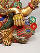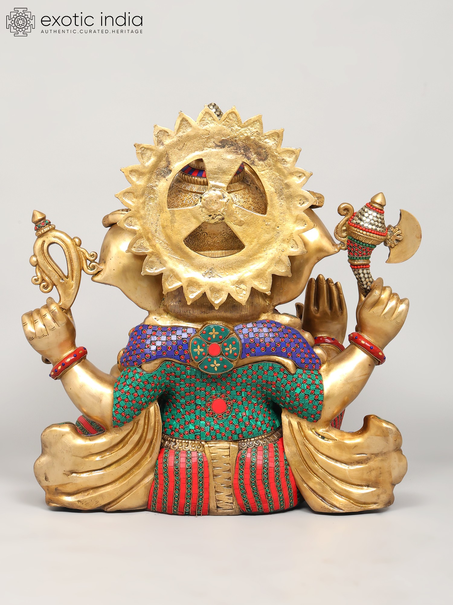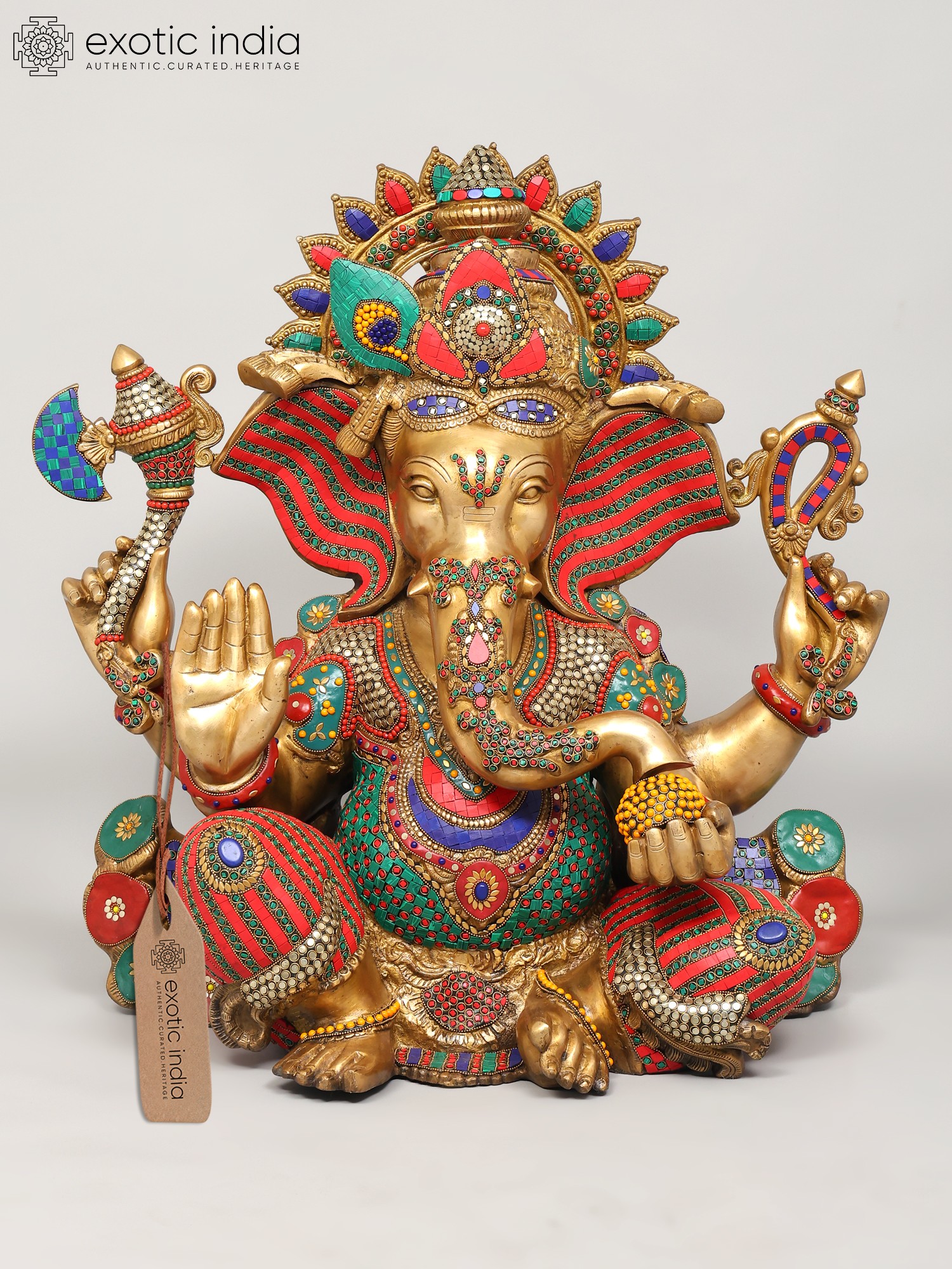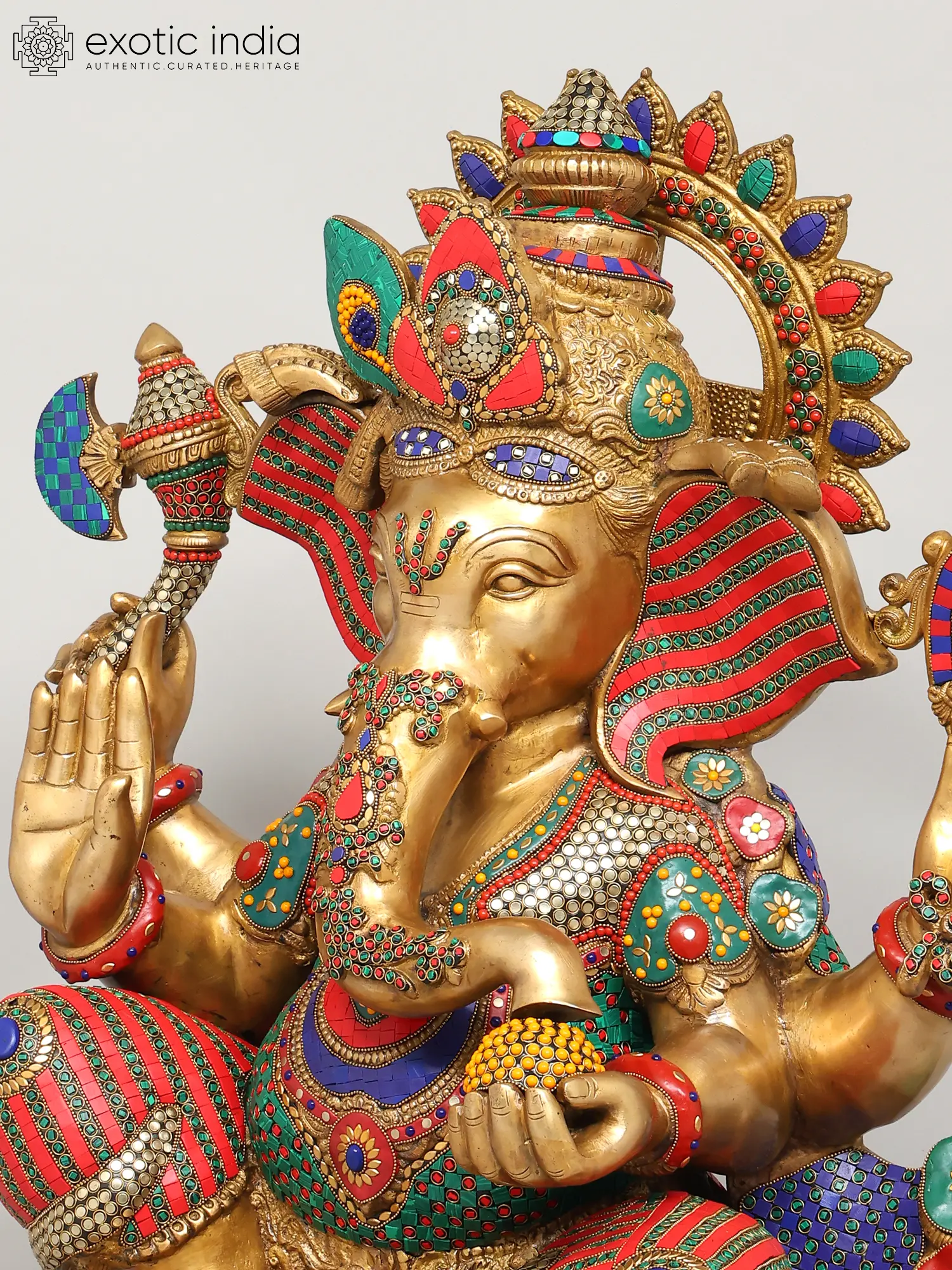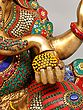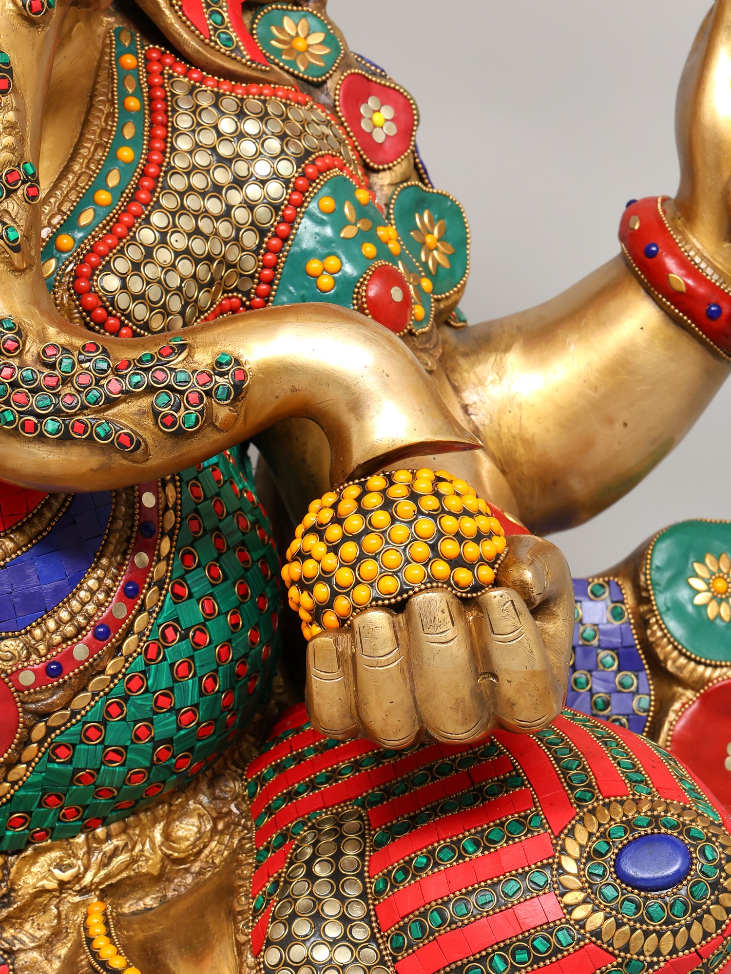 The statue itself is a testament to the skill and dedication of the artisans who created it. The solid brass form provides a weighty and grounding presence, while the meticulously inlaid stones add a touch of vibrancy and opulence. The bright colors used in the inlay are carefully chosen to complement the golden brass, creating a visual symphony that is both captivating and inspiring. From the intricately detailed crown to the carefully rendered facial features, every aspect of this statue speaks to the deep reverence for Lord Ganesha and the desire to create a truly exceptional work of art. This is not merely a decorative piece; it is a sacred object imbued with the spirit of devotion, a powerful reminder of the divine presence in our lives.