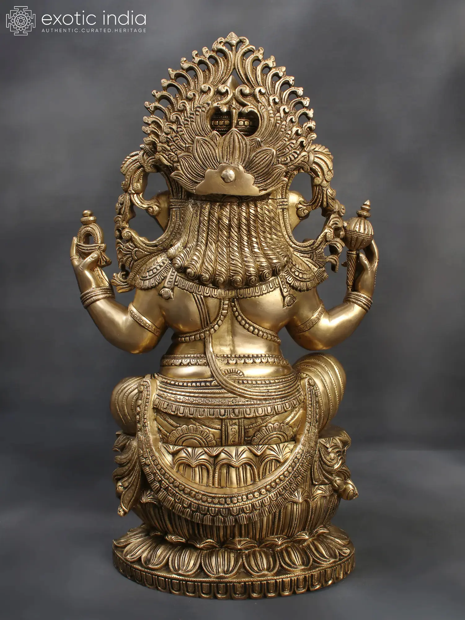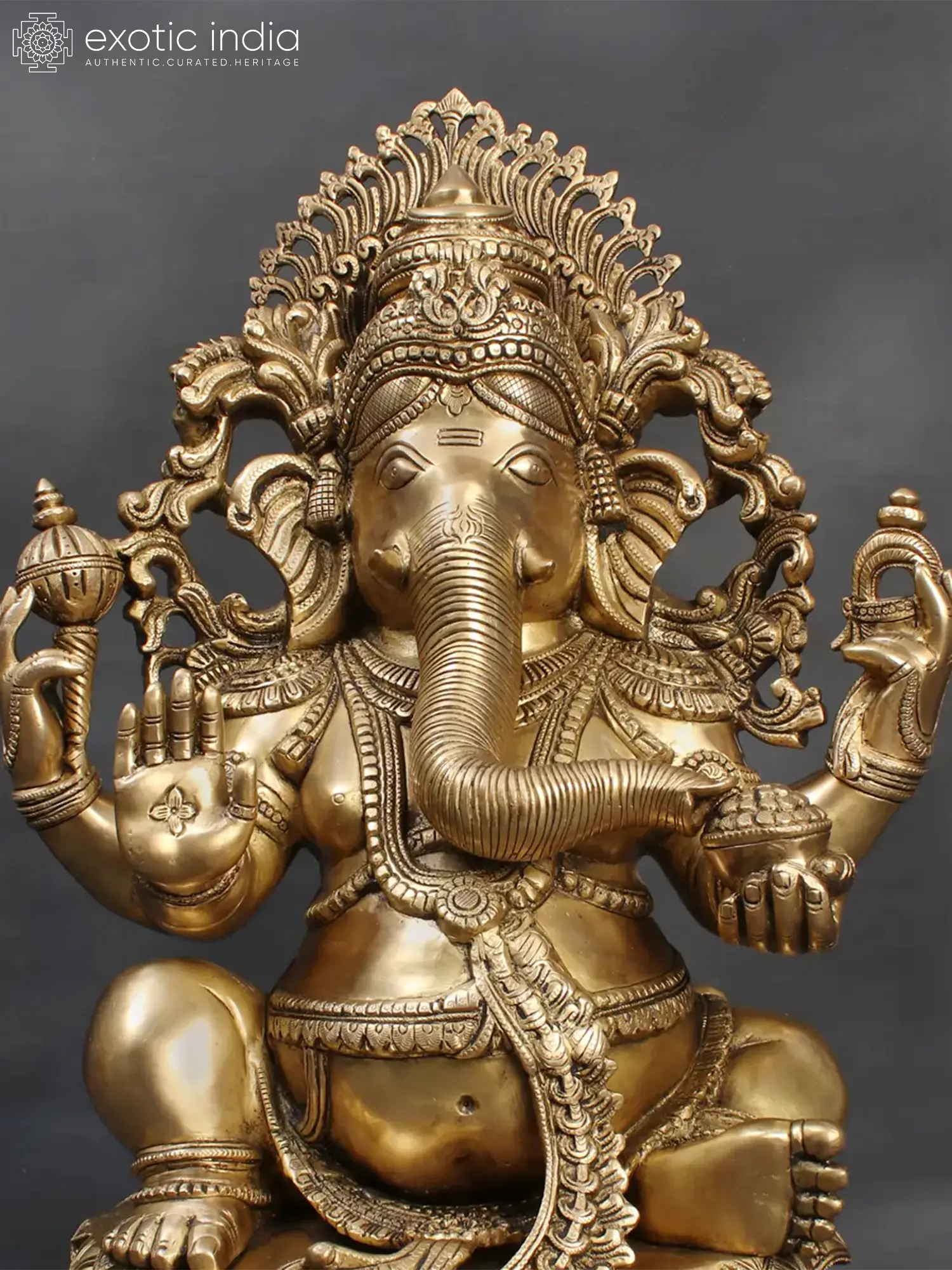 A magnificent icon of Sri Ganesha fashioned out of pure brass and instilled with the auspiciousness of all his sacred attributes, or Shubha Lakshana, is a source of divine energy and heavenliness in any home. This fine brass statue is sculpted majestically, giving an aesthetically rich form to the sacredness of Ganesha.