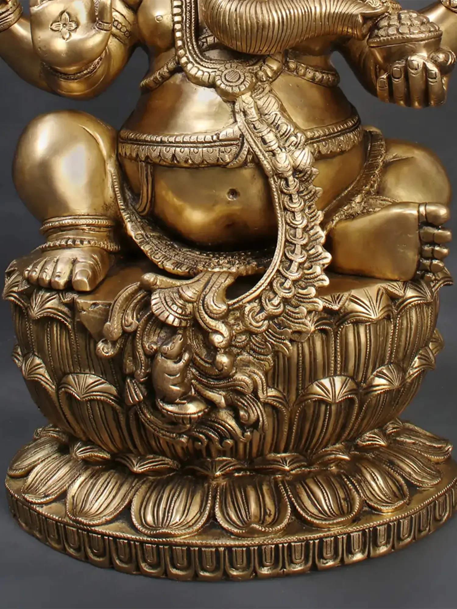 He sits on a lovely lotus seat, in the regal Maharajalilasna, wearing an ornate crown with floral motifs which symbolize propitiousness and fecundity. Intricately fashioned ornaments adorn the image of Ganesha, stationed in which Ganapati emanates an aura powerful enough to transform any home into a space of celestialness.