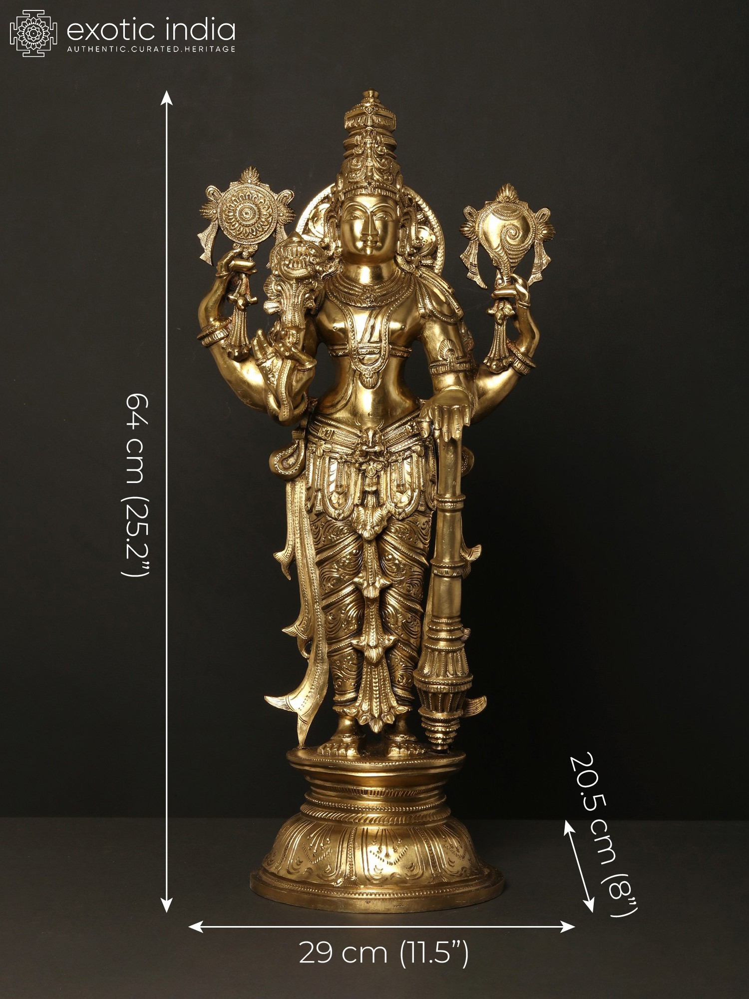 Polished and intricately sculpted in a balanced manner, Sri Vishnu has a beautiful form- a perfect face, broad shoulders embellished with regal jewelry, graceful waist, and sturdy legs wrapped in a stylistically decorated dhoti over which dangle the tassels of his Kirtimukha crested waist ornament.