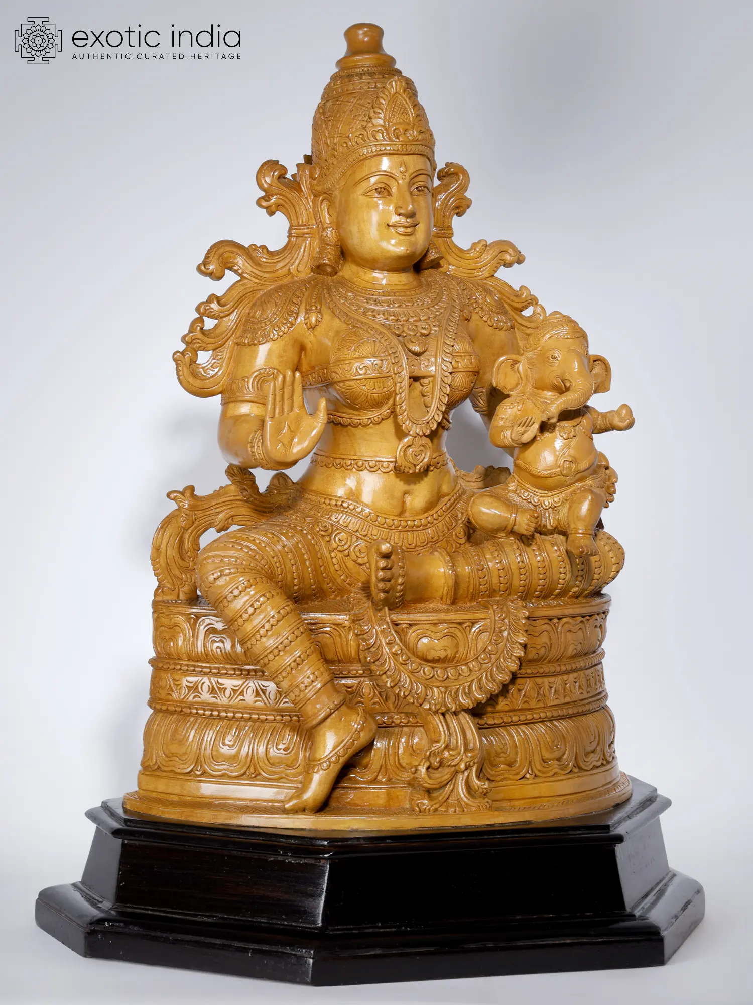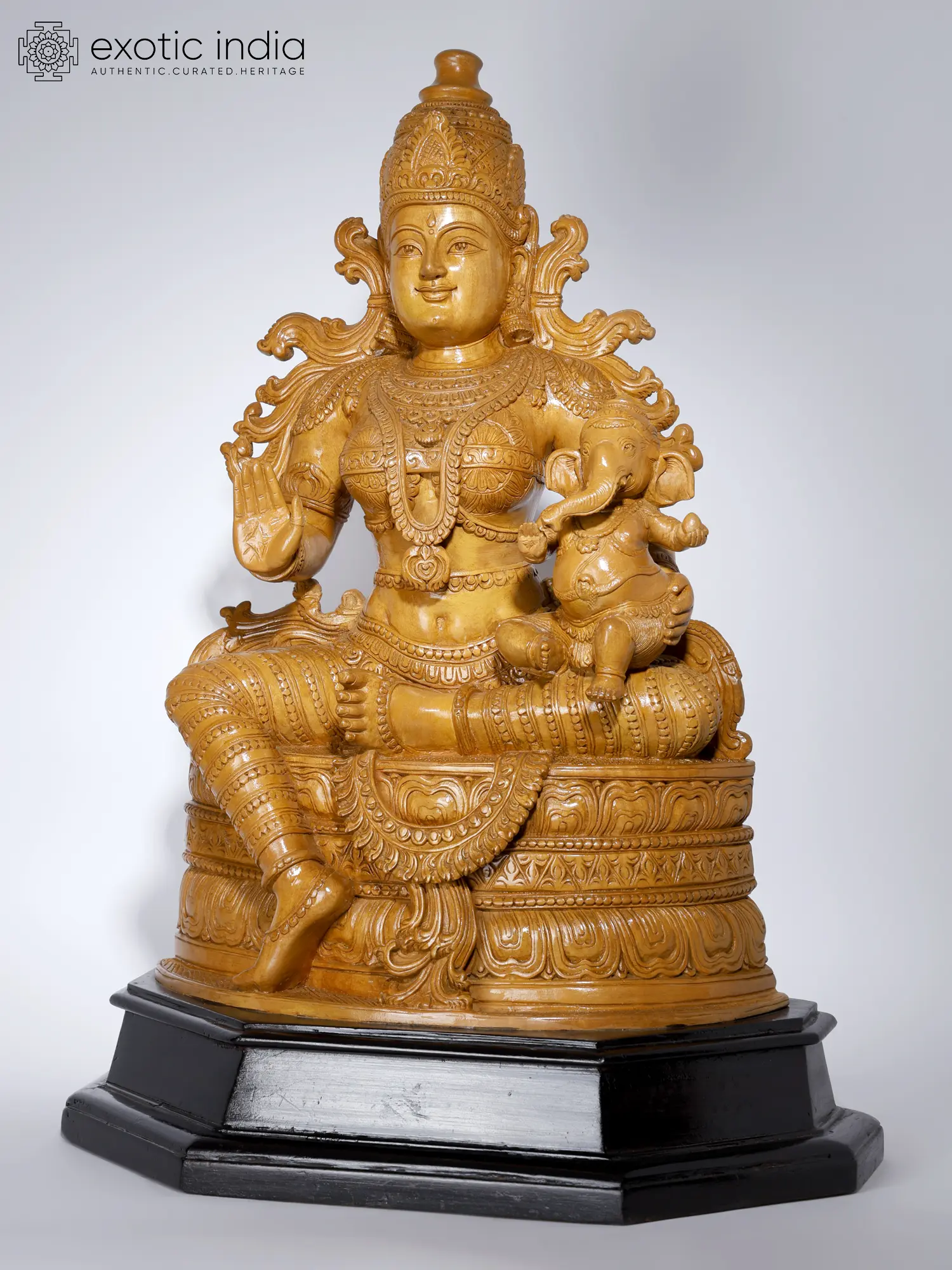 An image of maternal bliss, Maa Parvati, the mother of the Universe sits on an elaborate lotus throne in Lalitasana with Ganesha in her lap, smiling benevolently.