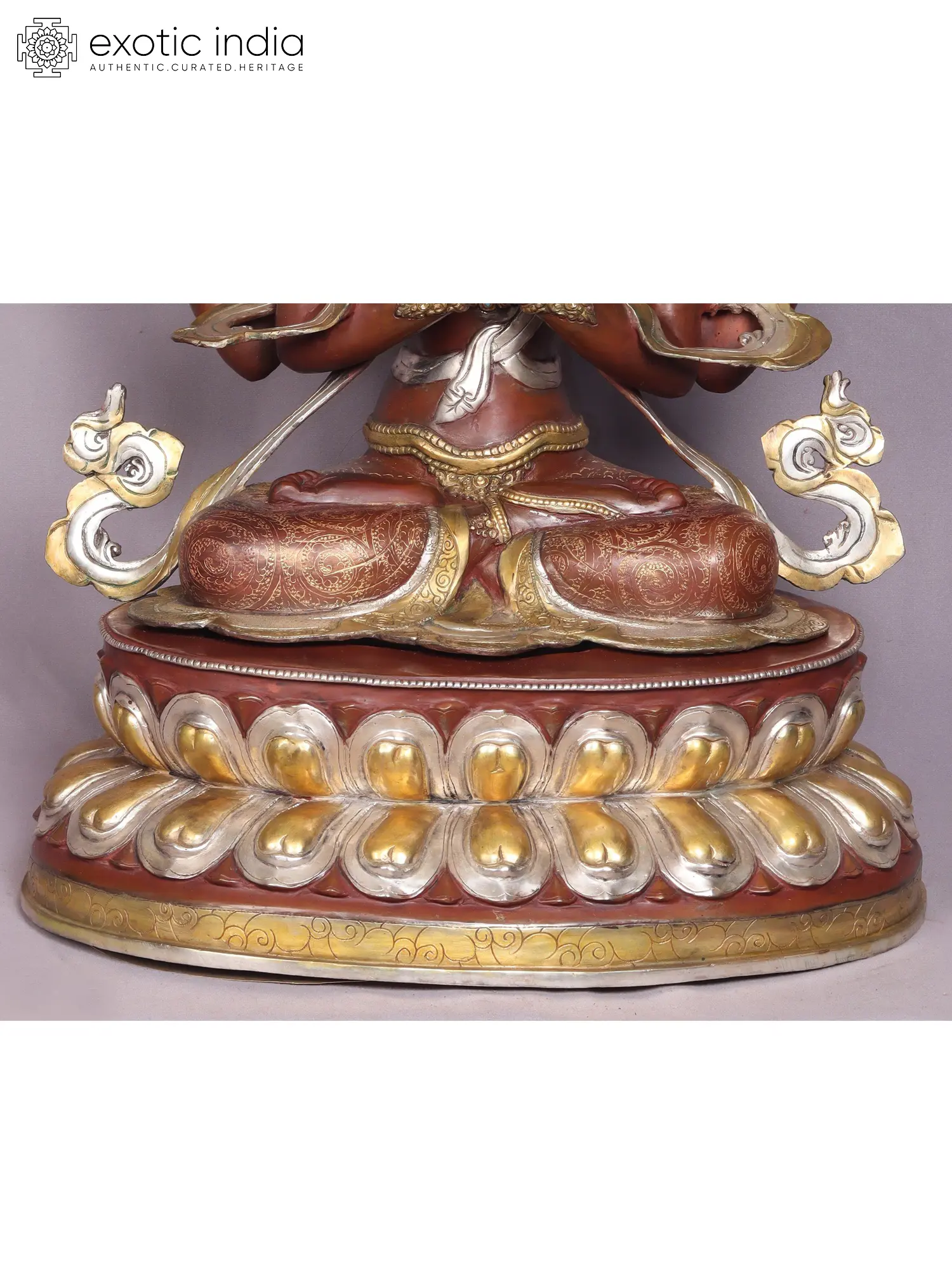 In one left hand, he gently cradles a lotus flower, and in the other right hand, he holds a crystal mala (rosary), employed to count repetitions of his mantra, "Om Mani Padme Hum," signifying liberation from suffering for all beings. Adorned in resplendent golden and silver silks and adorned with Bodhisattva ornaments, he embodies his exceptional qualities. Chenrezig's warm smile emanates profound understanding, love, and compassion, as his eyes gaze benevolently upon all beings. His four arms symbolize the four immeasurables: kindness, compassion, joy, and boundless equanimity.