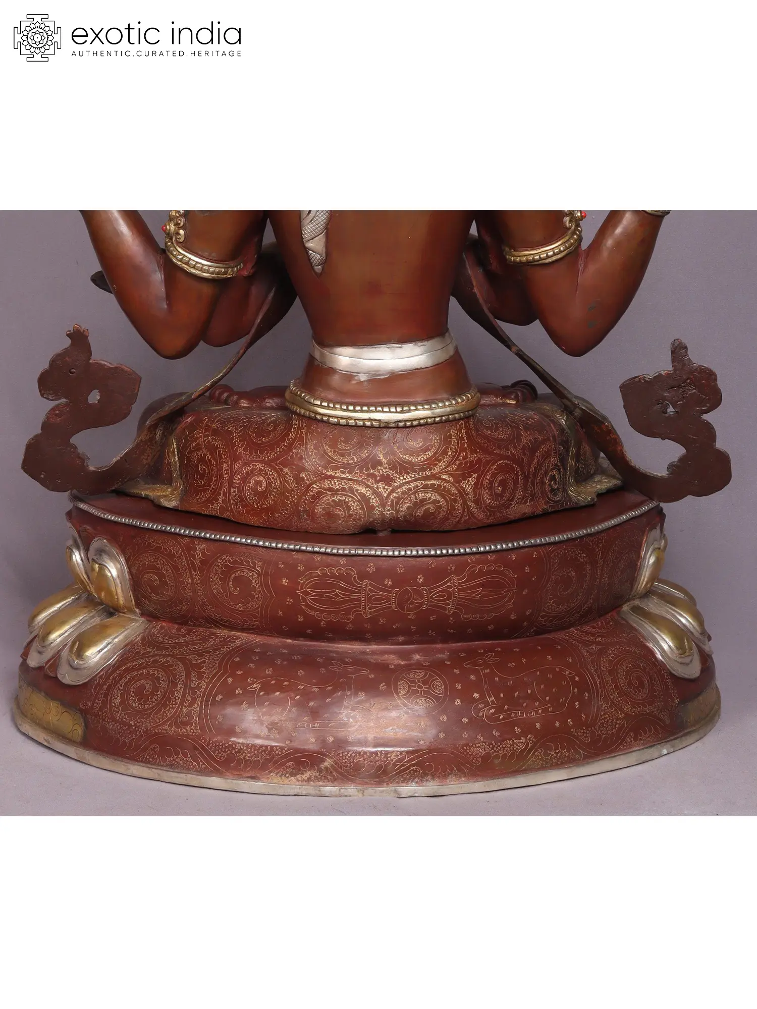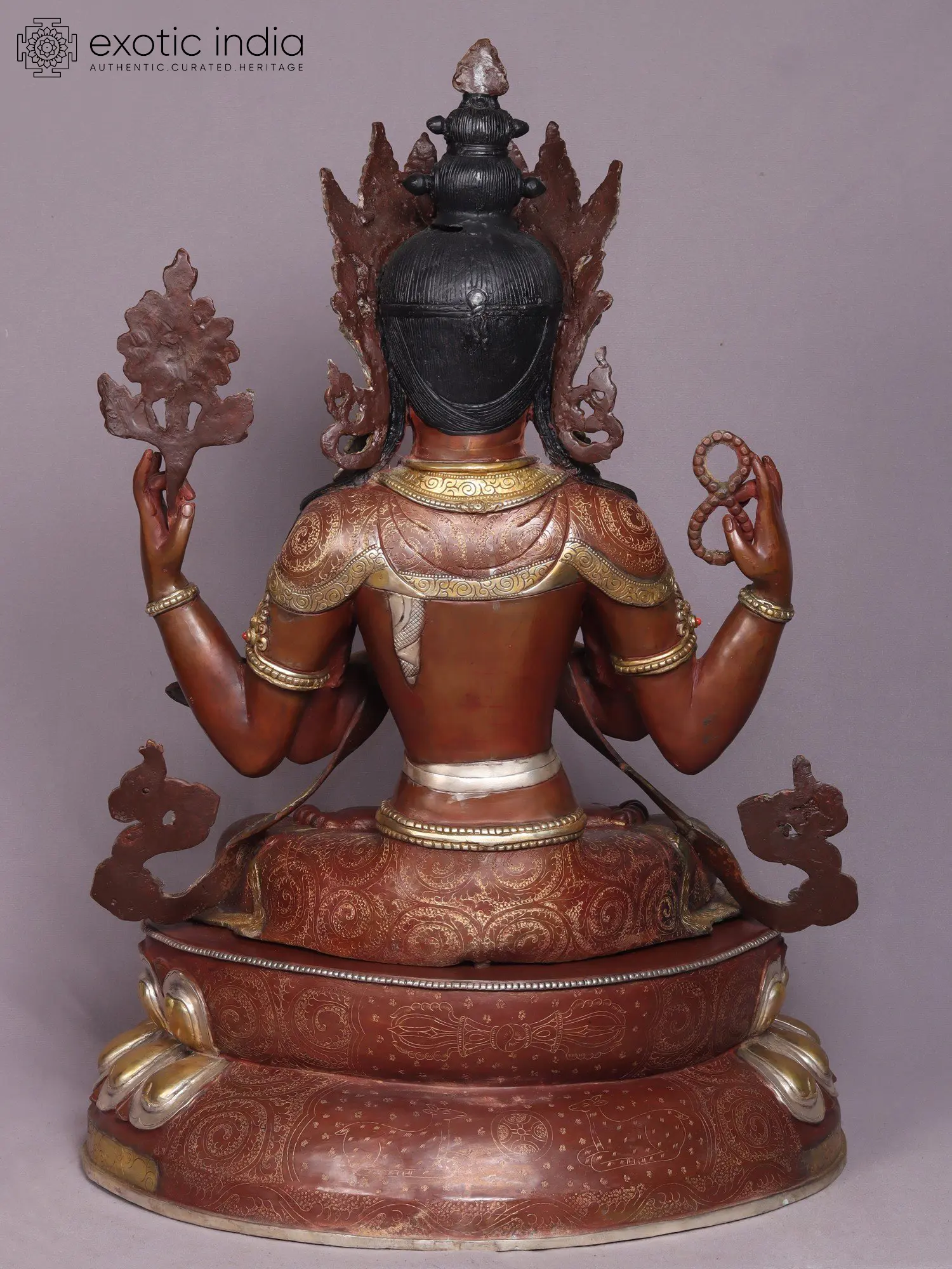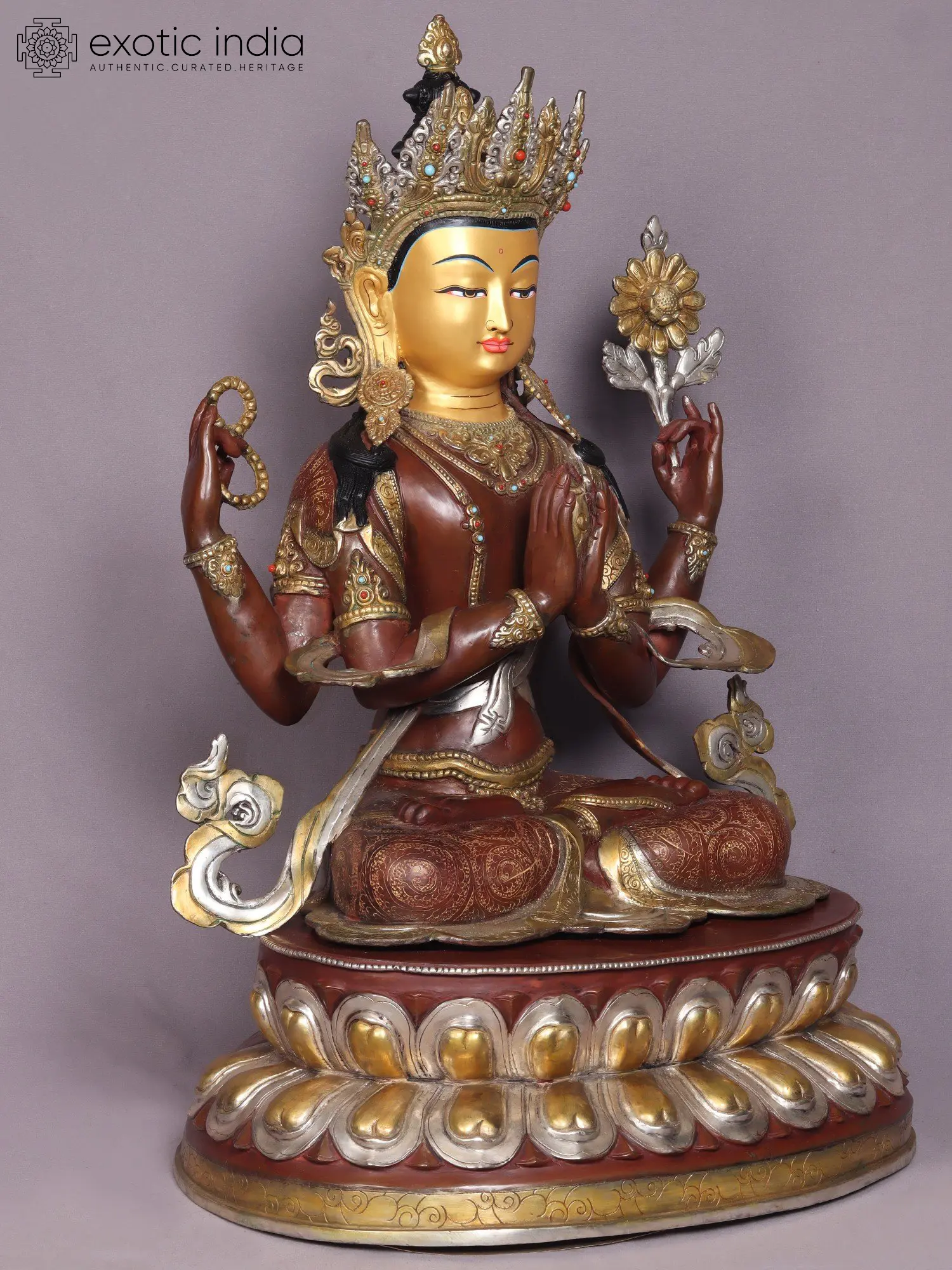 Chenrezig, also known as Kharchari in Tibetan. He is seated atop a lotus with the moon's flat disc beneath, symbolizing his absolute purity, he possesses four arms, two of which are conjoined in a prayerful gesture, holding the wish-fulfilling gem.