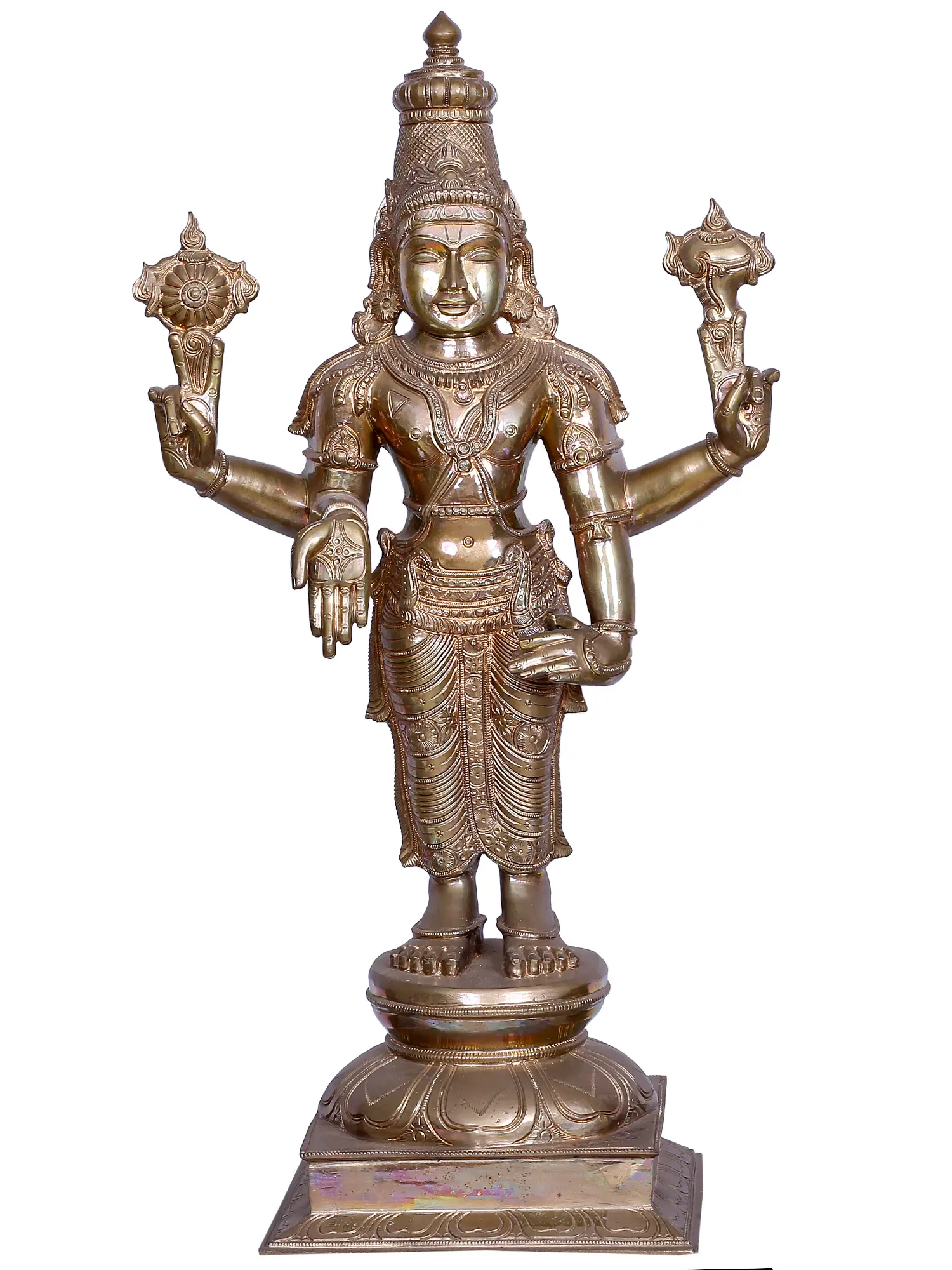 Lord Vishnu who is known as the preserver and sustainer of the universe is radiating divine splendour while standing on a lotus podium. He has been depicted with four hands, clutching a discus and a conch shell and his left hand is in “Varada Mudra” (Gesture of dispensing boons). His celestial consorts, Sridevi and Bhudevi, who are the epitome of beauty and elegance, flank him. Adorned with resplendent jewellery and a benevolent smile, Sridevi the goddess of wealth and prosperity is exuding opulence and abundance, carrying a lotus in her hand, symbolising purity. Radiating a divine aura, Bhudevi, the earth goddess epitomises nurturing and fertility, holding a vessel which contains healing herbs.