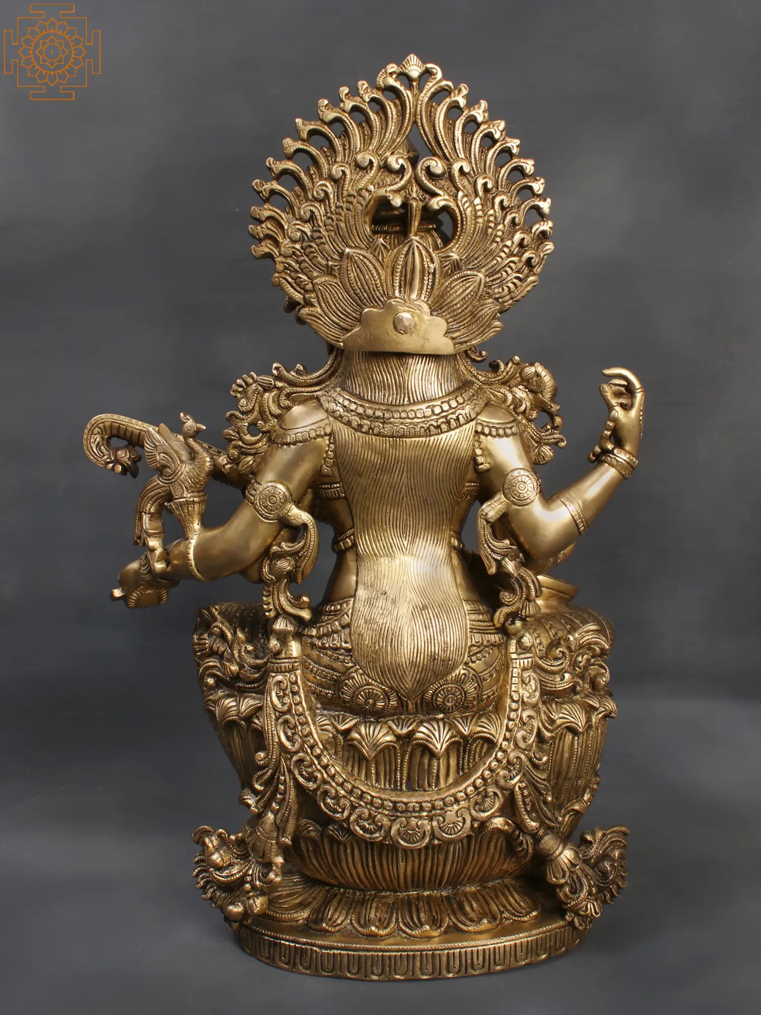 In these divine brass statues, the trinity is represented with a blissful aura. All three are enthroned on individual lotus seats, which are delicately depicted to mirror the fragrant blossoms in solid metal. Goddess Lakshmi and Saraswati are adorned with fine attire and jeweled ornaments and sit in Lalitasana, the posture of royal ease, while Ganesha is in Maharajalilasana, a variant of the regal pose. The sculptors have delineated the secondary elements such as the mounts of the deities and their ornamentation with a tasteful fineness, in these statues sculpted in a rounded manner, to perfectly envision the heavenliness of the divine, who seem to have made these icons their earthly abode.