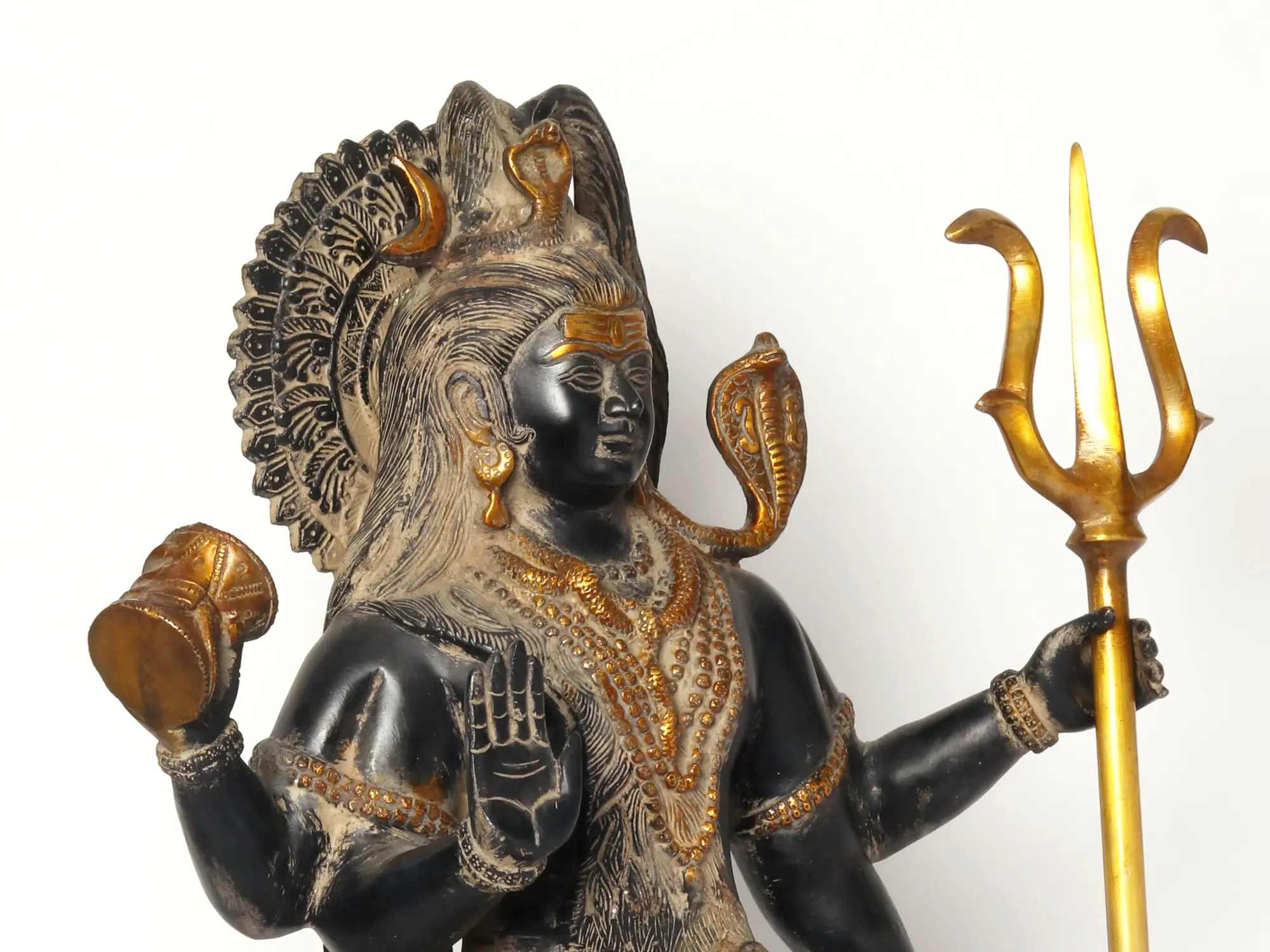 This magnificent brass statue captures Lord Shiva in his awe-inspiring four-armed form, radiating an aura of immense power and benevolent grace. Standing tall and imposing, this meticulously crafted piece is more than just a decorative item; it is a conduit to the divine, a symbol of cosmic balance, and a testament to the enduring artistry of Indian craftsmanship. Each detail, from the coiled serpent adorning his neck, a symbol of eternity and control over death, to the crescent moon gracing his matted locks, representing his mastery over time and the cyclical nature of existence, has been rendered with profound respect and exquisite skill. The Lord Shiva depicted here holds sacred objects that are integral to his iconography. In one hand, he displays the Damaru, a small two-headed drum whose sound is said to be the primal sound of creation, the vibration that emanates from the universe. In another, he holds the Trishul, his powerful trident, a weapon symbolizing the three aspects of consciousness – waking, dreaming, and deep sleep – and representing his power to destroy evil and ignorance. The presence of the Kamandalu, a water pot often carried by ascetics, signifies his renunciation and his role as the supreme ascetic. The divine cobra, Vasuki, coiled around his neck, is a potent reminder of his ability to overcome even the most venomous of poisons, both literal and metaphorical, including the venom of ego and attachment. The statue's four arms represent Shiva's multifaceted nature and his ability to engage in various cosmic activities simultaneously. He is the creator, the preserver, and the destroyer, the one who dances the Tandava, the cosmic dance that sustains and regenerates the universe. His raised hand in a gesture of Abhaya Mudra offers solace and protection, assuring devotees of his unwavering support and blessings. Crafted from high-quality brass, this statue boasts a rich, deep patina that speaks of its enduring quality and traditional make. The contrasting gold accents on the ornaments, the skirt, and the base further enhance its visual appeal, drawing the eye to the intricate details and lending a regal splendor to the divine form. The base upon which he stands, adorned with ornate patterns, provides a stable and majestic platform for this powerful representation of the Mahadeva. This statue is an ideal addition to any home, temple, or sacred space, inviting peace, spiritual strength, and divine protection. It serves as a constant reminder of the profound philosophical concepts embodied by Lord Shiva – the transcendence of duality, the acceptance of impermanence, and the ultimate power of consciousness. Bringing this statue into your life is to welcome a powerful spiritual presence, an embodiment of strength, wisdom, and boundless compassion. ––––––––––––––––––