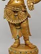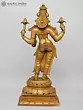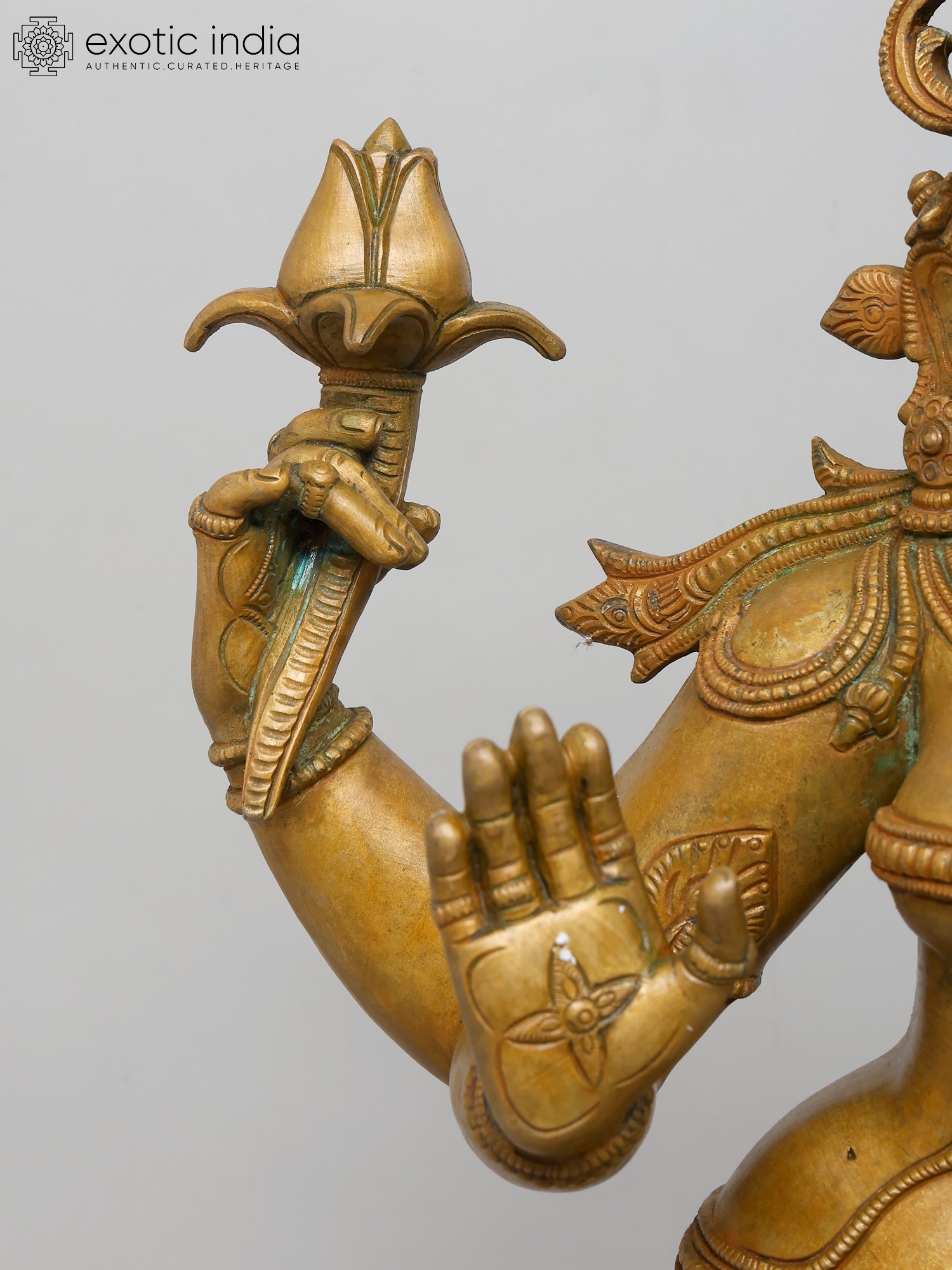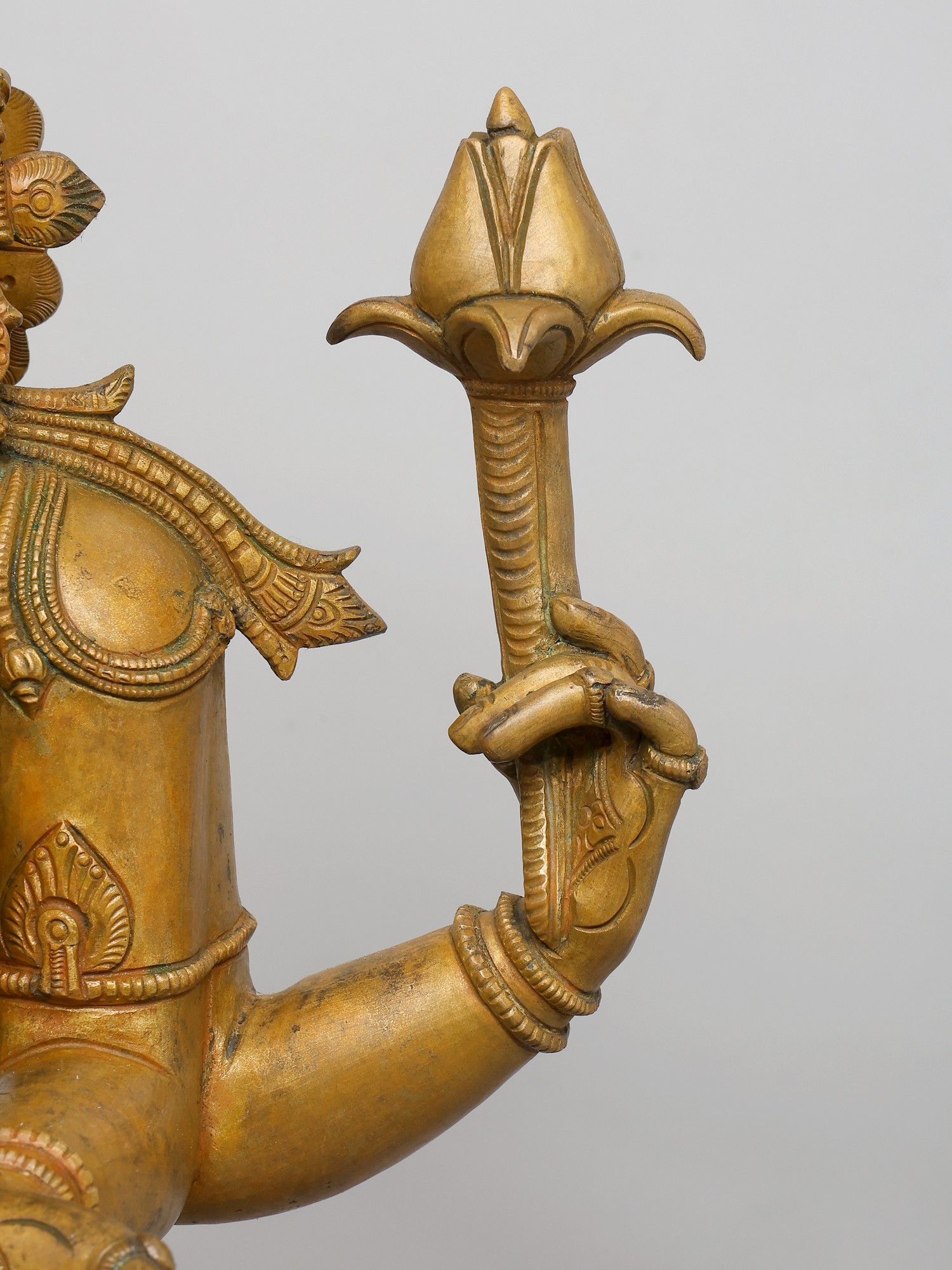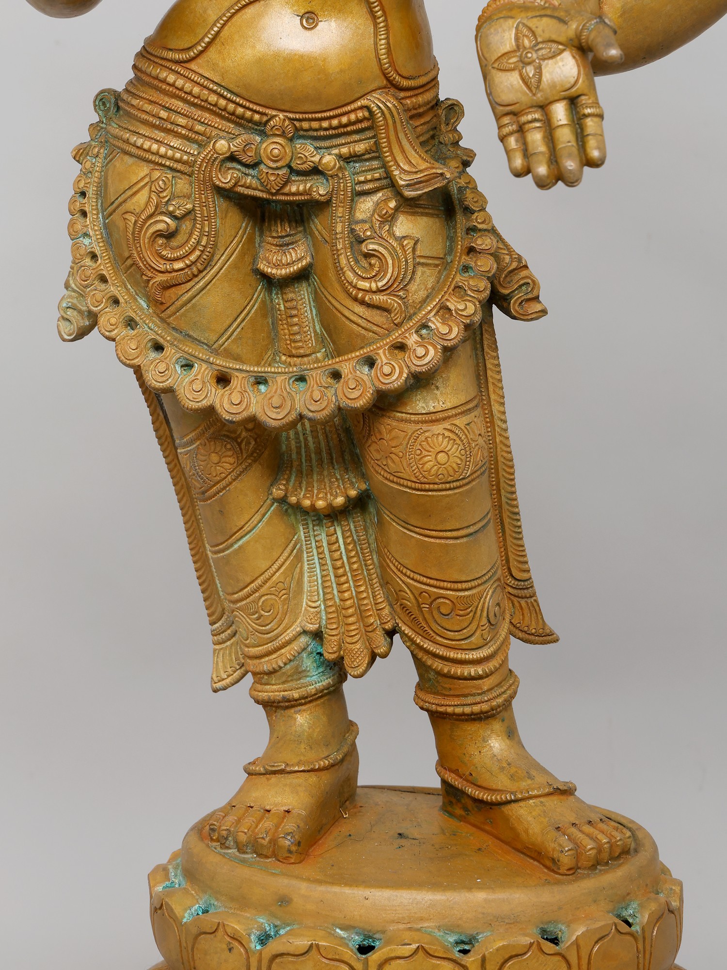 This statue is a masterpiece of the Panchaloha bronze casting technique, an ancient Indian art form that uses a unique alloy of five metals: gold, silver, copper, tin, and iron. This alloy is believed to possess divine properties and is used for crafting idols of deities. The intricate details of the ornamentation, the delicate folds of her garments, and the serene countenance of the Goddess are all rendered with remarkable precision and skill. Each element of the sculpture, from the elaborate headdress to the finely etched jewelry, speaks of a profound understanding of divine aesthetics and spiritual symbolism. The patina that develops on the bronze over time adds to its character and beauty, imbuing it with a sense of history and reverence. This standing form of Lakshmi, with her arms gracefully extended, is a powerful representation of her boundless generosity and her constant readiness to shower her devotees with her divine blessings, making it a truly remarkable piece for spiritual and aesthetic appreciation.