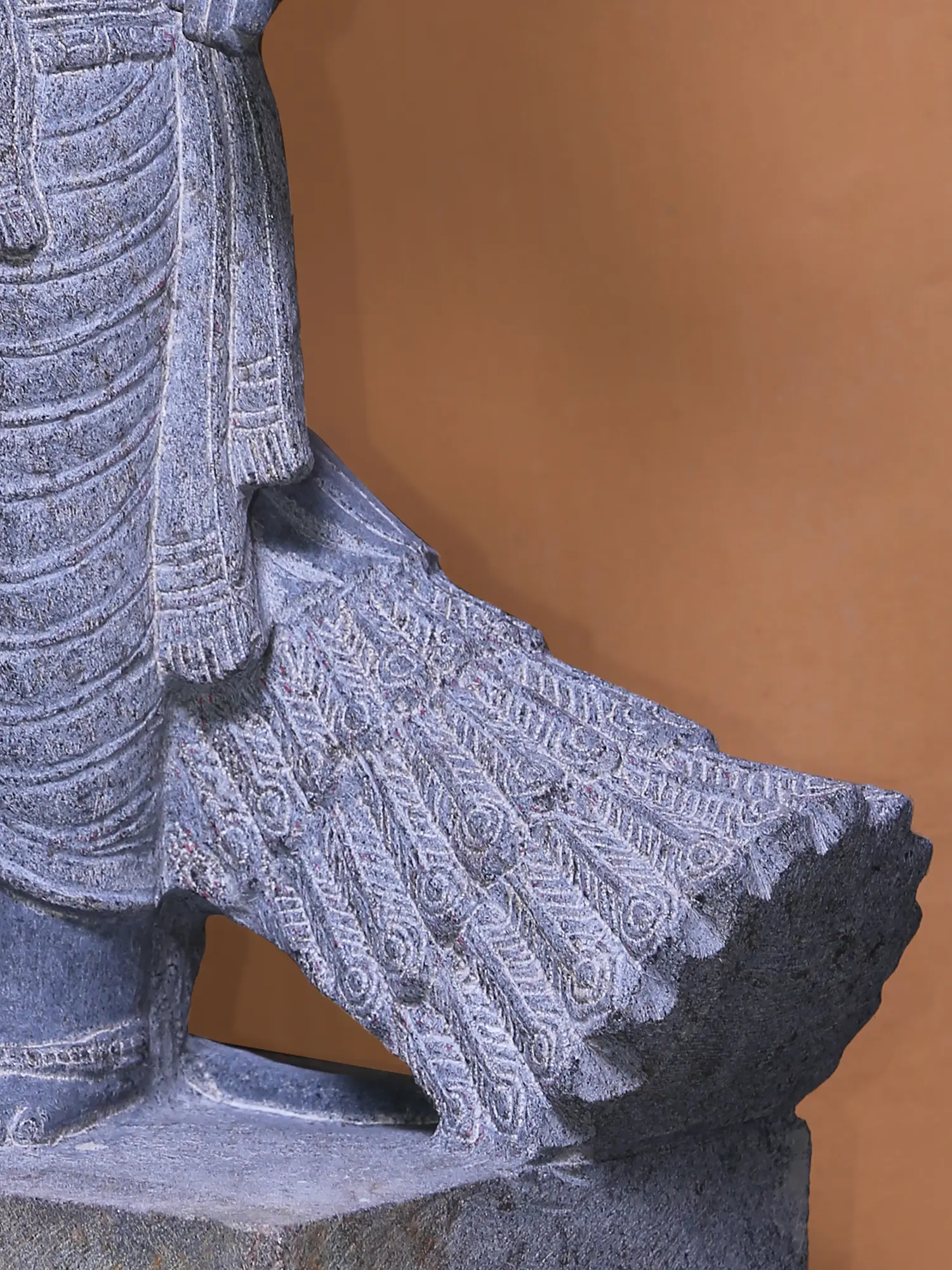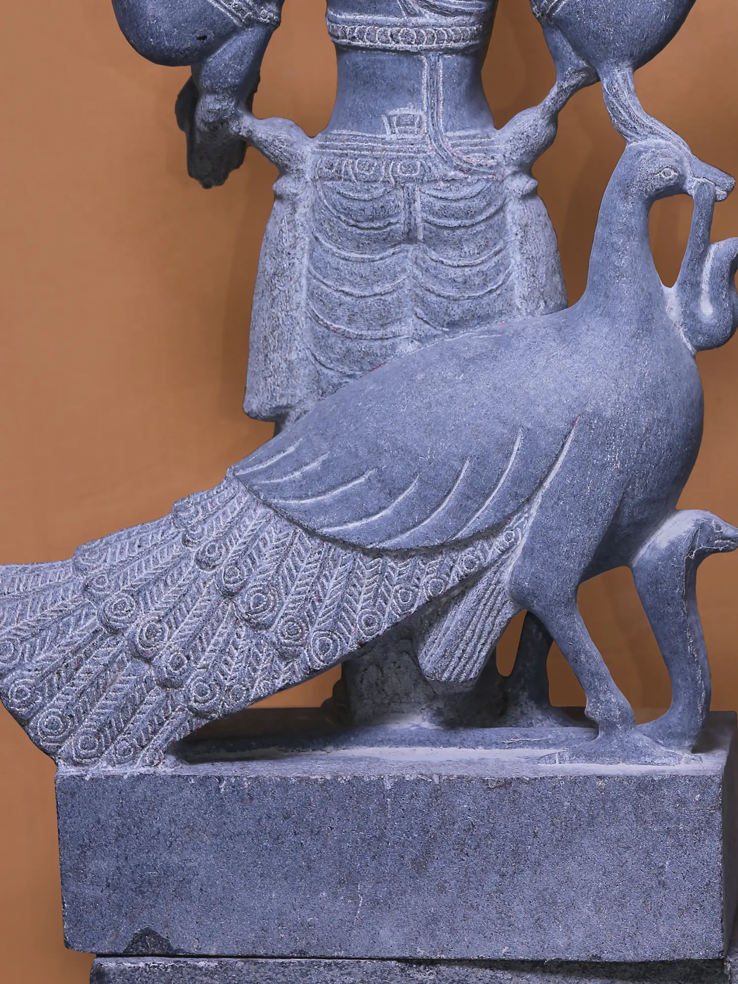 The stance of Murugan's mount, the Mayura, reflects a beautiful fierceness. As a symbol of the wrath and power of Murugan, the Mayura appears alert and swift in annihilating the serpents, its arch enemies.