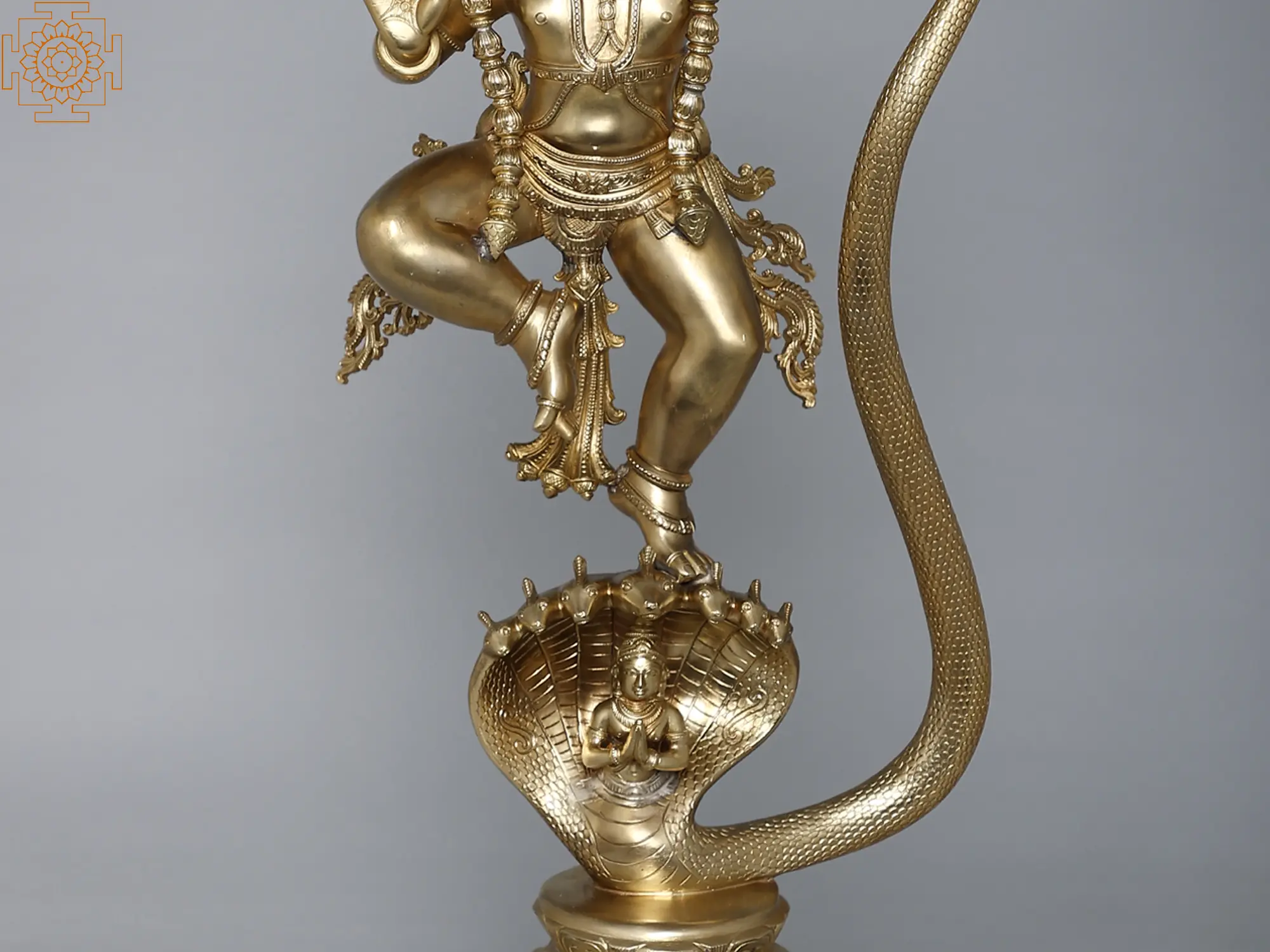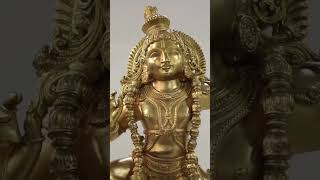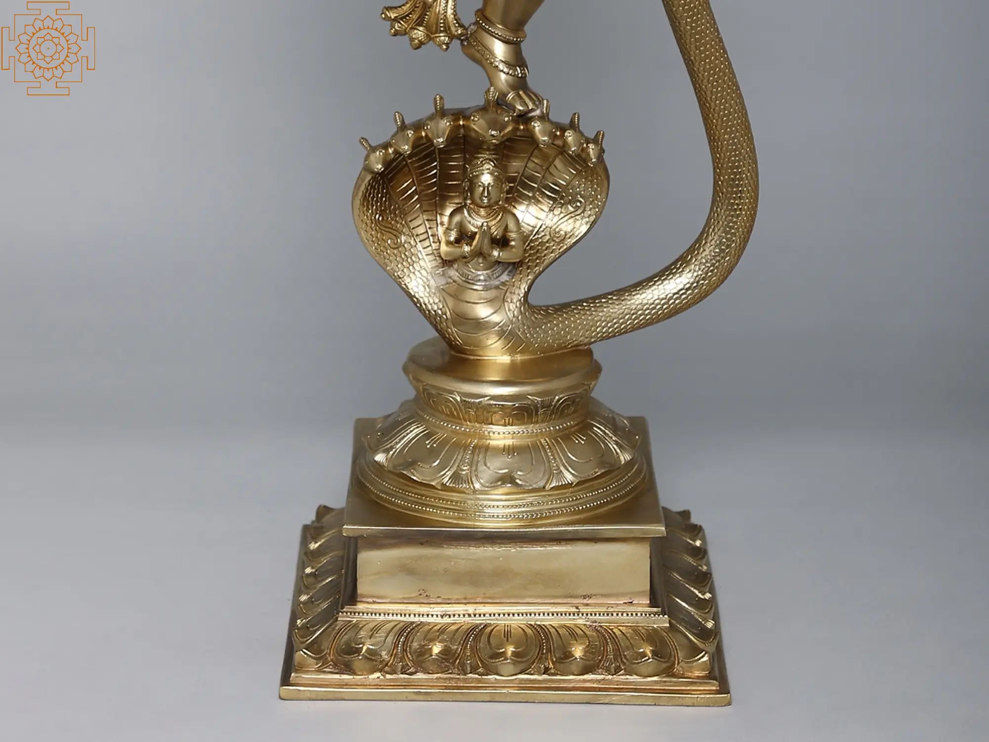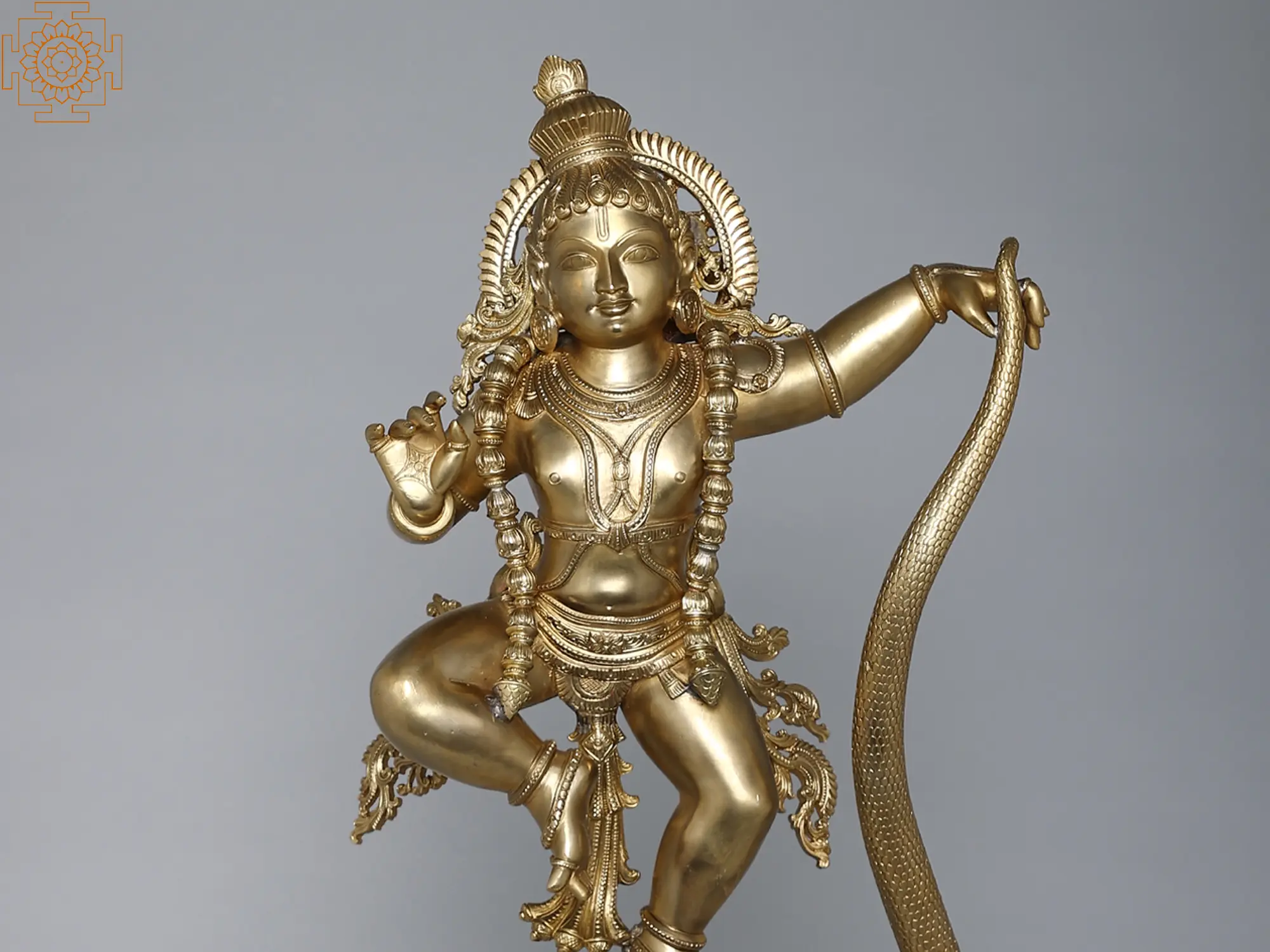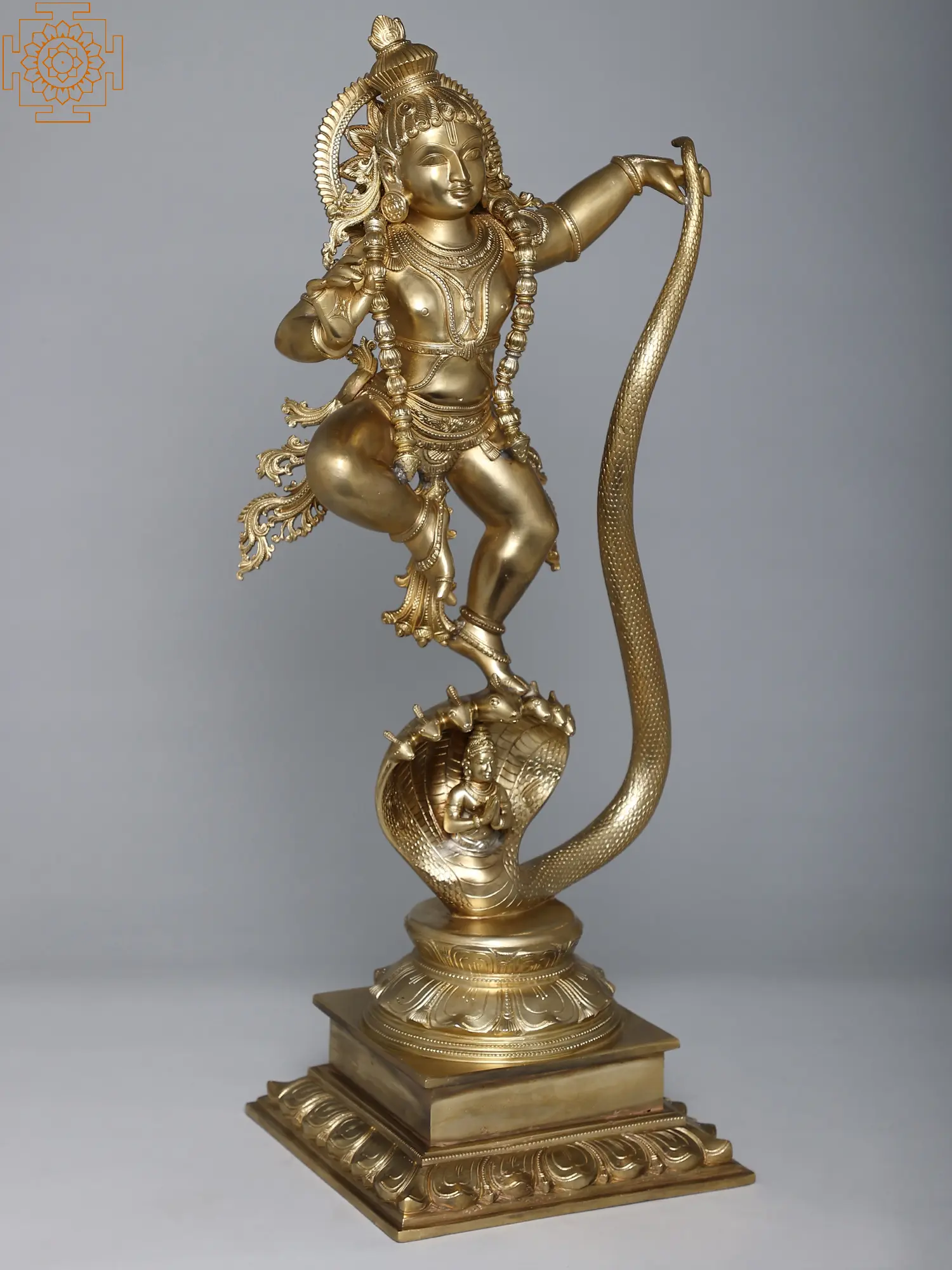 In this exquisite bronze sculpture, Lord Krishna stands fiercely on the serpent, Kaliya Naag. This artistic masterpiece portrays the iconic scene of Kaaliya Daman, where Krishna subdues the venomous serpent to prevent him from poisoning the river Yamuna. With divine grace and unwavering strength, Krishna fearlessly stands atop the serpent's fins, symbolizing the triumph of good over evil. The intricate details capture the essence of this legendary event, showcasing Lord Krishna's valor and compassion. From the flowing robes adorned with peacock feathers to the intricate expression on his face, every element embodies the significance of this divine encounter and the ultimate potential of Lord Krishna.