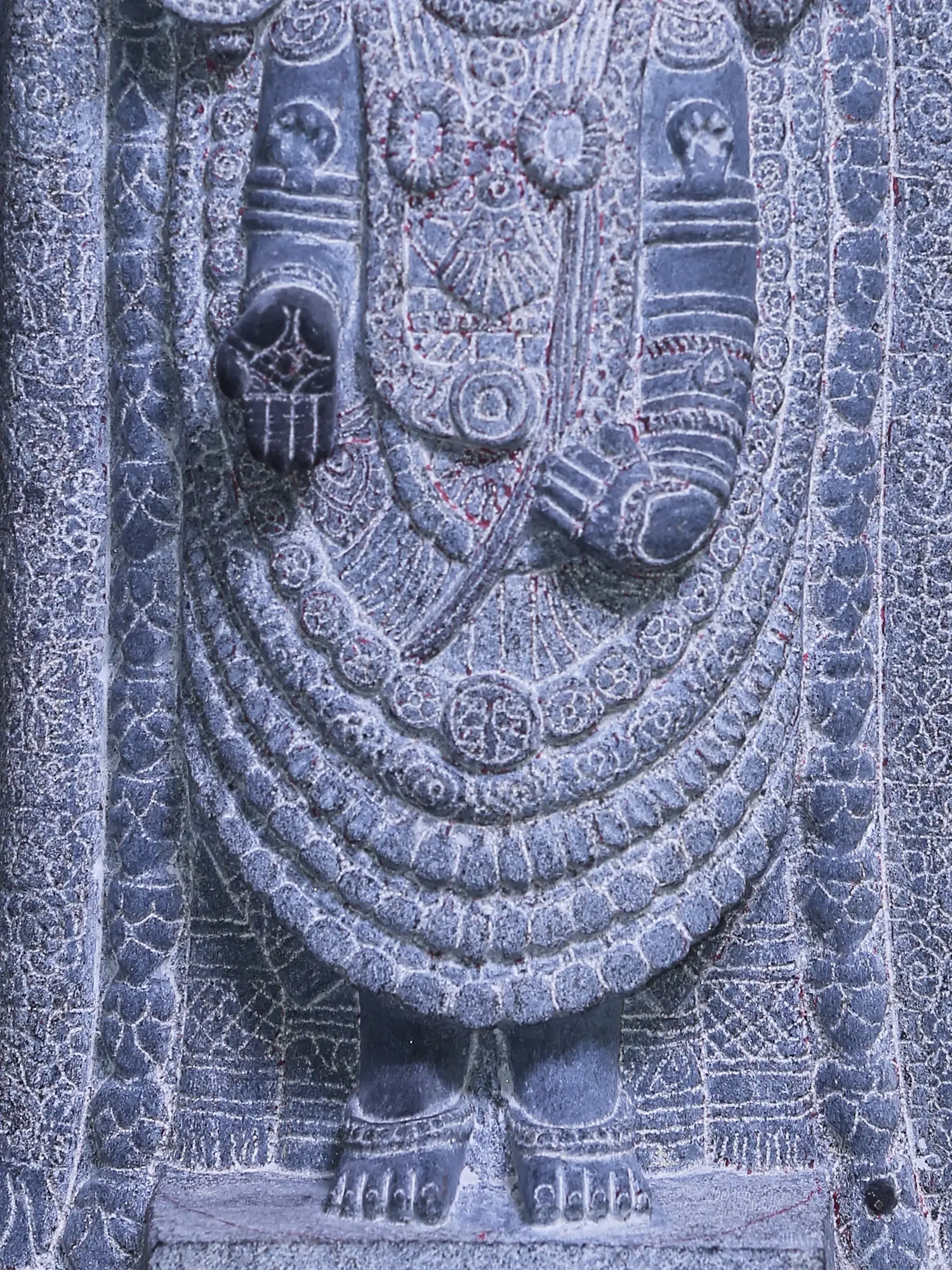 The ornateness of Balaji’s Sringaar or ornamentation has been beautifully captured in the stone artwork- layers of floral garlands and their supple sways are delicately etched, and the thickness of the original gold jewelry of Tirupati exquisitely delineated.