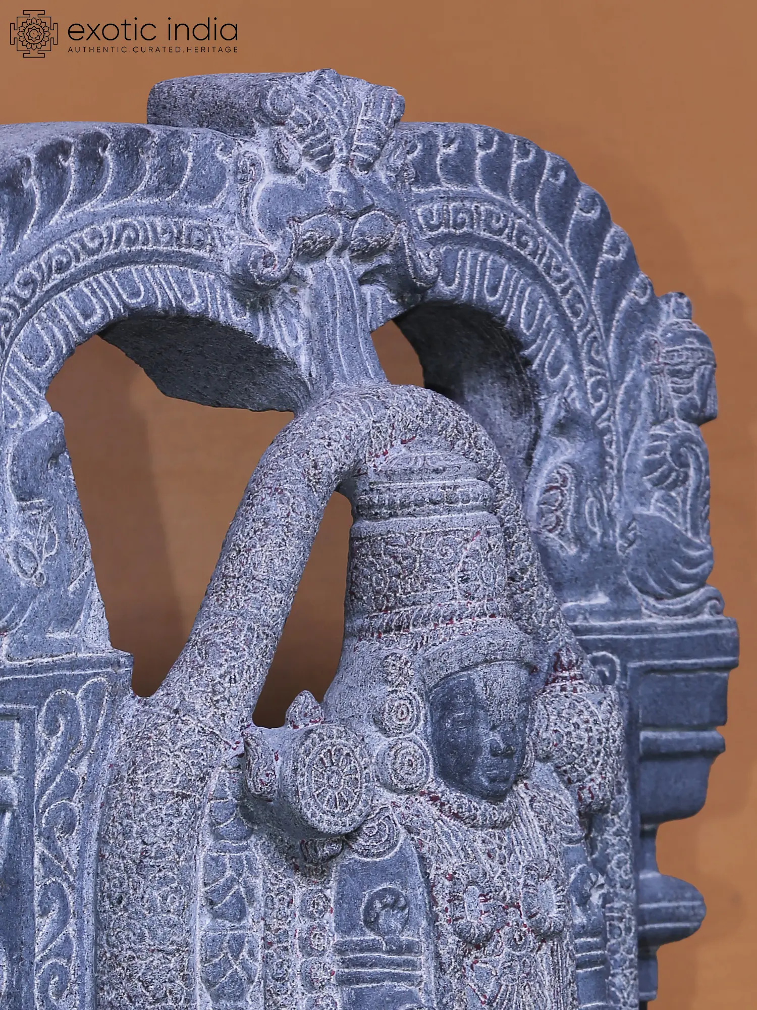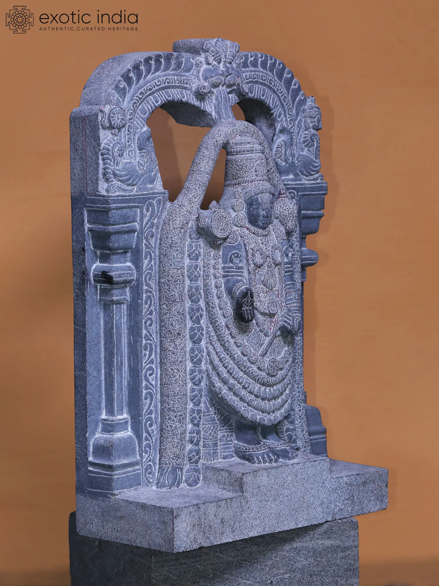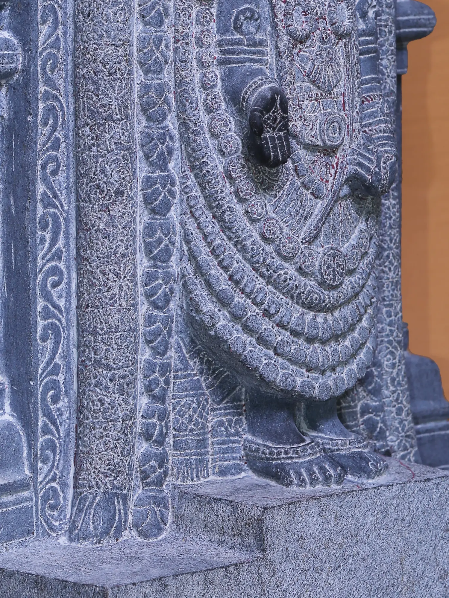 The grandeur of Tirupati Balaji’s sanctum has been transported into the hard granite stone by the artist, creating a timeless icon of Sri Venkateshwara for the devotees.