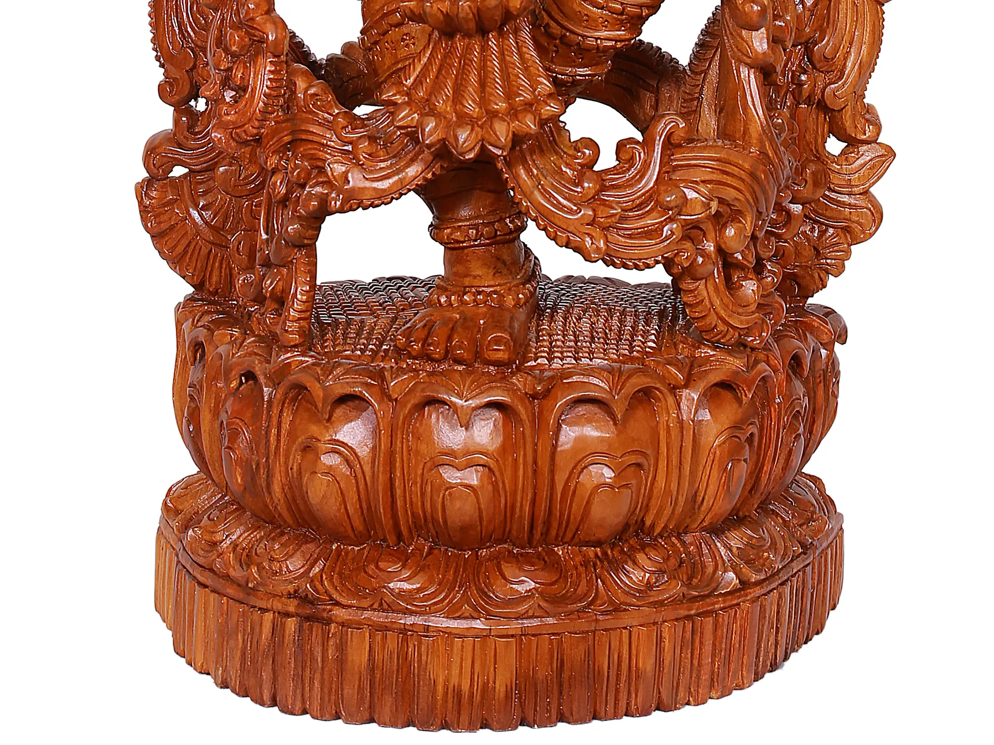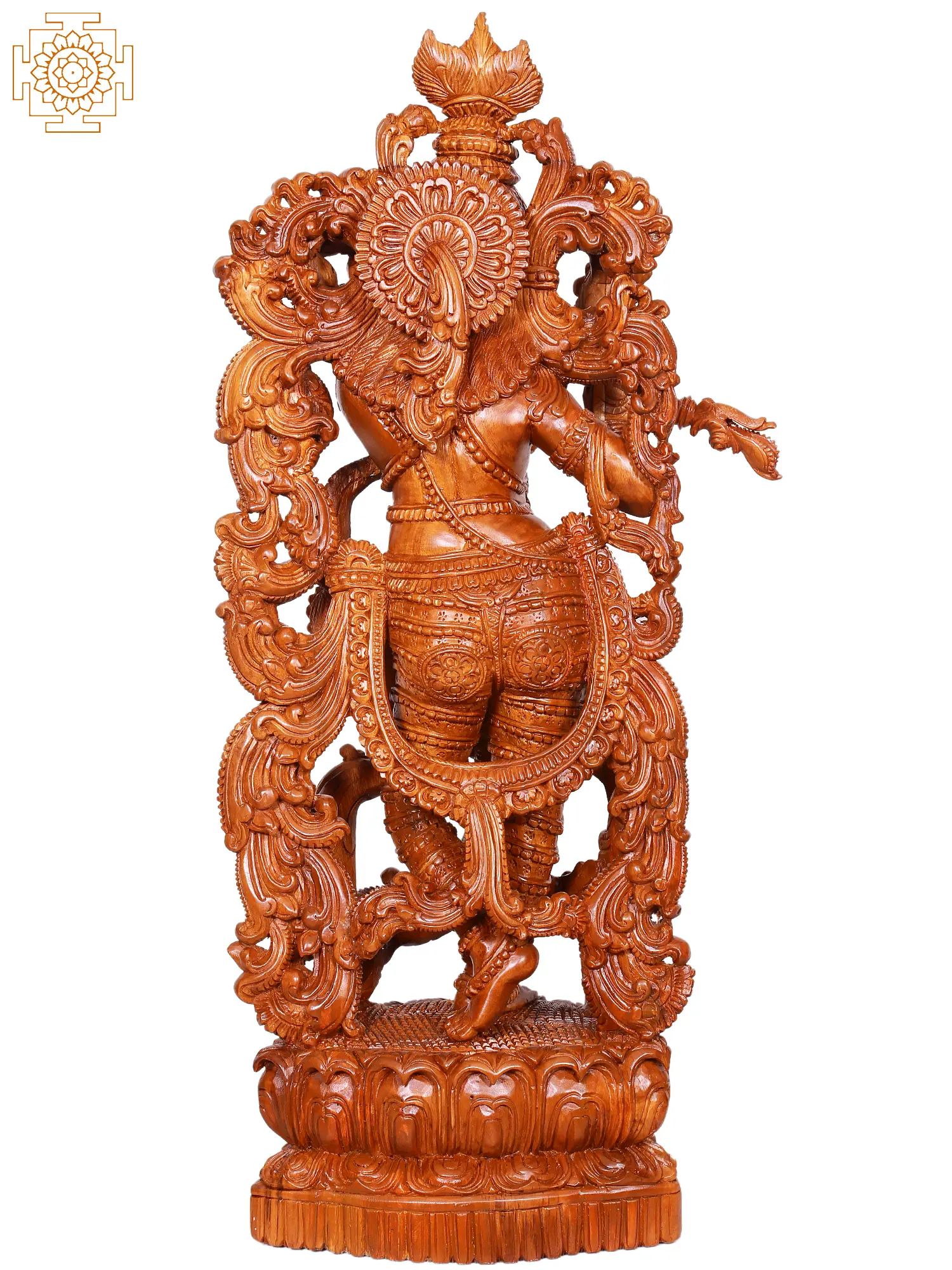 Invite the divine presence of Lord Krishna into your home with this exquisitely carved wooden statue. Standing tall and majestic, this masterpiece captures the essence of the beloved deity in his iconic form, gracefully playing the flute. The intricate details, from the delicate folds of his attire to the serene expression on his face, speak volumes of the artisan's skill and devotion. Crafted from premium teak wood, this statue is not merely a decorative piece but a conduit to spiritual tranquility and divine grace. The flute, an instrument intimately associated with Krishna, is depicted with remarkable realism, poised as if about to release a celestial melody. In Hindu mythology, Krishna's flute-playing is legendary. It is said that when he plays, the entire creation is captivated – cows abandon their grazing, trees bend in reverence, and the Gopis, the milkmaids of Vrindavan, are drawn to him with an irresistible pull of love and devotion. This statue embodies that enchanting power, promising to infuse your surroundings with peace, joy, and a sense of divine harmony.