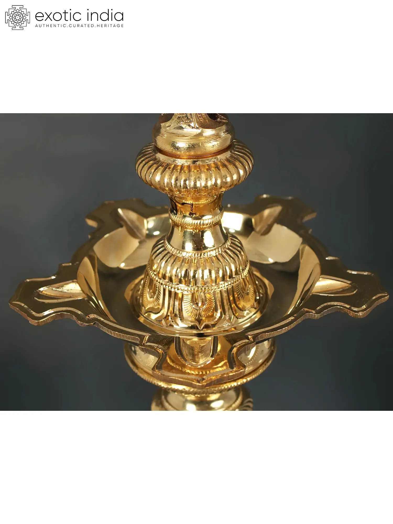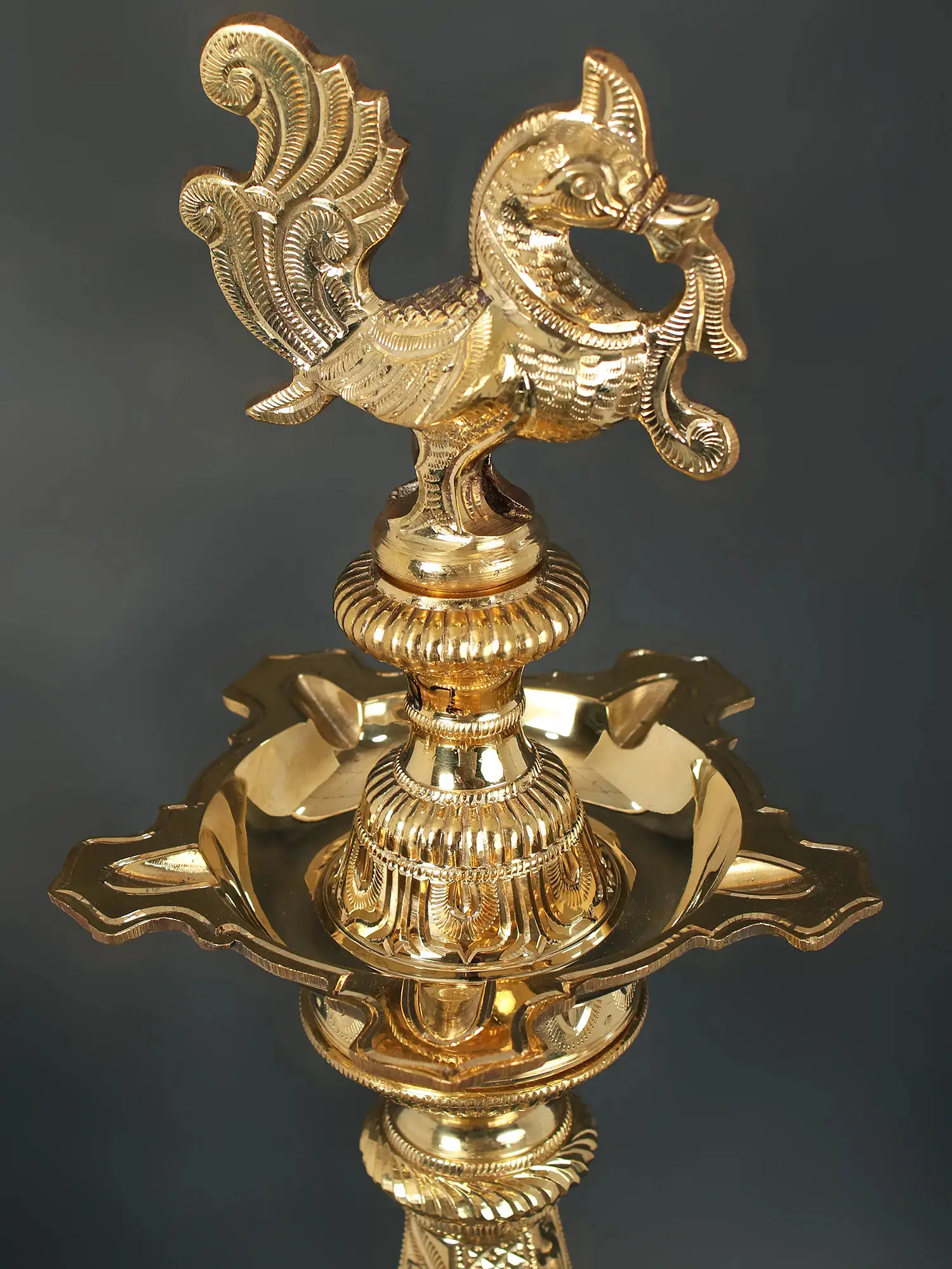 Thattu Vilakku, or tiered lights, have a long history in Kerala. These lamps are also known as Deepastambham or Mandapa Vilakku. The body of this brass peacock lamp with the classic pattern of a Thattu Vilakku is intricately designed. It is composed of four layers: a "Keezhbagam" (base plate), a "kandam" (pivotal pillar), a "Thanguli" (a bowl with many grooves for holding wicks and oil for lighting), and a "Prabhai" (crown) on top. Each Thattu vilakku has a unique crown, such as an annapakshi (Swan), a peacock, a cross, a lion, a tiger, a plain nilavilaku crown, a sitting nandhi, garuda, or a Pavai.