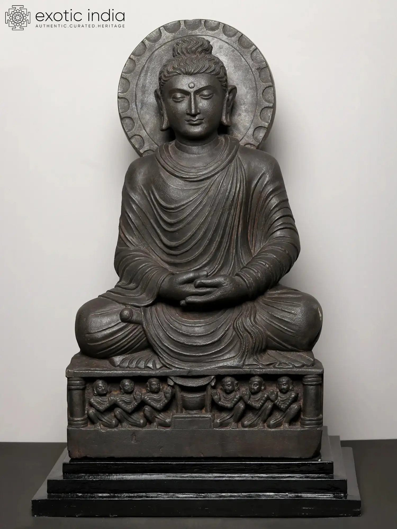 This statue is made out of purely handcrafted Black Stone that shines with a silver luster, giving a vintage yet innovative look to the statue. Encapsulating Buddha's robes in a plain yet alluring way, this statue serves as the perfect depiction of Buddha in deep meditation, with the valuable black stone giving the statue a sturdy and solid appearance.