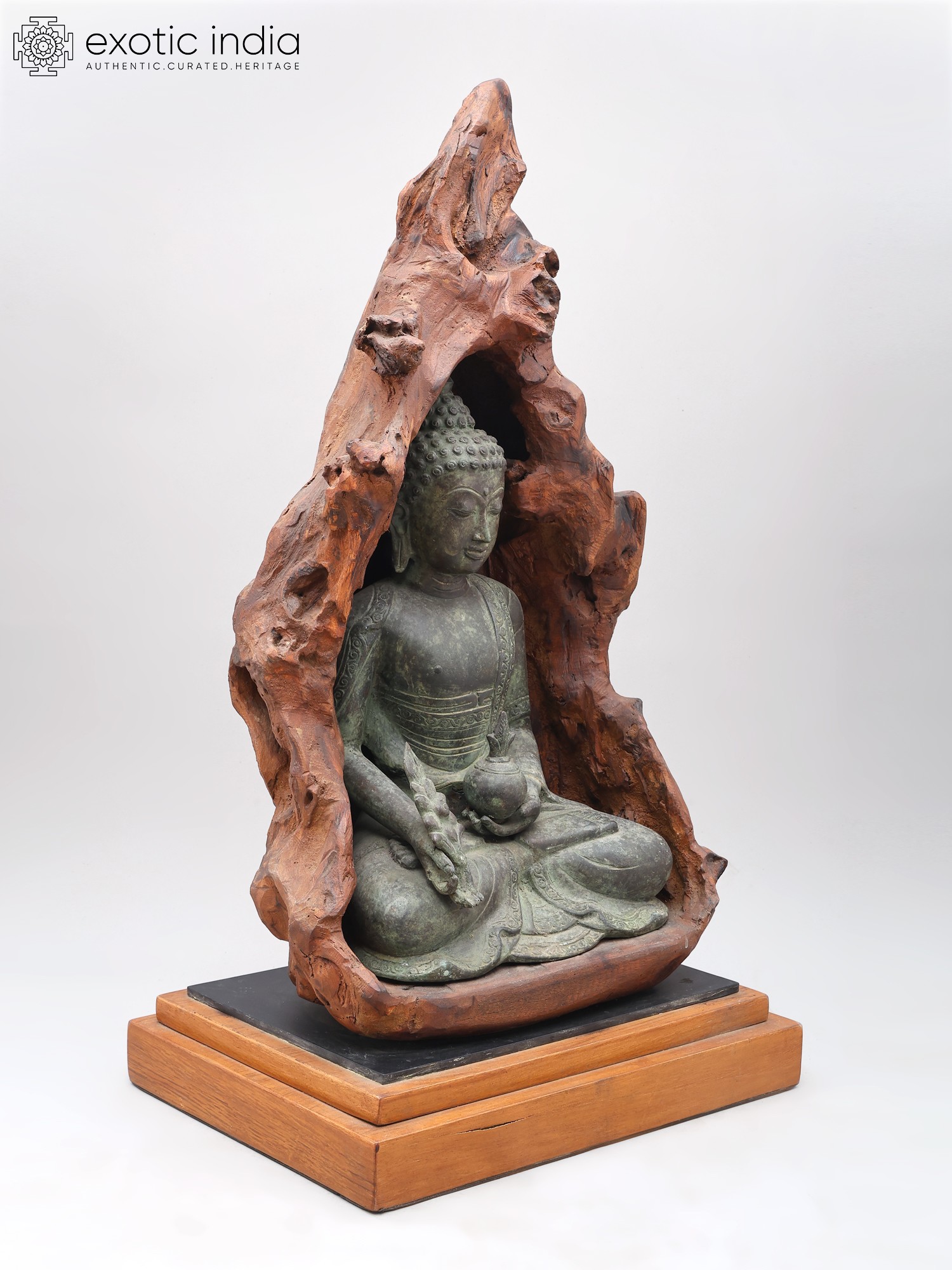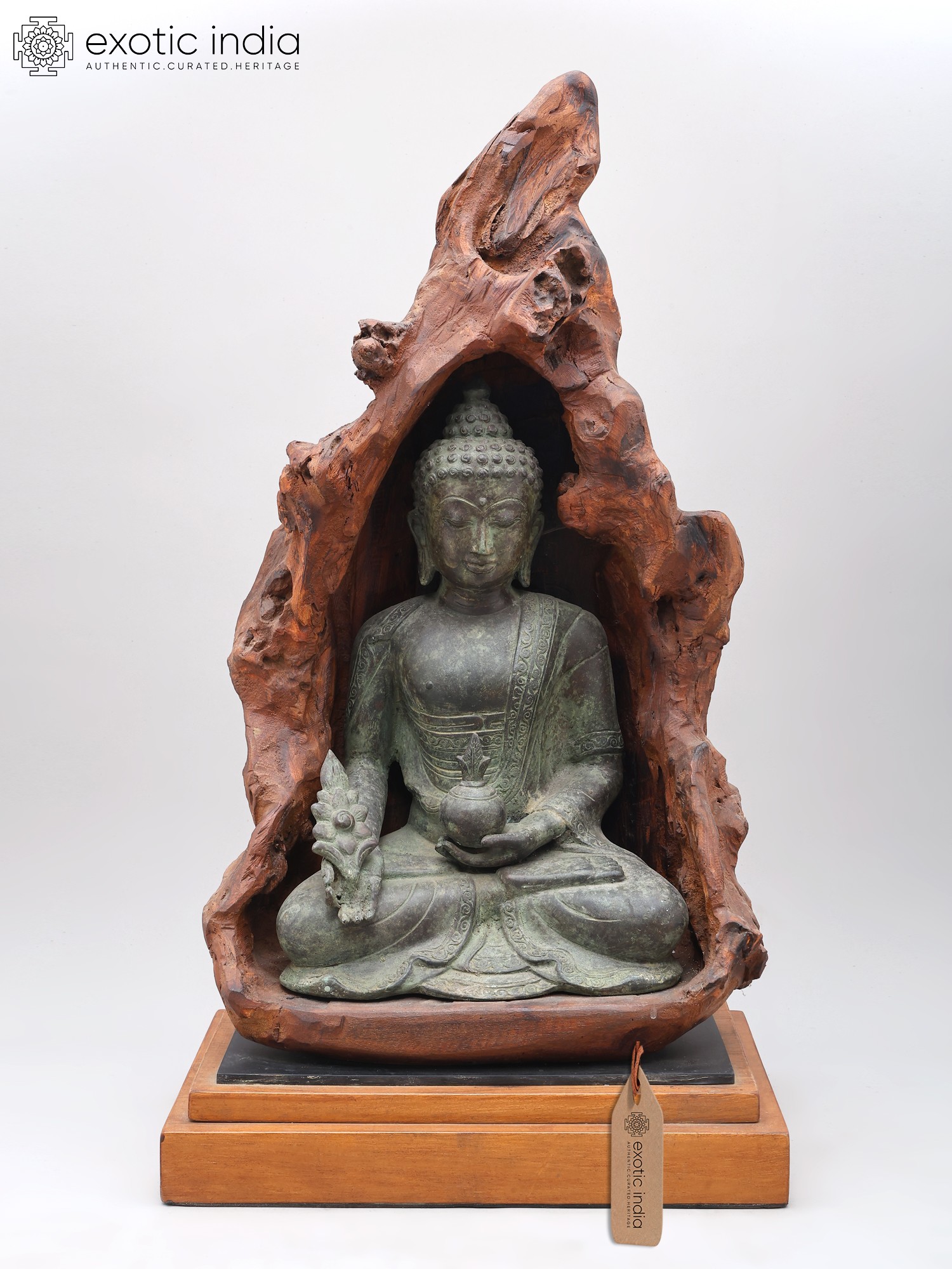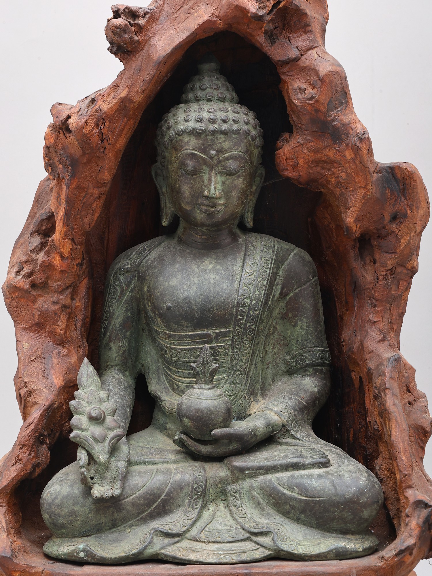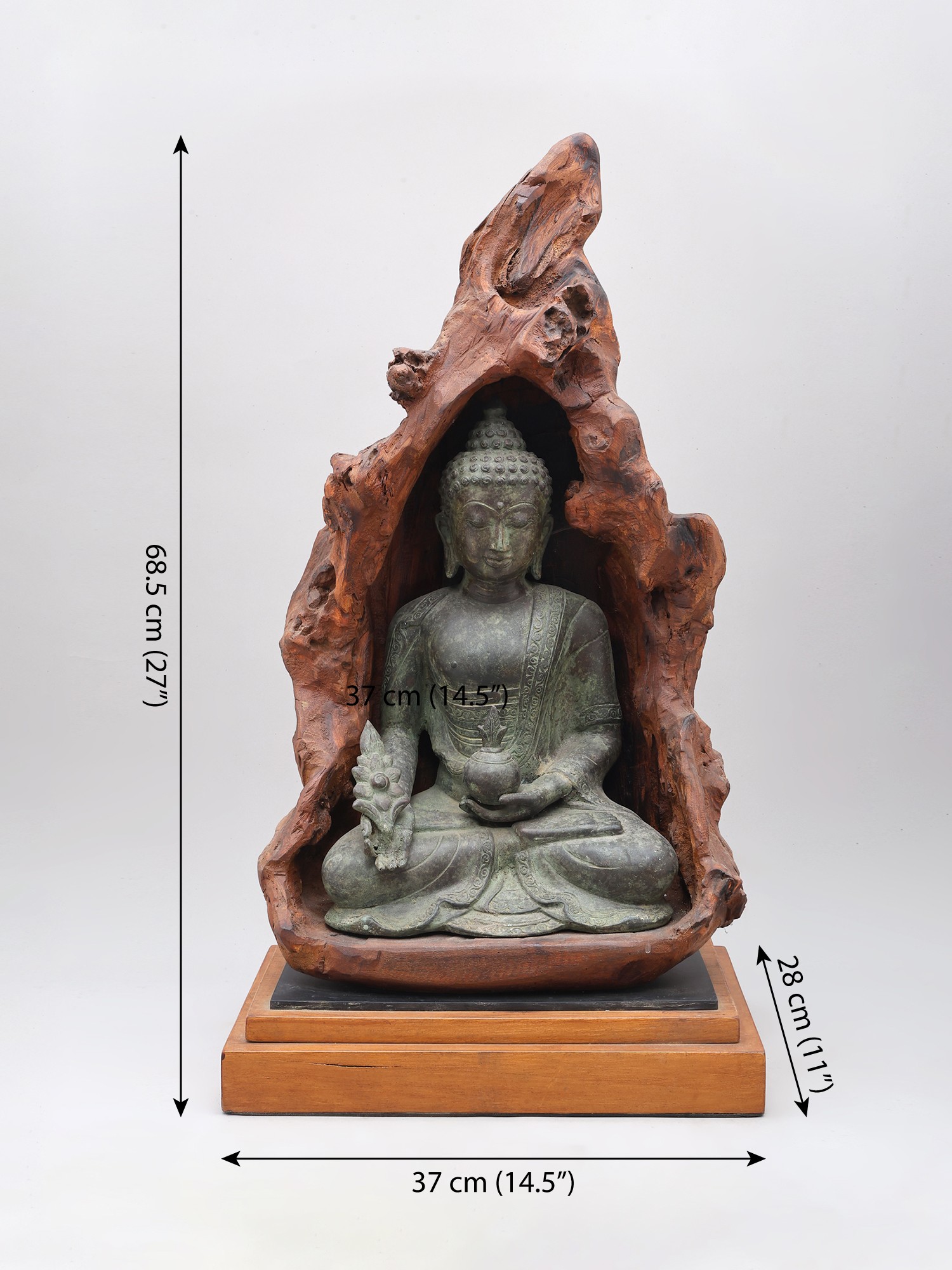 Immerse your space in serenity and healing with this exquisite depiction of the Medicine Buddha, cradled within the organic embrace of a beautifully sculpted wooden grotto. The figure of the Buddha, cast in rich brass using the time-honored lost-wax method, radiates a profound sense of peace and compassionate energy. His gentle gaze and serene posture invite contemplation, while the intricate details of his robes and the symbolic bowl of medicinal herbs he holds signify his role as the supreme physician, capable of healing all suffering, both physical and mental.