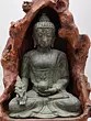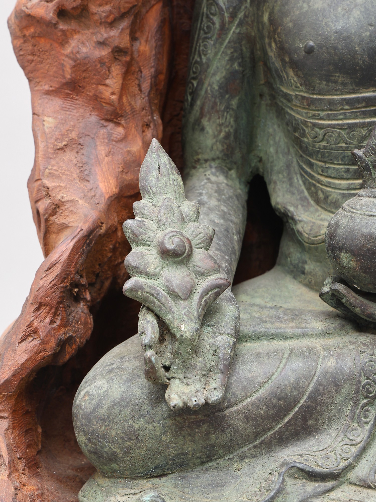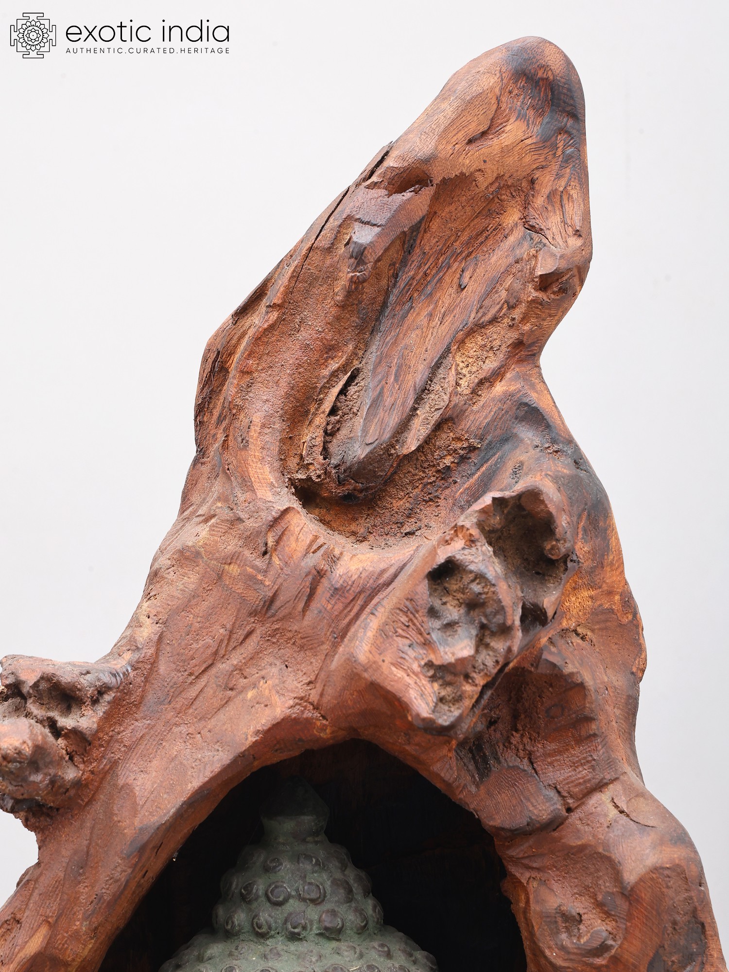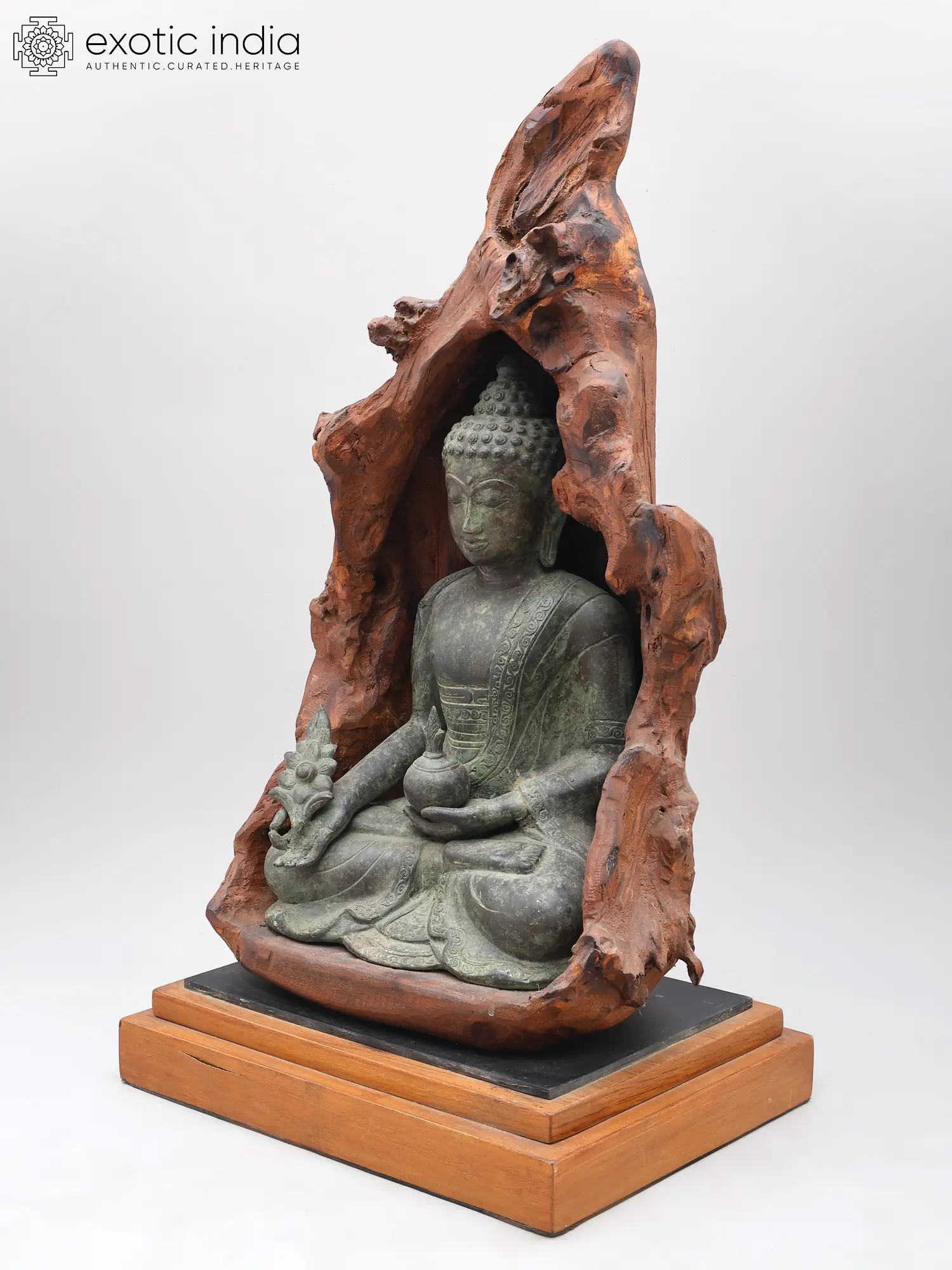 Immerse your space in serenity and healing with this exquisite depiction of the Medicine Buddha, cradled within the organic embrace of a beautifully sculpted wooden grotto. The figure of the Buddha, cast in rich brass using the time-honored lost-wax method, radiates a profound sense of peace and compassionate energy. His gentle gaze and serene posture invite contemplation, while the intricate details of his robes and the symbolic bowl of medicinal herbs he holds signify his role as the supreme physician, capable of healing all suffering, both physical and mental.
