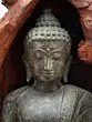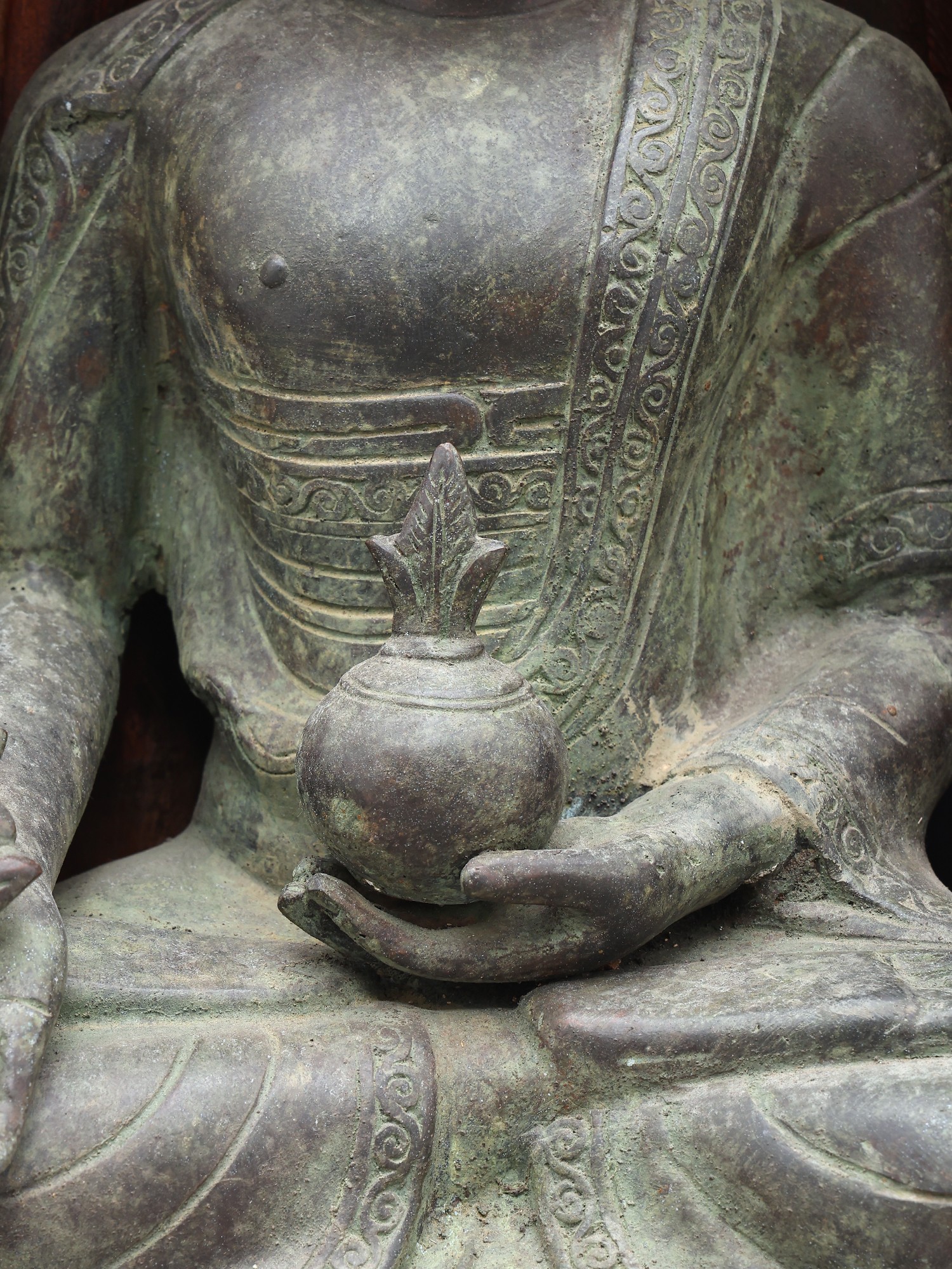 The naturalistic wooden structure that houses the Medicine Buddha is as integral to the artwork as the deity himself. Carved from a substantial piece of wood, it evokes the humble origins of the Buddha's teachings, often imparted in natural settings like groves and caves. The rough-hewn texture and organic form of the wood create a striking contrast with the refined elegance of the brass figure, symbolizing the interconnectedness of the spiritual realm and the material world. This juxtaposition suggests that healing and enlightenment can be found not only through dedicated practice but also through an appreciation of nature's profound beauty and resilience. The wooden grotto serves as a natural sanctuary, a place where the divine presence of the Medicine Buddha can flourish and radiate its healing energies.