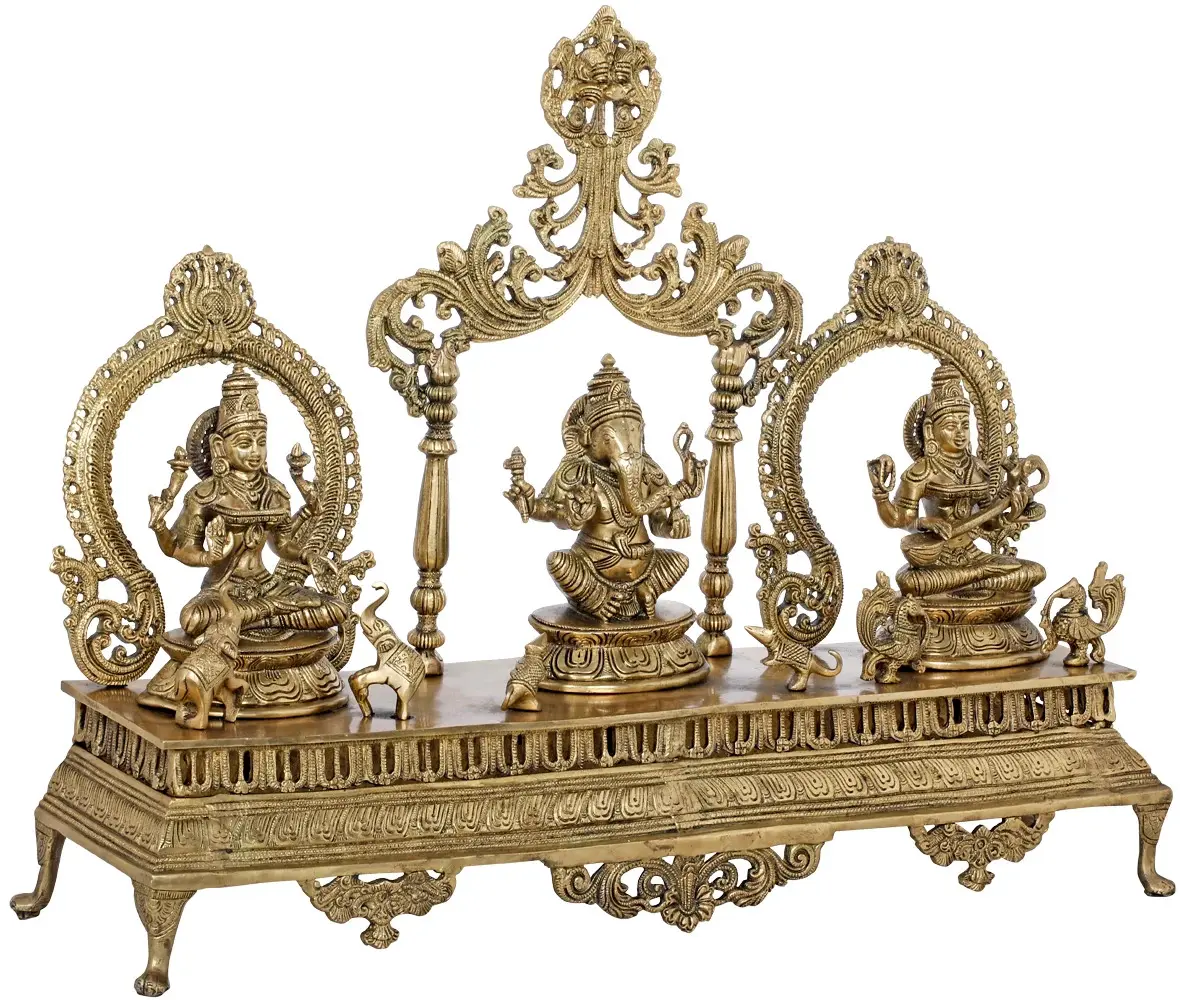 Celebrate the unity of prosperity, wisdom, and success with the Great Trinity of Lakshmi, Ganesha, and Saraswati, exquisitely crafted in brass.As per the Hindu thought, this divine trio represents the blessings of wealth, auspicious beginnings, and knowledge. This piece symbolises the interconnectedness of these deities, emphasising that success, whether material or spiritual, relies on their combined grace. Place this statue in your home and invoke the blessings of the Great Trinity to usher in abundance, wisdom, and prosperity.