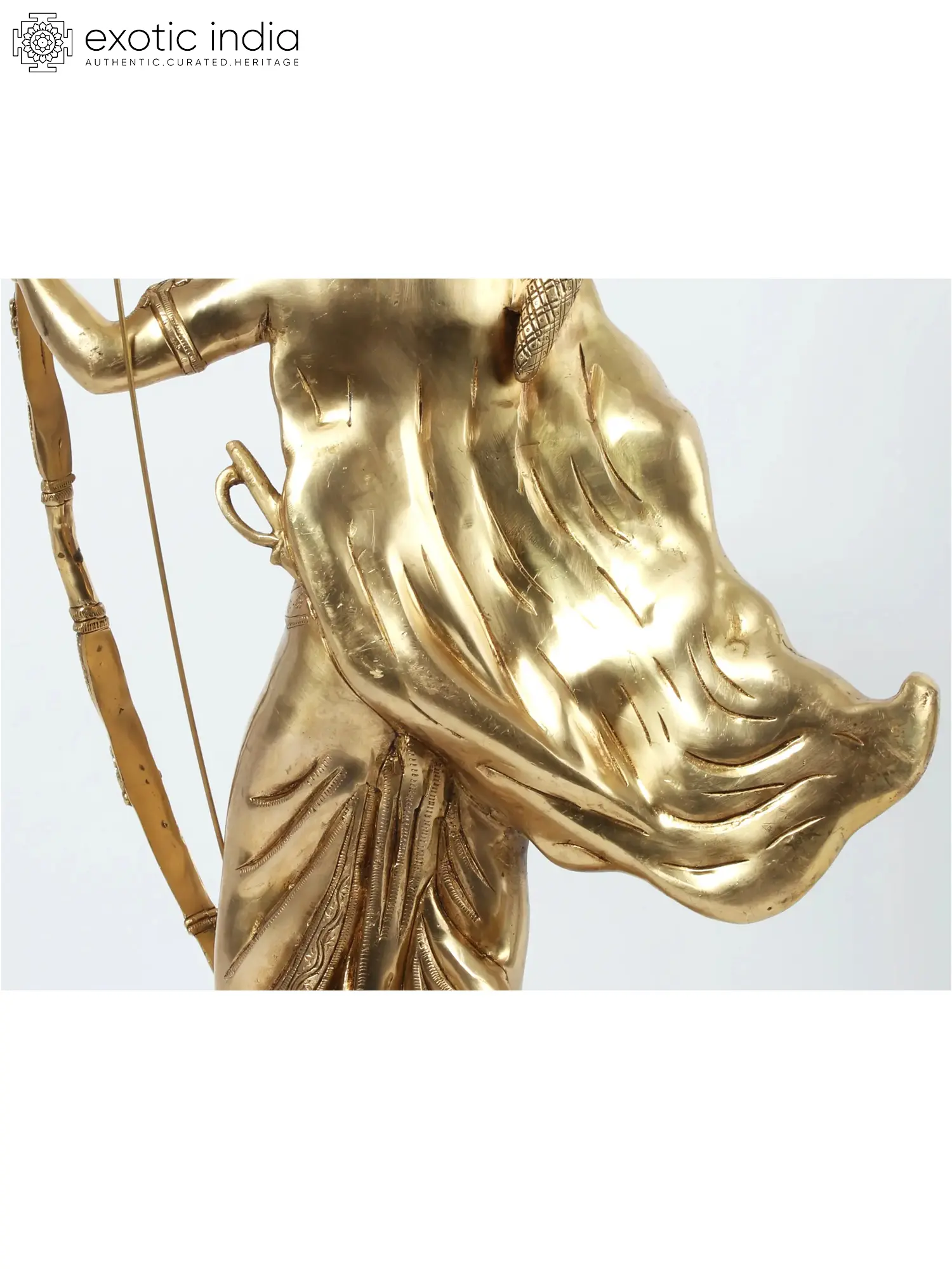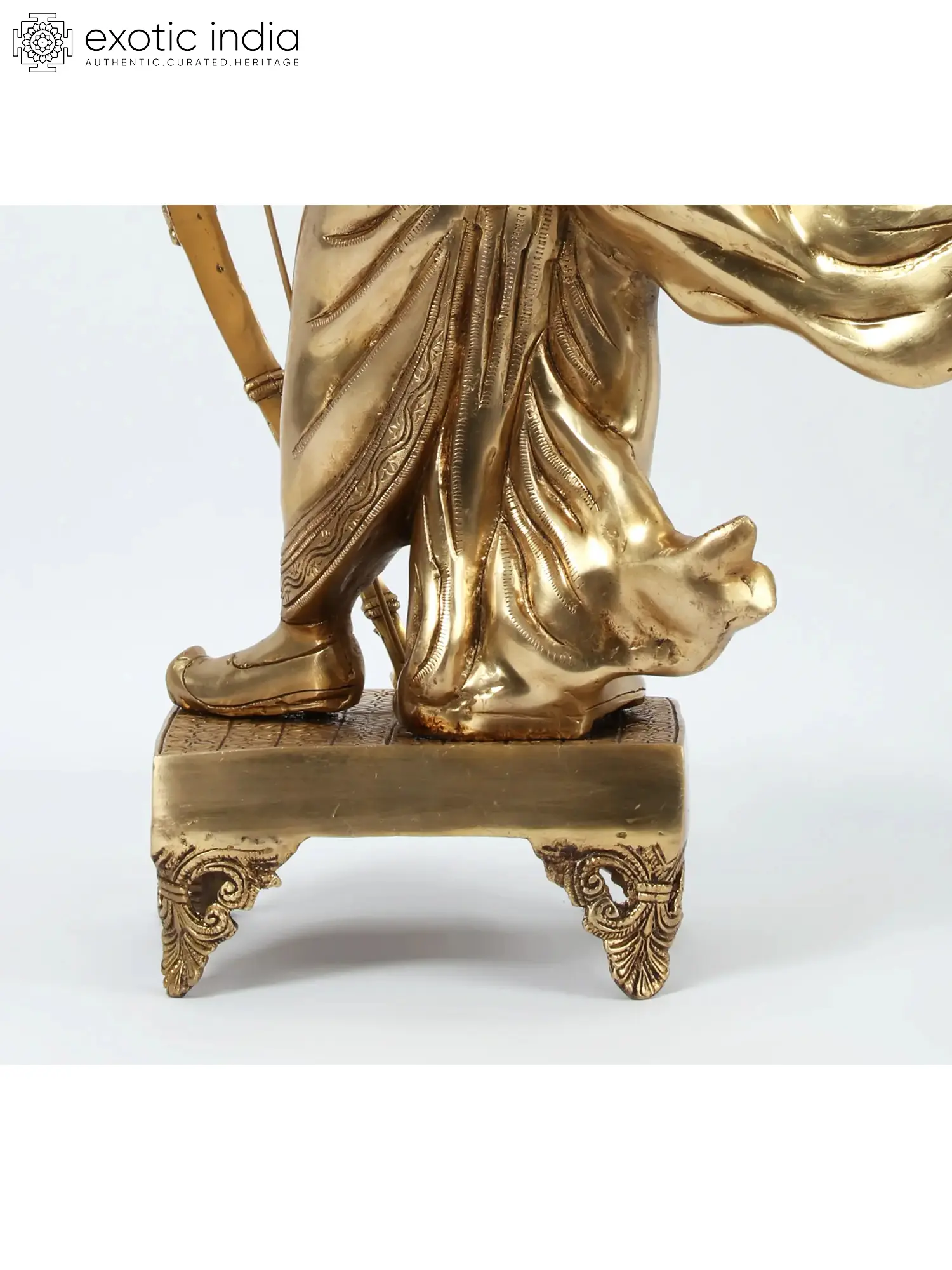 This magnificent brass sculpture captures the essence of Lord Rama, the revered prince of Ayodhya and an avatar of Lord Vishnu. Standing tall and exuding an aura of divine grace and unwavering strength, this artwork is a testament to the rich artistic traditions and deep spiritual heritage of India. Crafted from high-quality brass, the sculpture gleams with a warm, golden luminescence, symbolizing purity, prosperity, and auspiciousness. Every detail, from the intricate crown adorning Rama's head to the flowing dhoti and ornate jewelry, has been meticulously rendered by skilled artisans, bringing to life the divine prince of the Ramayana. The pose of Lord Rama in this sculpture is one of serene readiness. He holds a formidable bow, the Gandiva, in his left hand, a symbol of his divine power and his role as a protector of righteousness. His right hand is held in a gesture of blessing or perhaps contemplation, a reflection of his calm demeanor even in the face of immense challenges. A quiver of arrows rests on his back, ready for action against the forces of evil. The flowing fabric of his robes suggests movement and dynamism, as if he is poised to embark on a righteous mission at any moment. The entire composition speaks of nobility, courage, and the unwavering commitment to dharma, the cosmic order of righteousness.