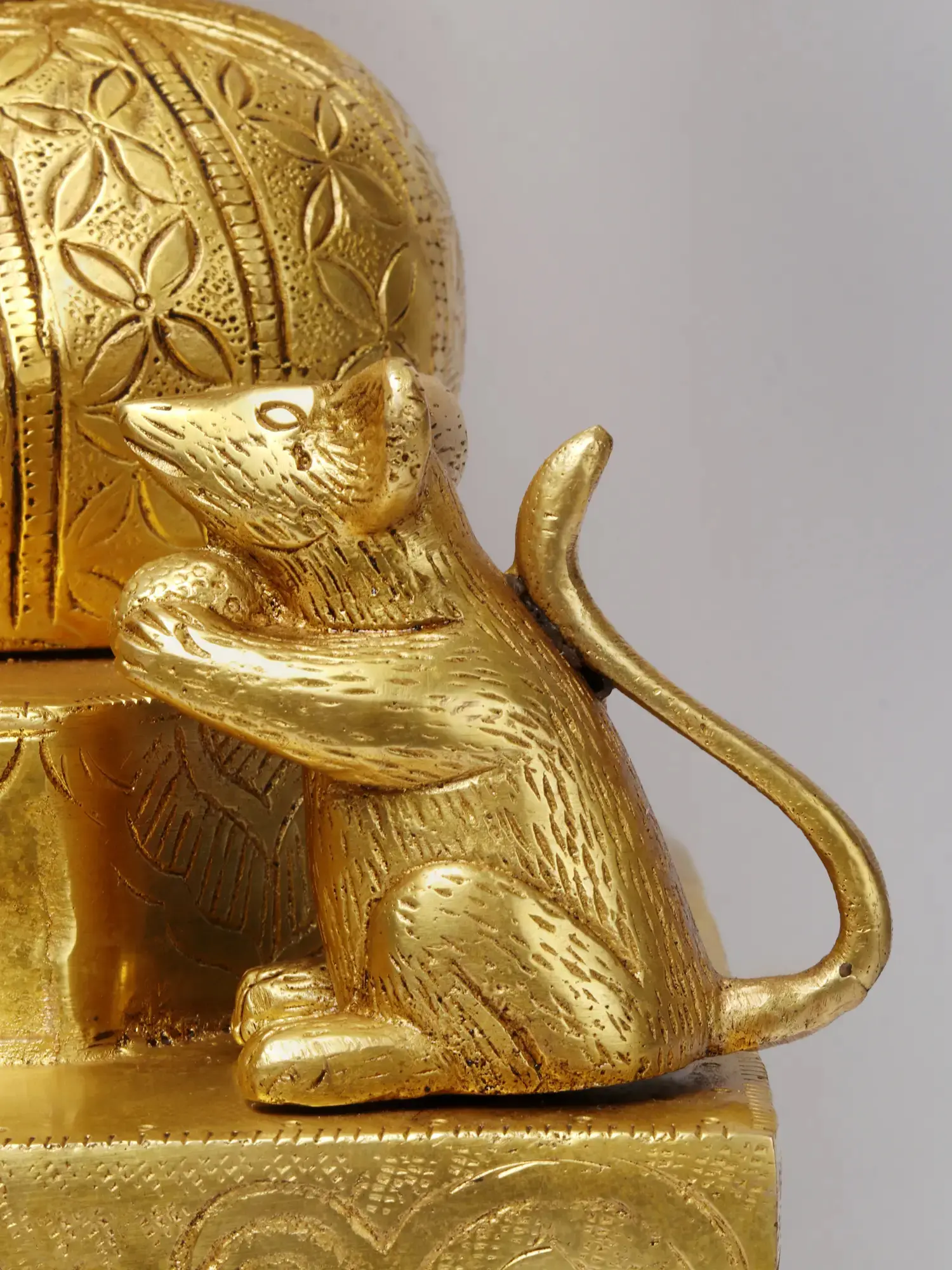Baala-deva Ganesha, the quintessential child-deity of the Hindu pantheon, is seated on a chowki. His limbs are gathered in ardha-padmasana. Interestingly, the posterior pair of His four arms bears the Vaishnava shankha va chakra.