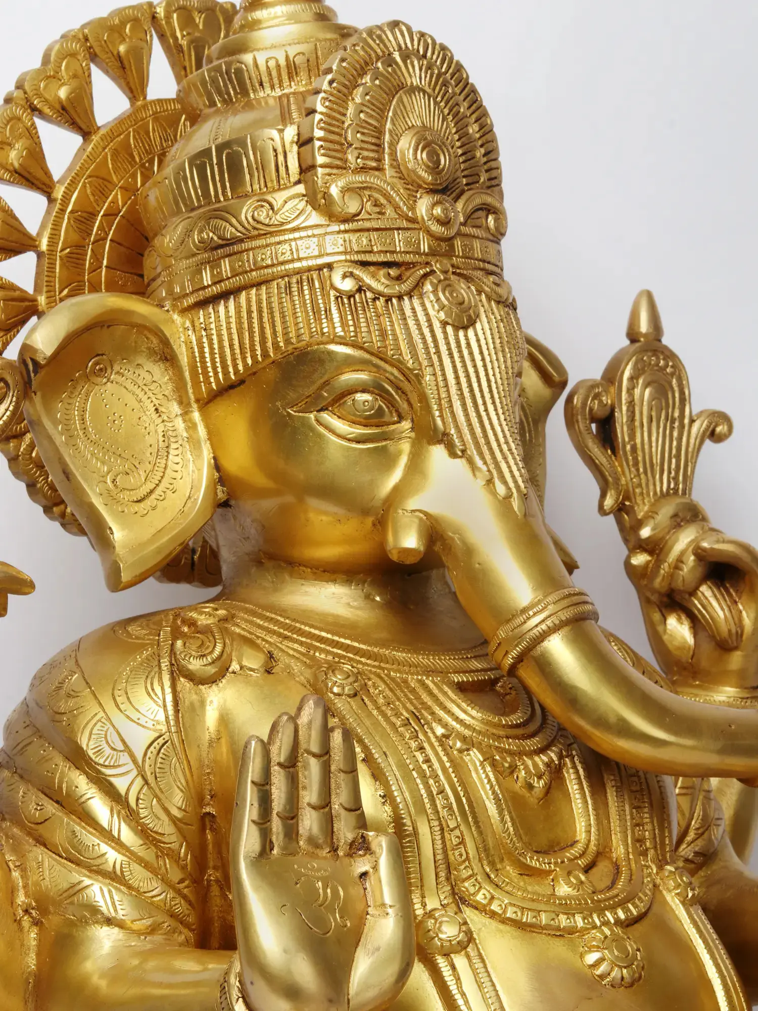 The anterior hands of the Lord are in keeping with His traditional iconography. He is generous with blessings (right hand); and without a gigantic modaka, which He cradles with the tip of His trunk, His iconography would be incomplete.