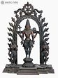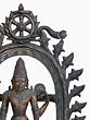 This bronze statue follows the traditional Shilpashastras or canons on iconography depicting Vishnu in the center, on a higher lotus pedestal, adorned with a unique conical crown, Makara-shaped earrings, dhoti, and an elaborate waist ornament. Both his hands are in Varada mudra, the gesture of giving boons.
