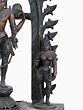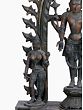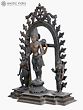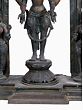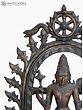 Sharing the pedestal with their beloved is Sridevi on Vishnu’s right, with ample bosom, a round face, and a gentle smile while a younger-looking Bhudevi appears on Vishnu’s left, with a meditative face. The aureole is decorated with vegetation and Chakra- the symbol of the eternal movement of time at the top, representing the ceaseless cycles of time nurtured by the divine Perumal and his Shaktis.