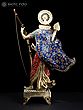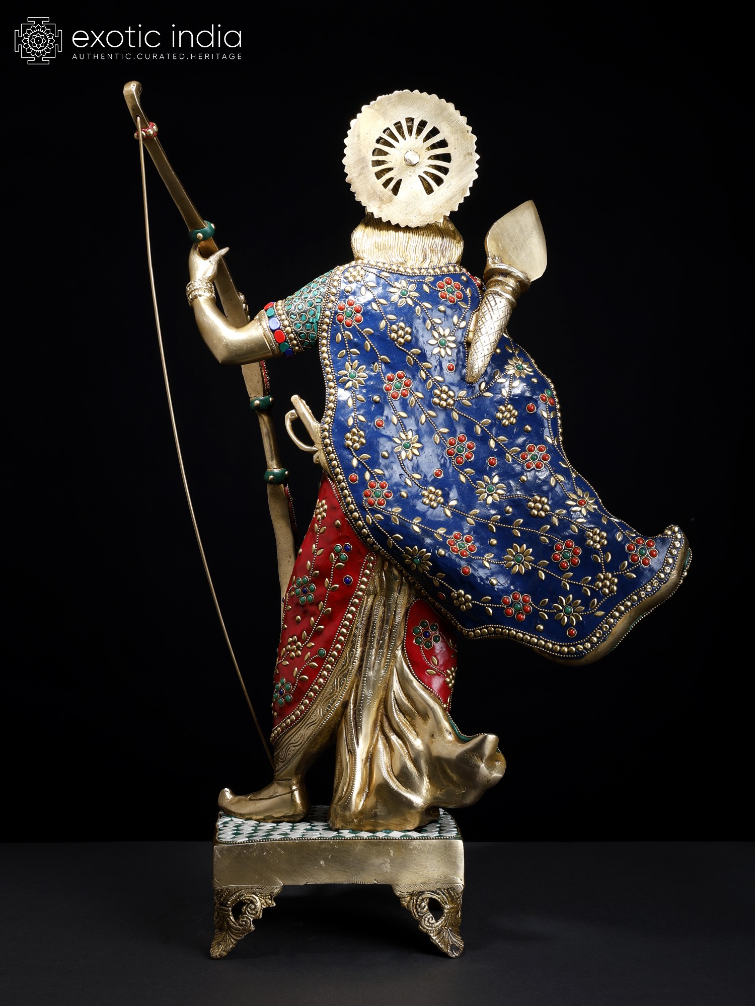 This brass statue of Maryada Purushottam Shri Ram is a masterful blend of artistry and devotion, showcasing Lord Ram in a victorious pose. Holding his iconic bow, the Saranga or Kodanda, Lord Ram exudes strength and grace. His attire is beautifully inlaid with bright red stones, adding a vibrant touch to the statue's regal appearance.