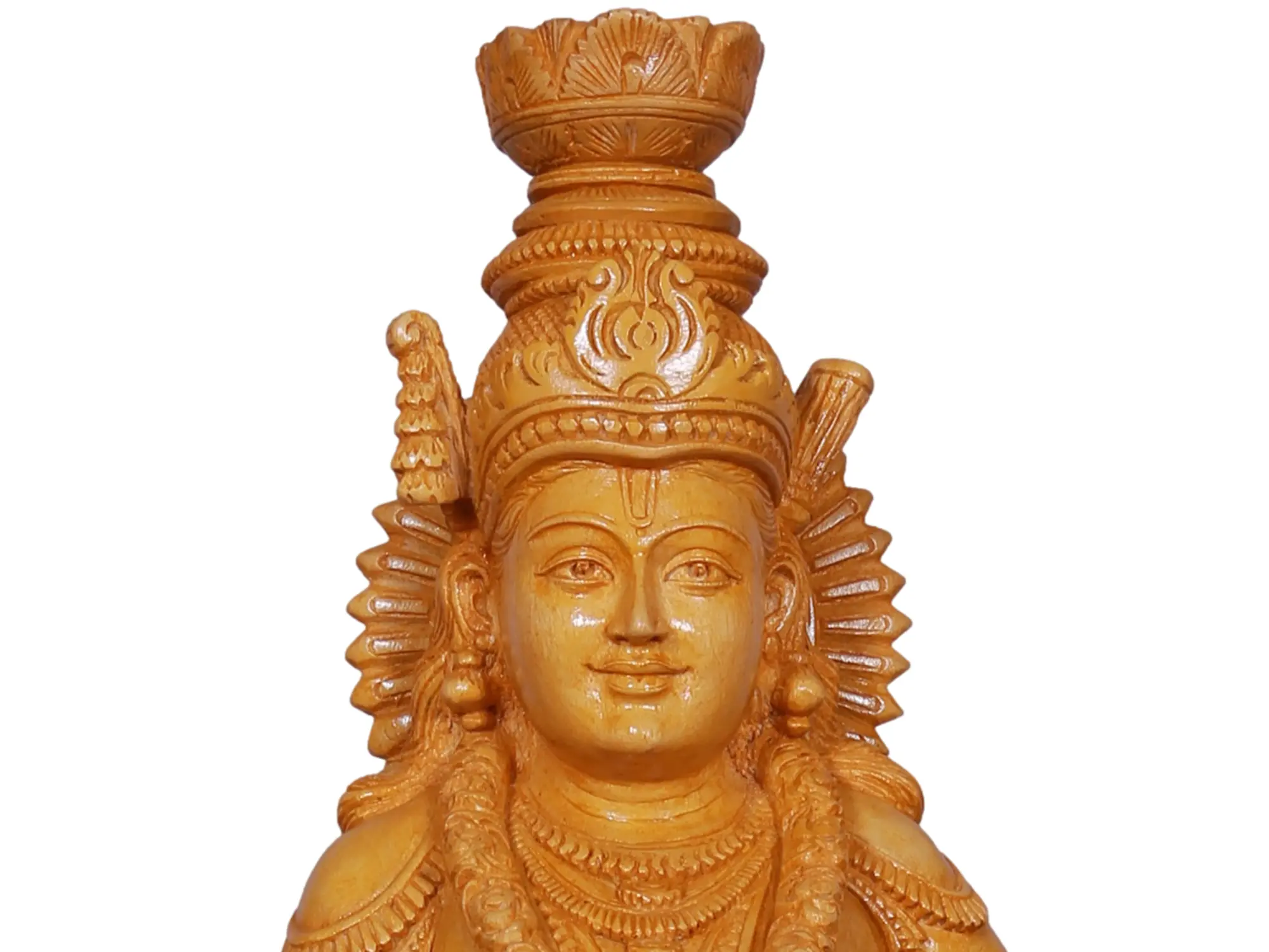 This exquisite wooden sculpture captures the enchanting presence of Lord Krishna, the beloved deity revered for his wisdom, charm, and divine play. Carved from high-quality wood, this statue embodies the spiritual essence of Krishna, inviting a sense of peace and devotion into any space. The natural grain of the wood is enhanced by the meticulous craftsmanship, showcasing intricate details from the divine crown adorning his head to the delicate folds of his attire.