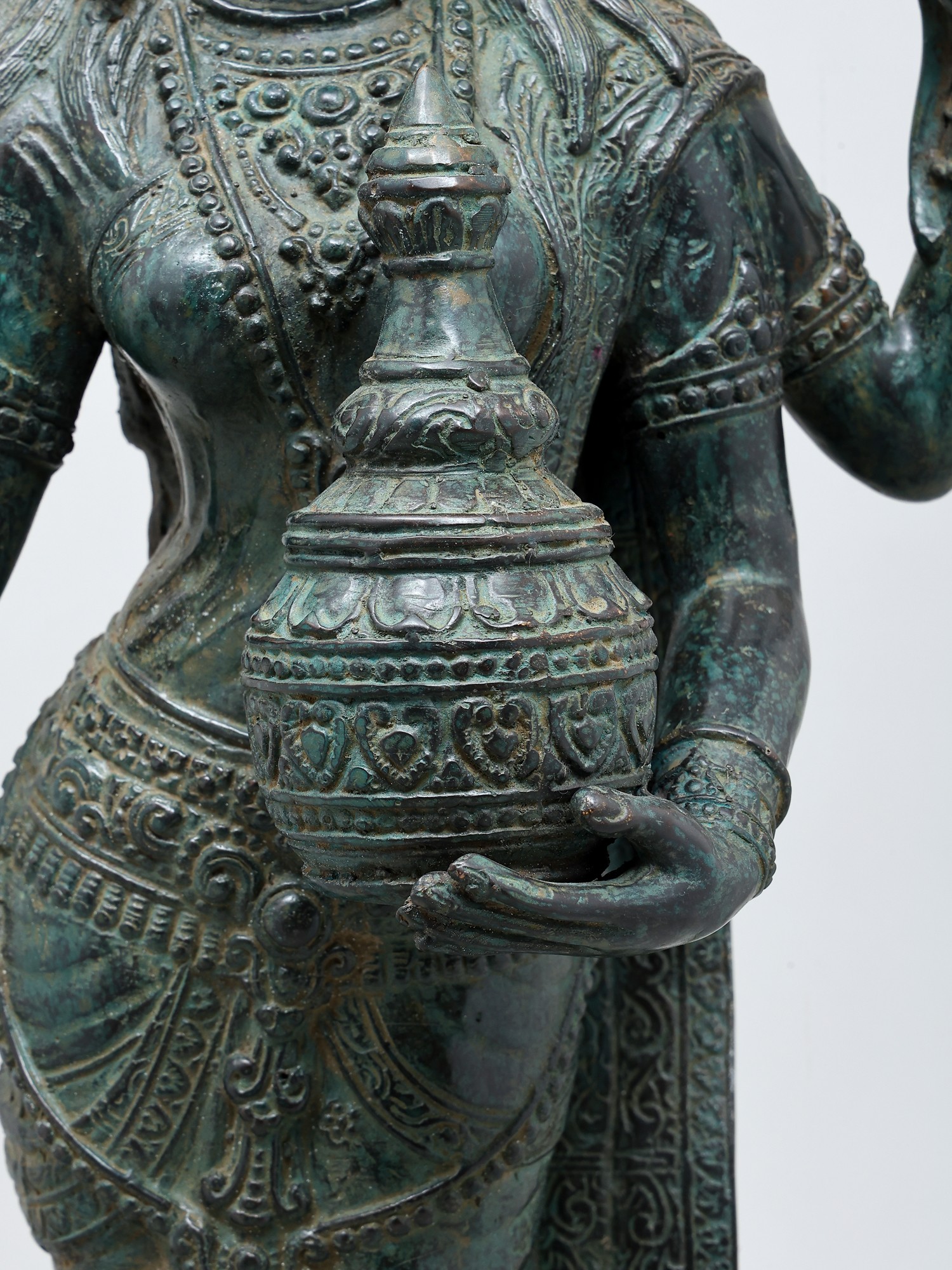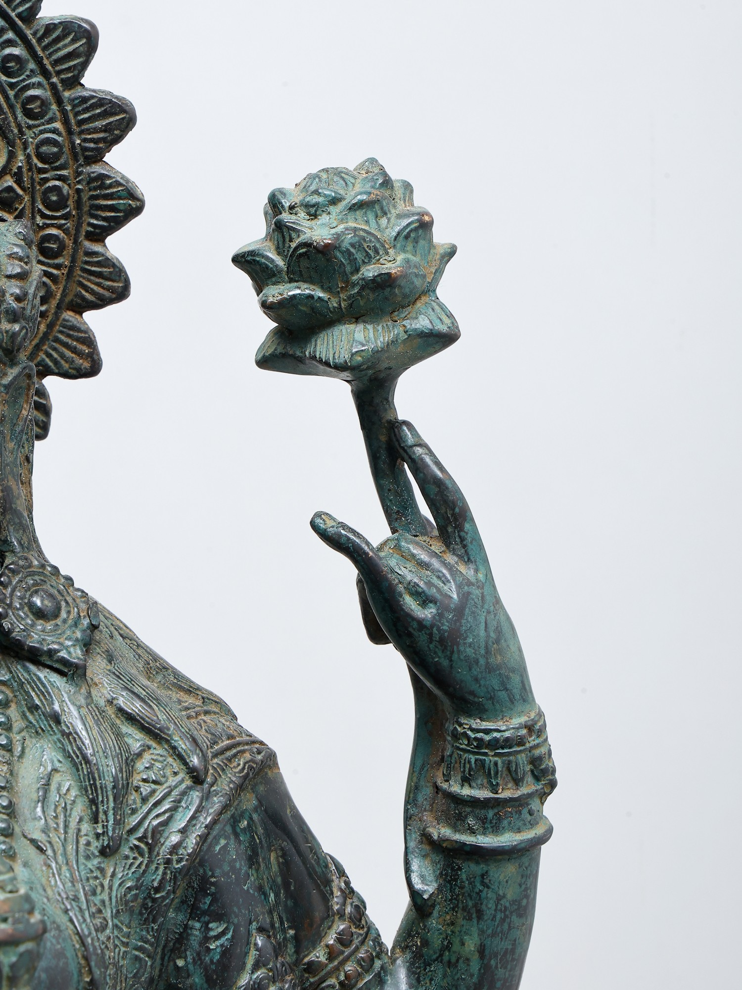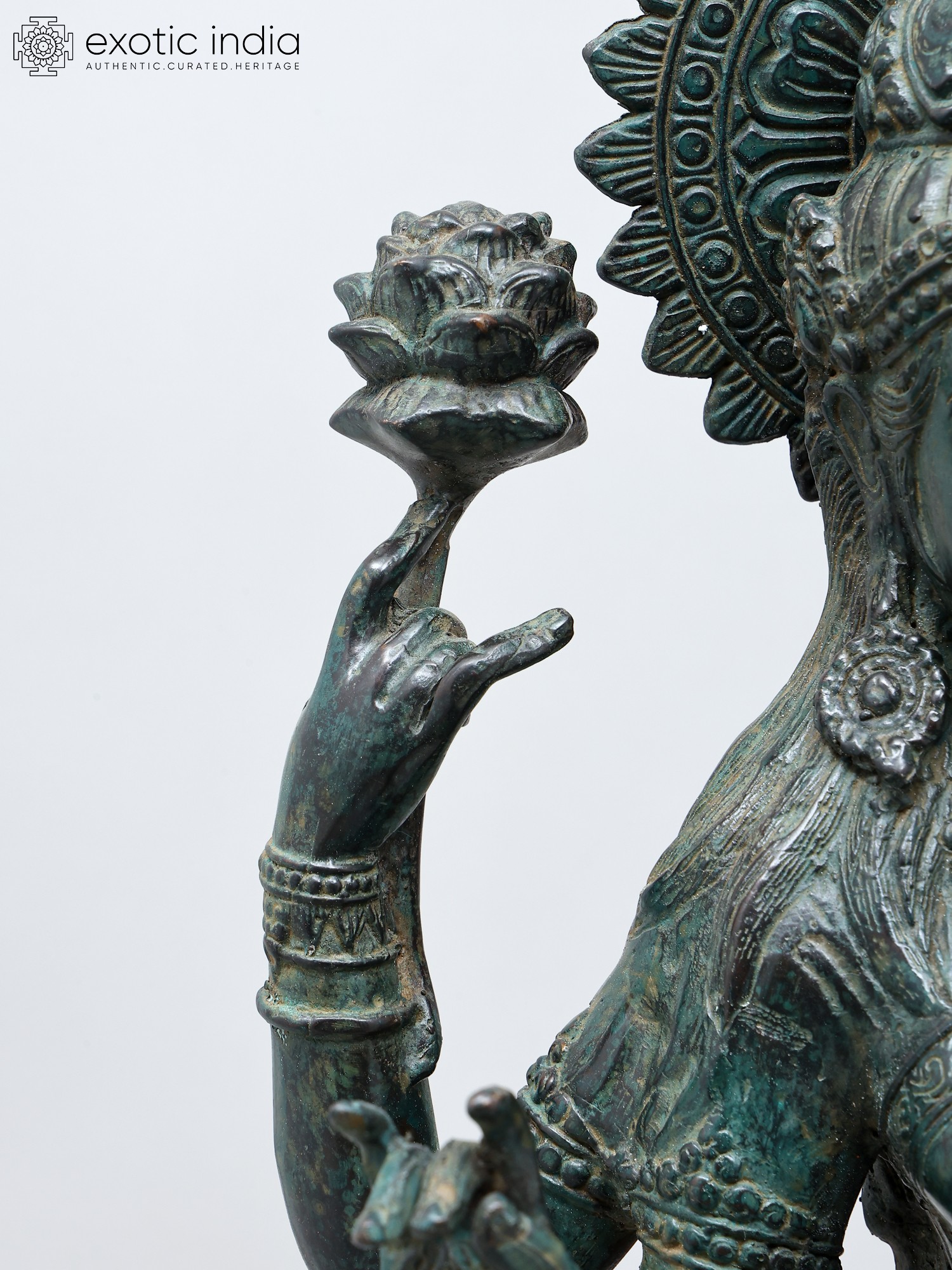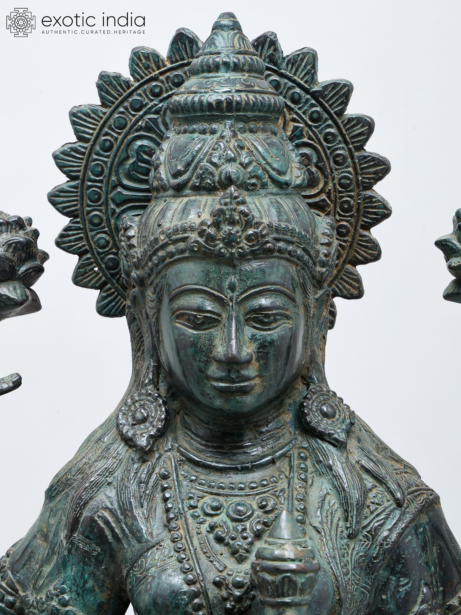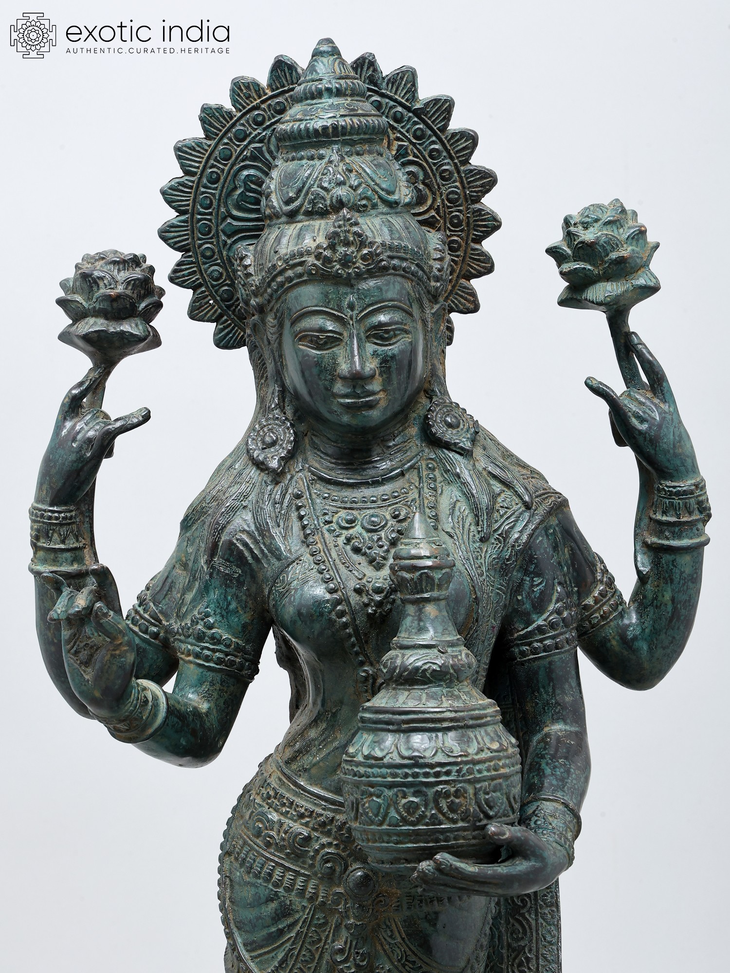 8" Four Armed Goddess Laxmi Seated on Lotus Petals | Green Stone Statue | Hand Carved