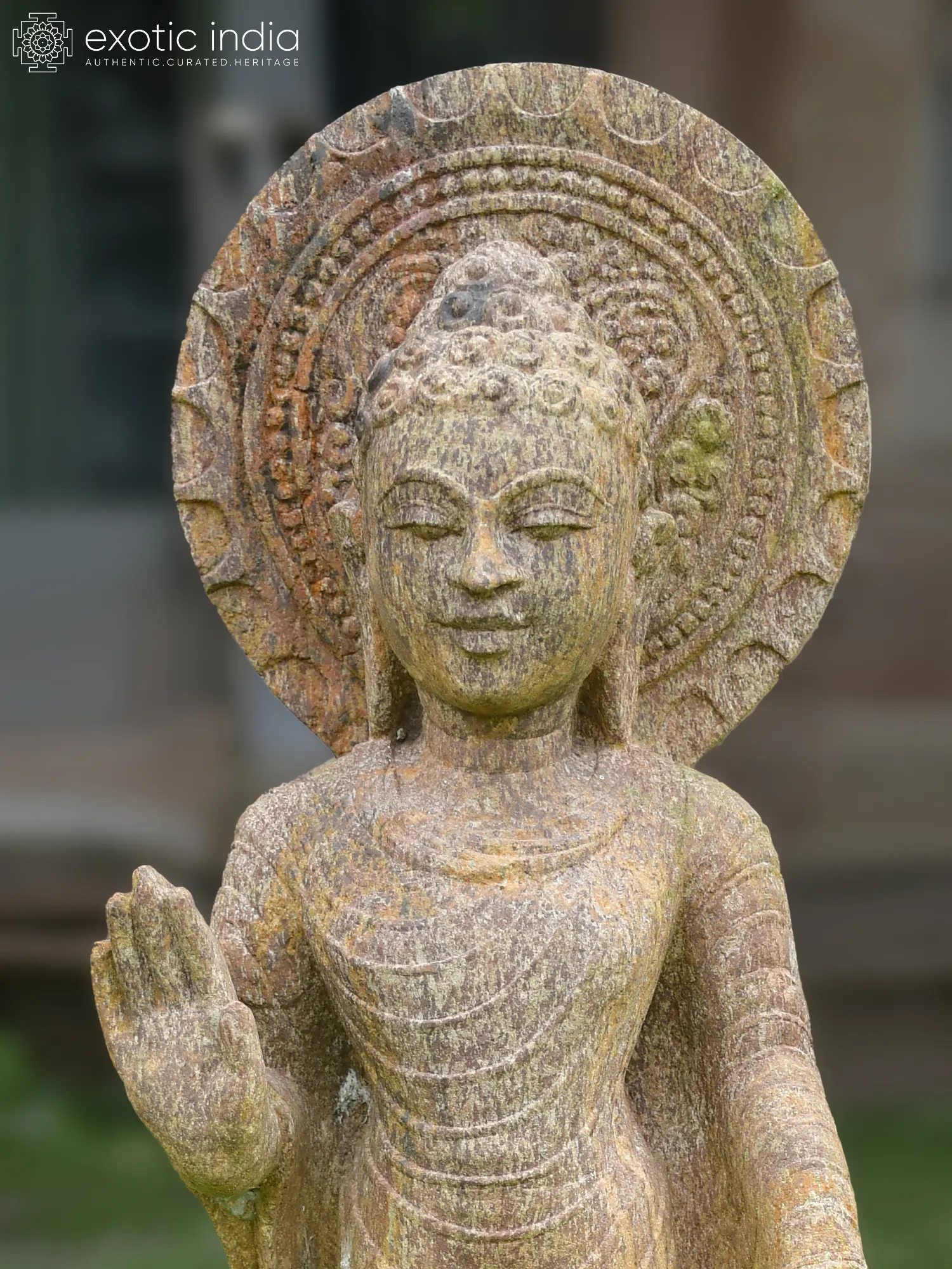 Standing tall at twenty-seven inches, this representation of the enlightened one commands attention with its elegant posture. The upward-raised hand bestows blessings, while the gentle gaze invites introspection. The circular halo behind the head, adorned with intricate patterns, symbolizes divine wisdom and cosmic awareness. Its substantial presence, measuring approximately nine inches wide and six inches deep, ensures it makes a striking impression.