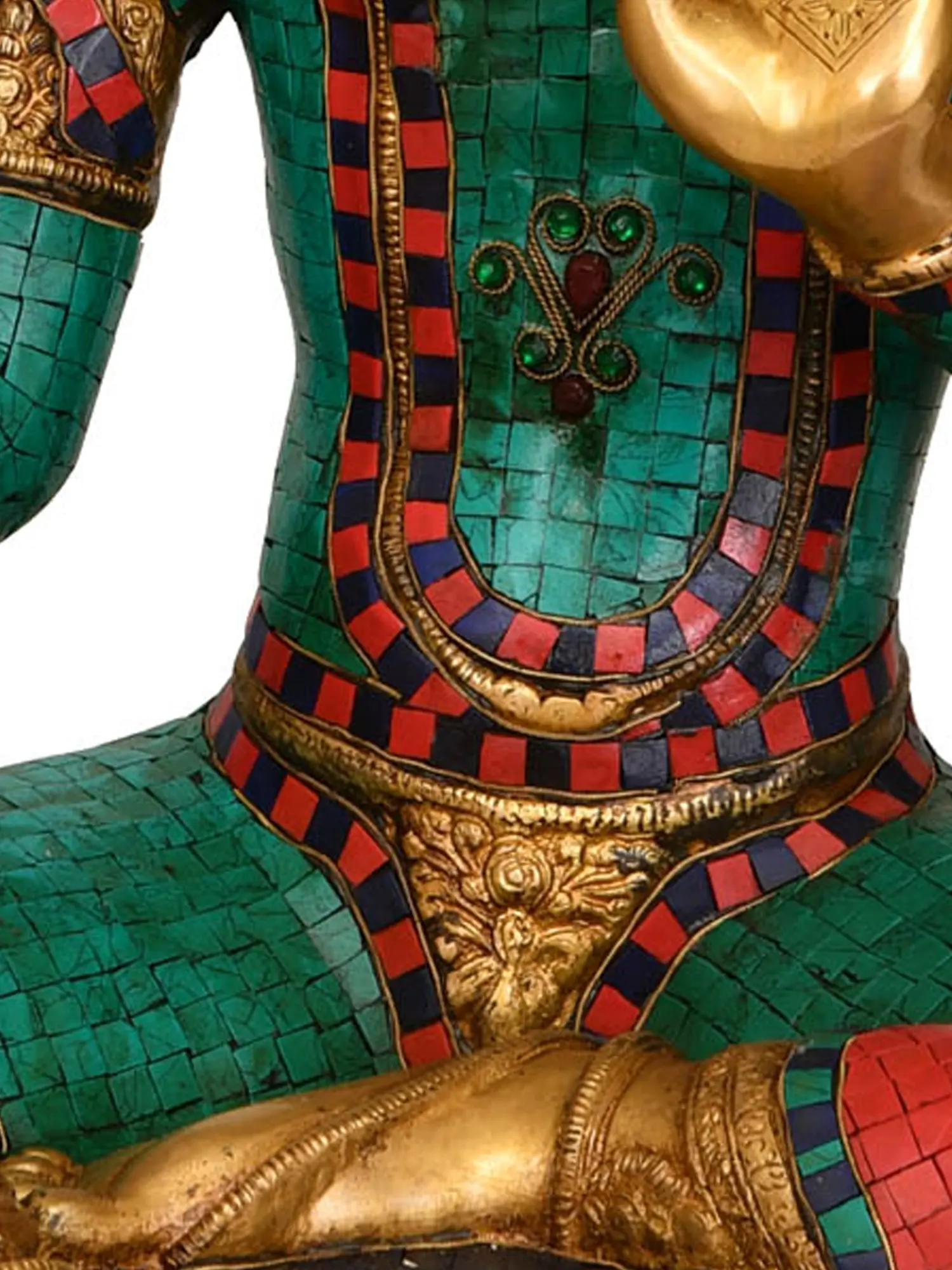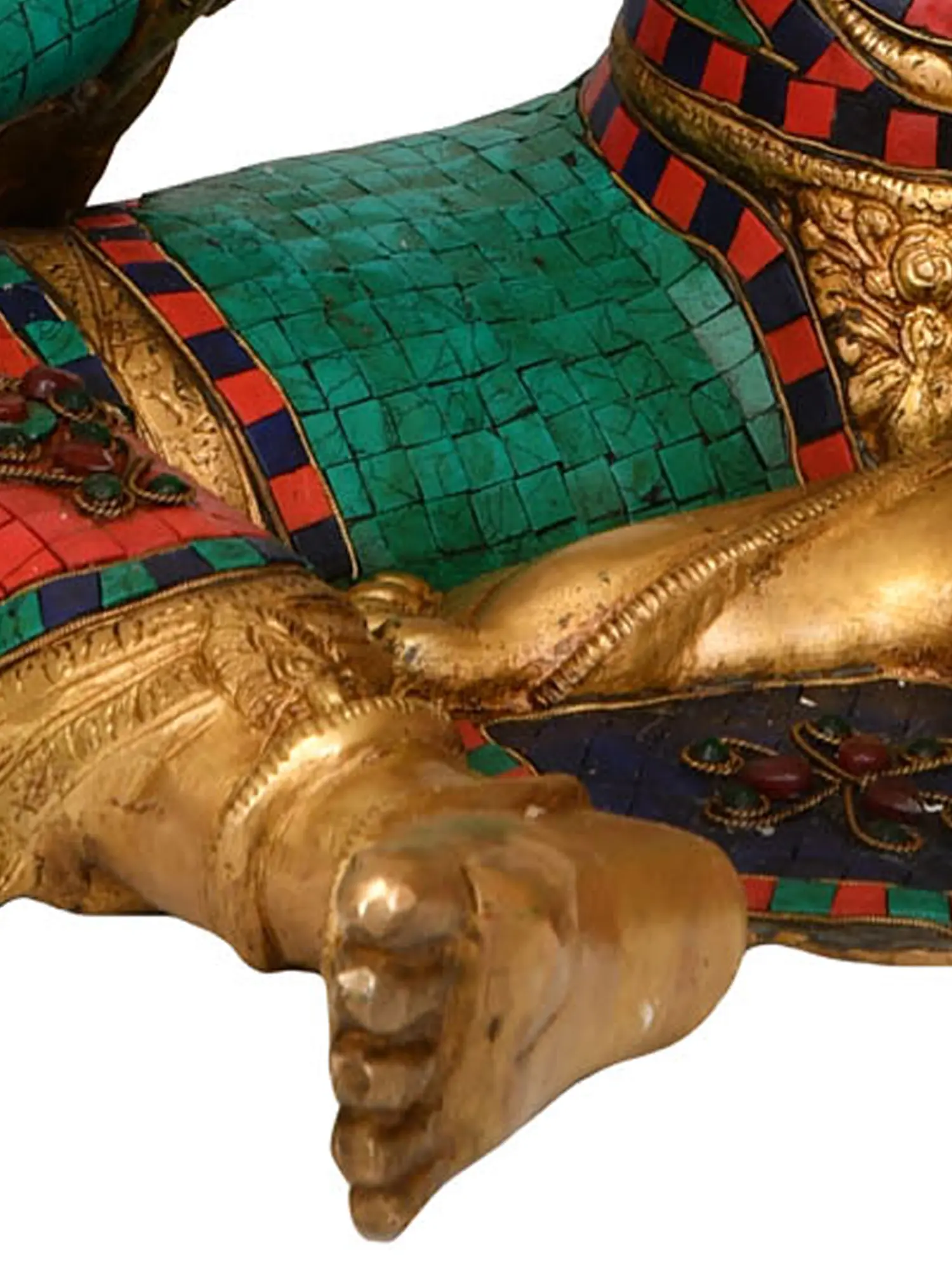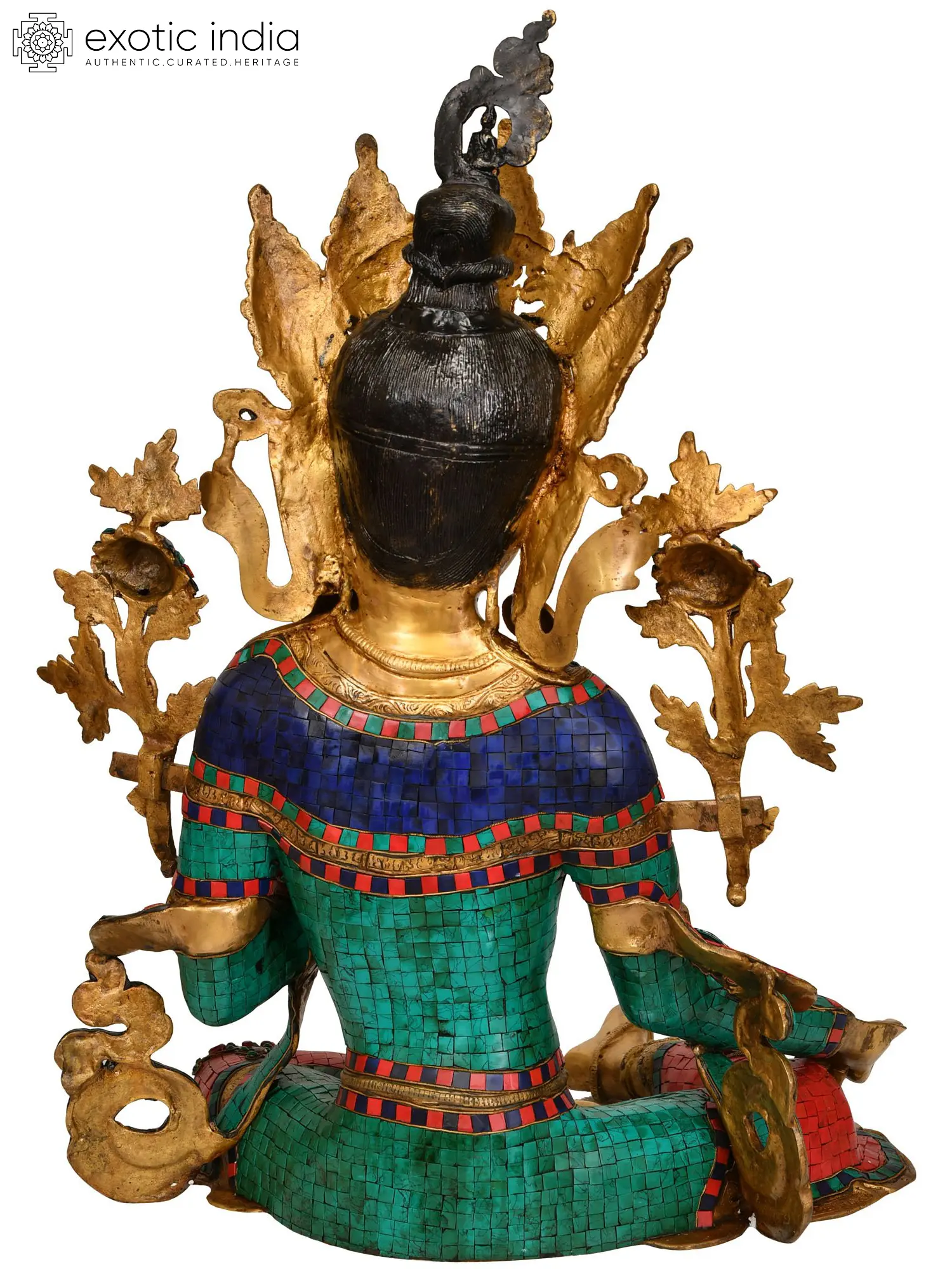 This magnificent brass sculpture captures the benevolent presence of Green Tara, a revered deity in Tibetan Buddhism, embodying swift compassion and protection. Crafted with exceptional skill in India, this piece is more than just an artwork; it is a conduit for peace, wisdom, and spiritual solace. The commanding size of this deity ensures it will be a striking centerpiece in any sacred space or a focal point of contemplation. The luminous golden brass forms the foundation of this divine image, polished to a radiant sheen that reflects the enlightenment Tara represents. Her form is adorned with an exquisite inlay of vibrant turquoise and coral chips, arranged in intricate patterns that suggest flowing robes and regal ornamentation. These stones, beloved in many cultures for their protective and healing properties, add a tactile richness and a mesmerizing visual depth to the sculpture. The meticulously detailed crown and the delicate floral motifs that frame her countenance speak to the divine beauty and grace of the goddess.