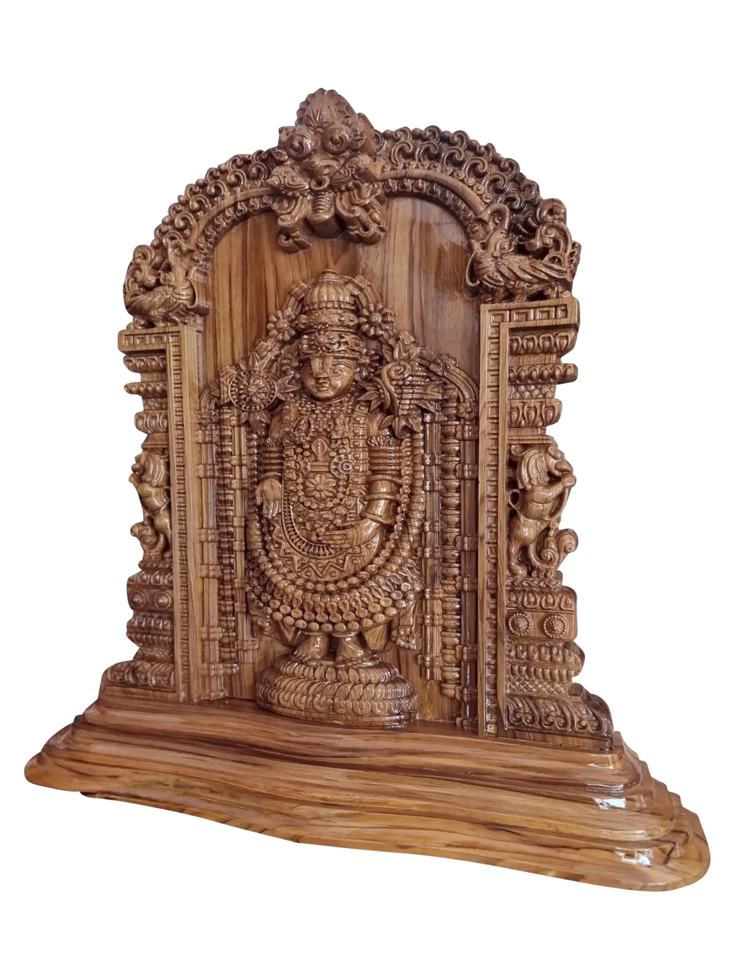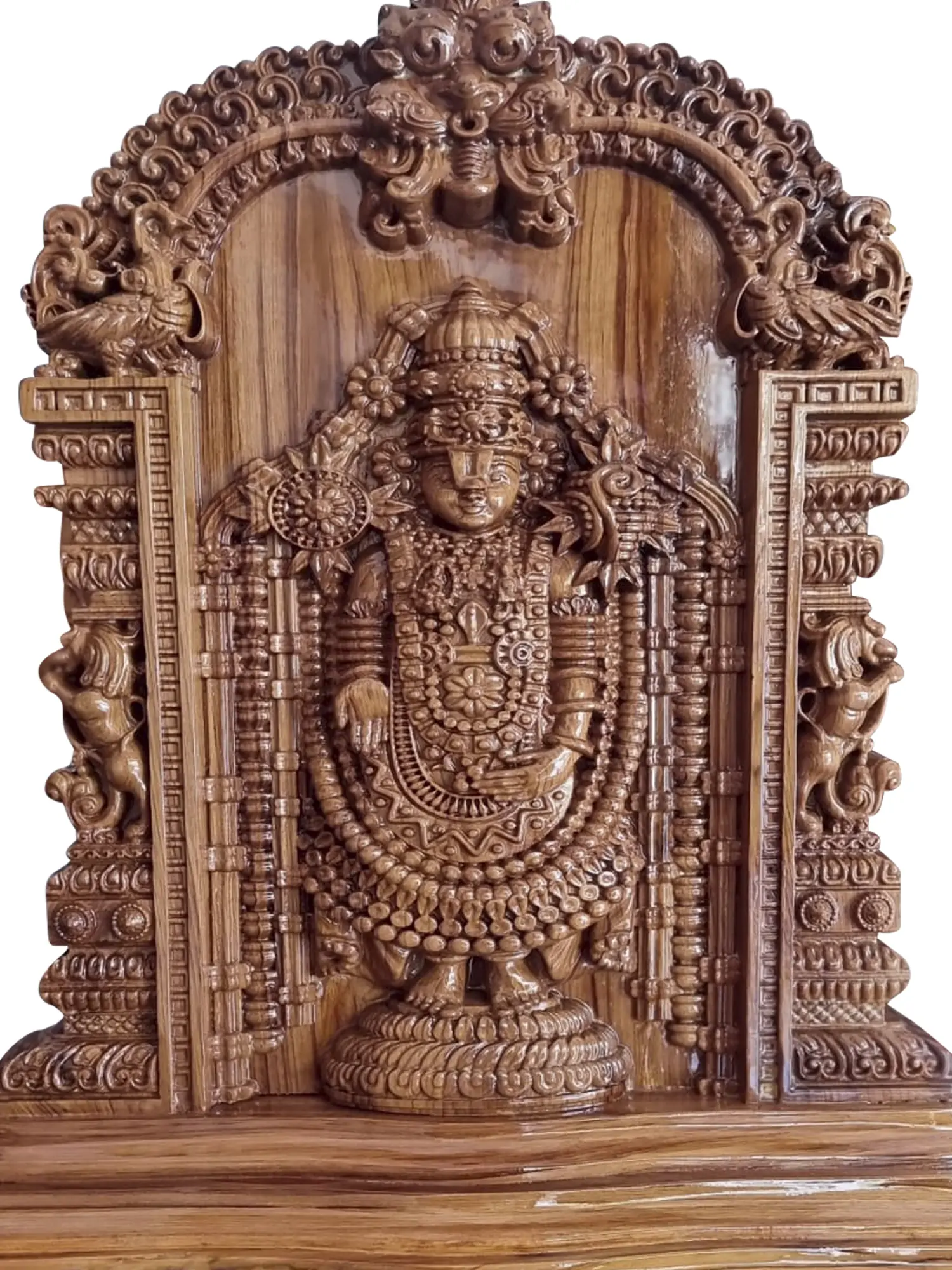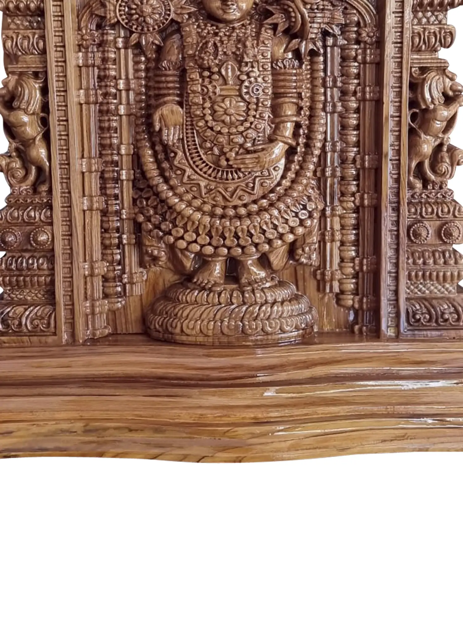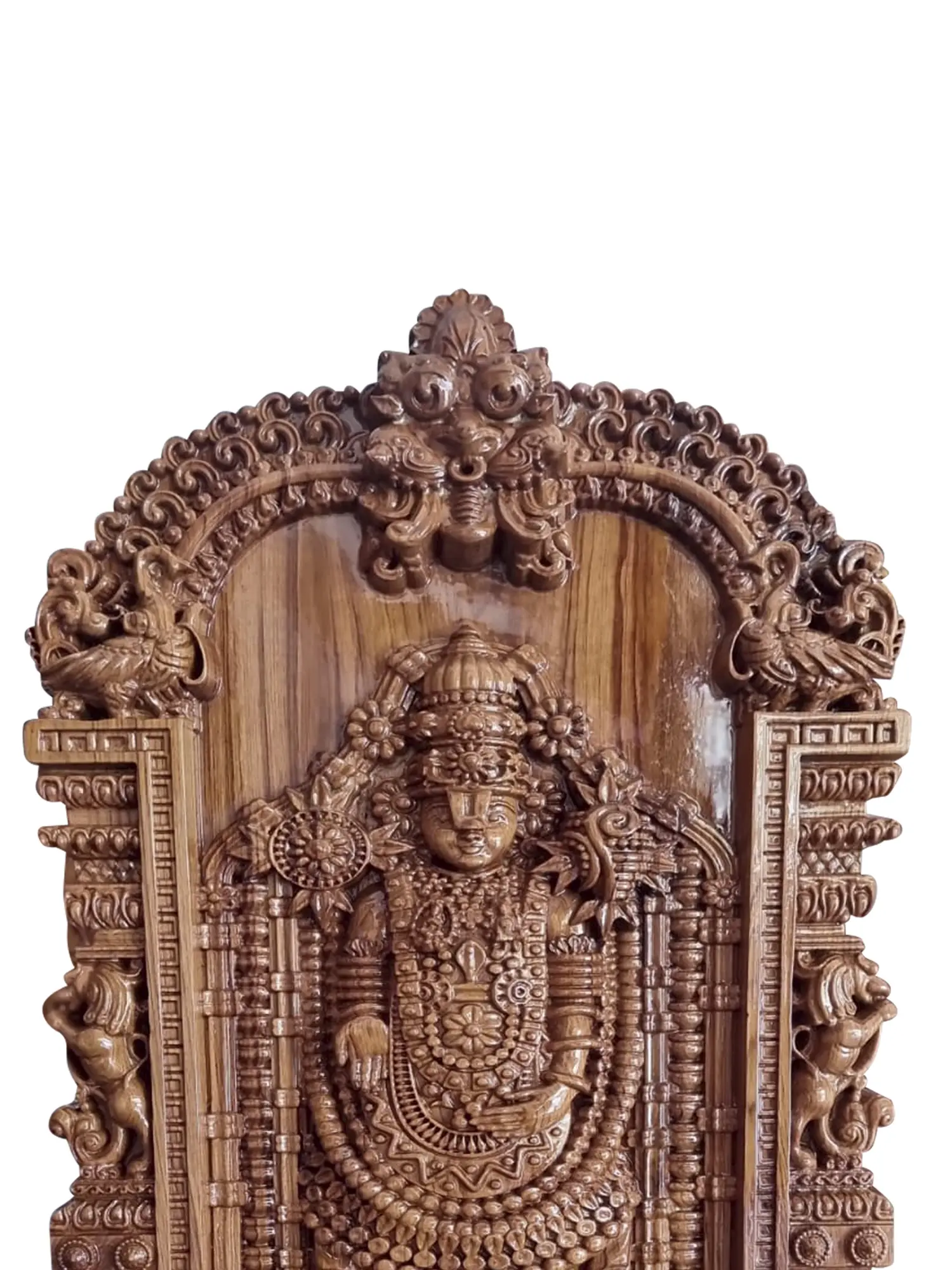 Tirupati Balaji, a divine, powerful manifestation of “Lord Venkateswara”, comes alive in a mesmerising wood panel for your wall, crafted from the noble teak wood. At its heart, the resplendent deity stands enthroned on a “Kirtimukha”, an awe-inspiring guardian of ancient traditions. The panel exudes an enchanting aura, inviting you into the celestial abode of the Lord. Each stroke of the artisan’s hand reveals a symphony of devotion, bringing to life the sacred stories etched in time. This masterpiece, a tribute to unwavering faith and intricate craftsmanship, radiates the divine presence of “Tirupati Balaji”, illuminating your space with spiritual blessings.