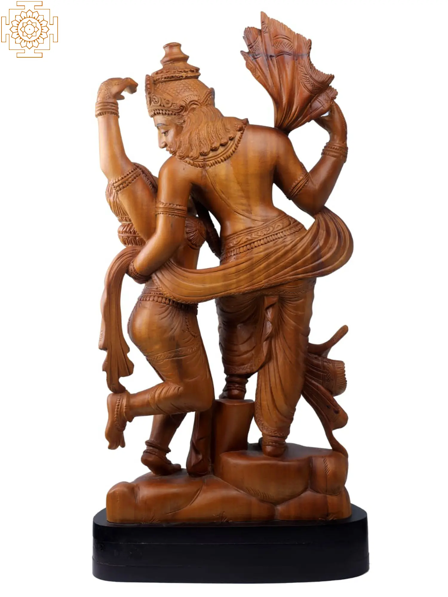 Immerse your space in the eternal romance and divine energy of Lord Krishna and Radha with this exquisite wooden sculpture. This breathtaking piece captures the transcendental joy and profound connection shared between the beloved deity and his devoted Radha, frozen in a moment of their ecstatic dance. Crafted from rich, warm wood, each curve and detail is meticulously carved by skilled artisans, bringing to life the story of their divine love that has captivated hearts for centuries. The sculpture depicts Krishna, the playful and enchanting blue-hued god, with his arms tenderly embracing Radha. Radha, radiant and lost in devotion, looks up at Krishna with an expression of pure bliss and adoration. Their entwined forms convey a sense of effortless grace and harmonious movement, as if they are caught mid-pirouette in the celestial gardens of Vrindavan. The flowing robes and intricate jewelry adorning them add a layer of opulence and reverence to the scene.