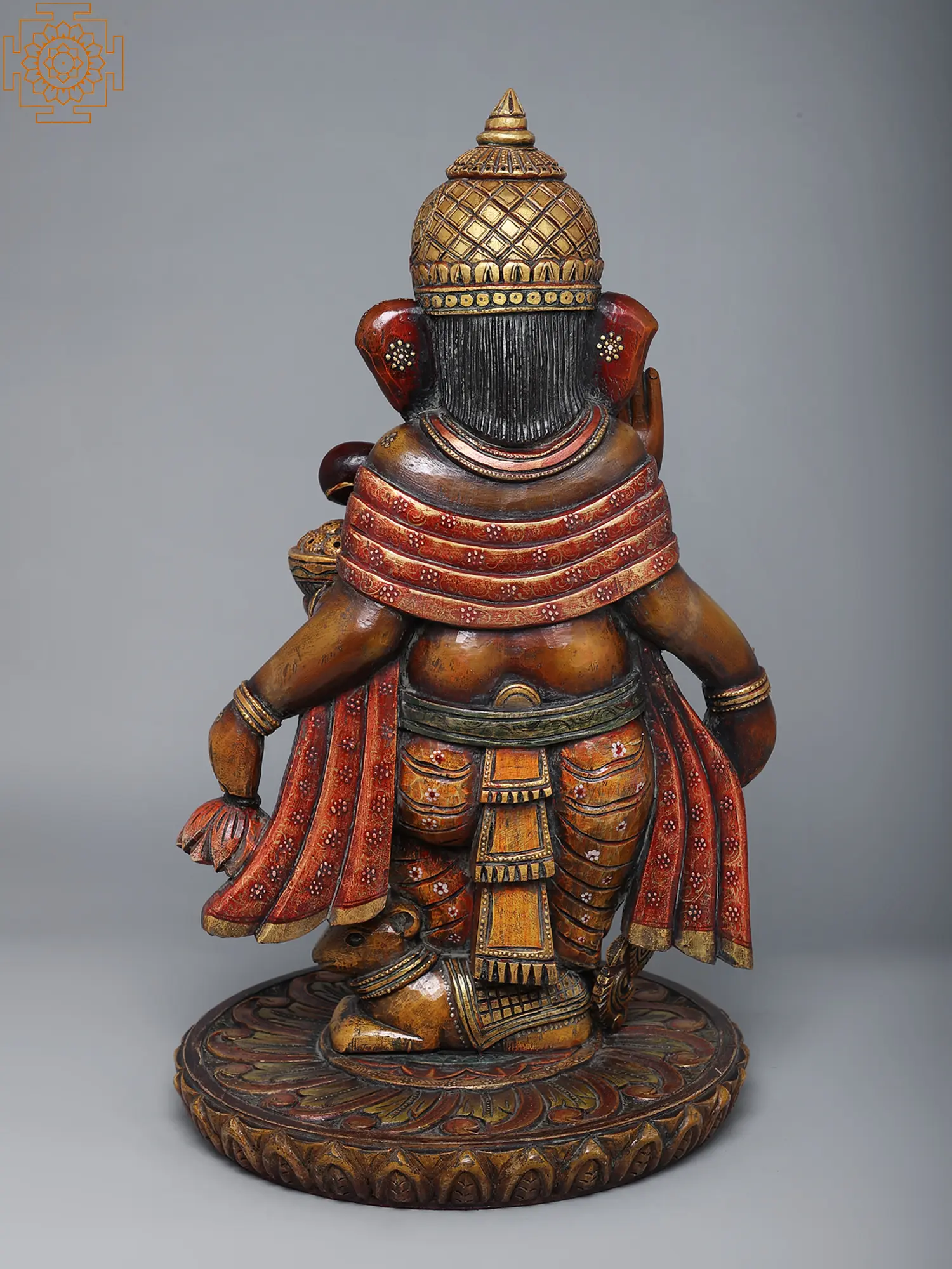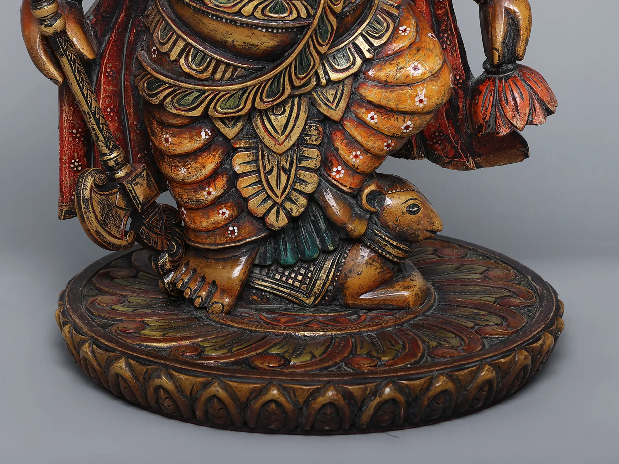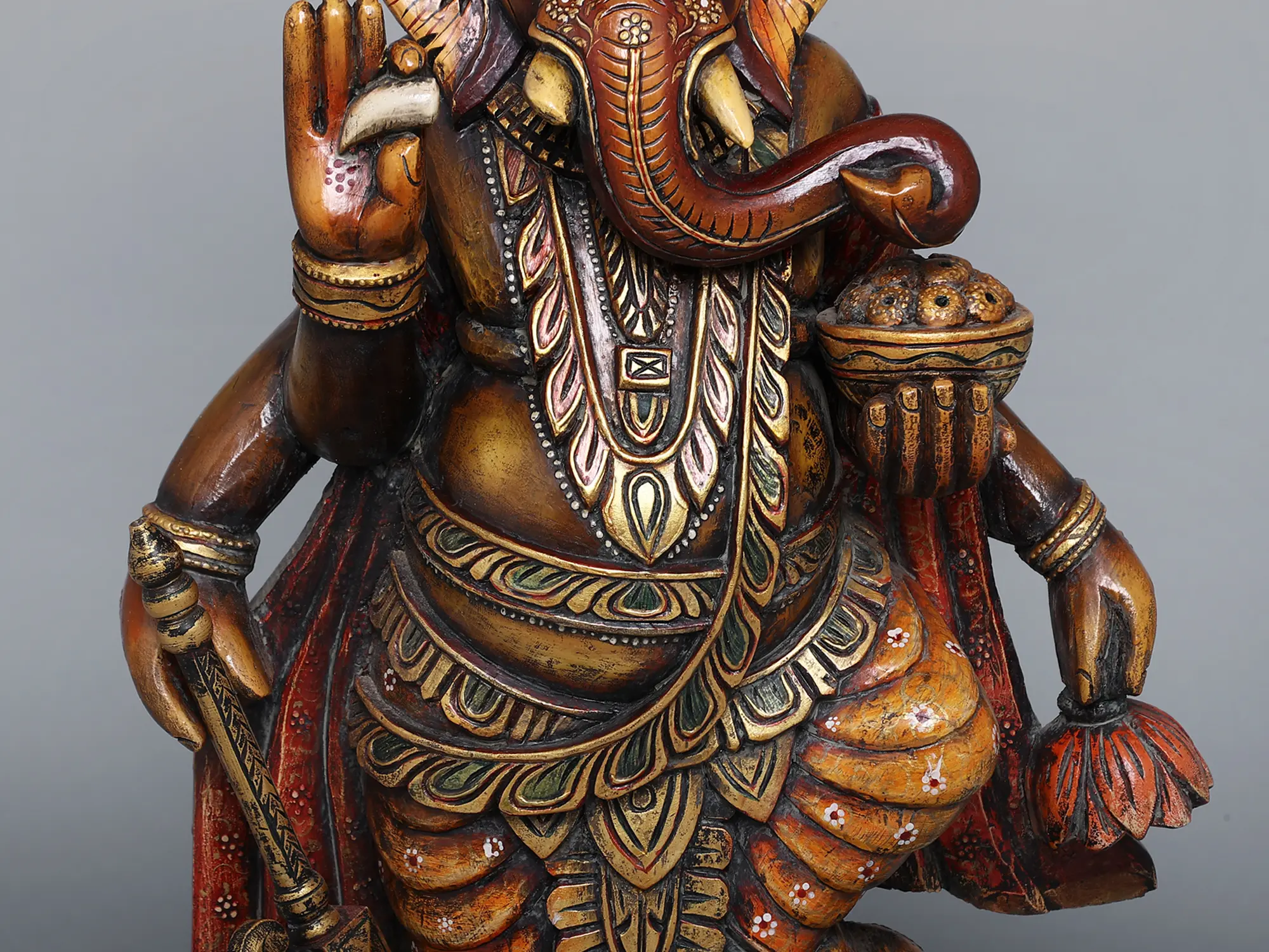 The sculptor has introduced a world of detail into this standing Ganapati composition. A wealth of layers and texture, colour and gradient and finish, is to be found in every square inch of its surface area. These set off not only the attire and the adornment of the divine body, but also its form and complexion and language.
