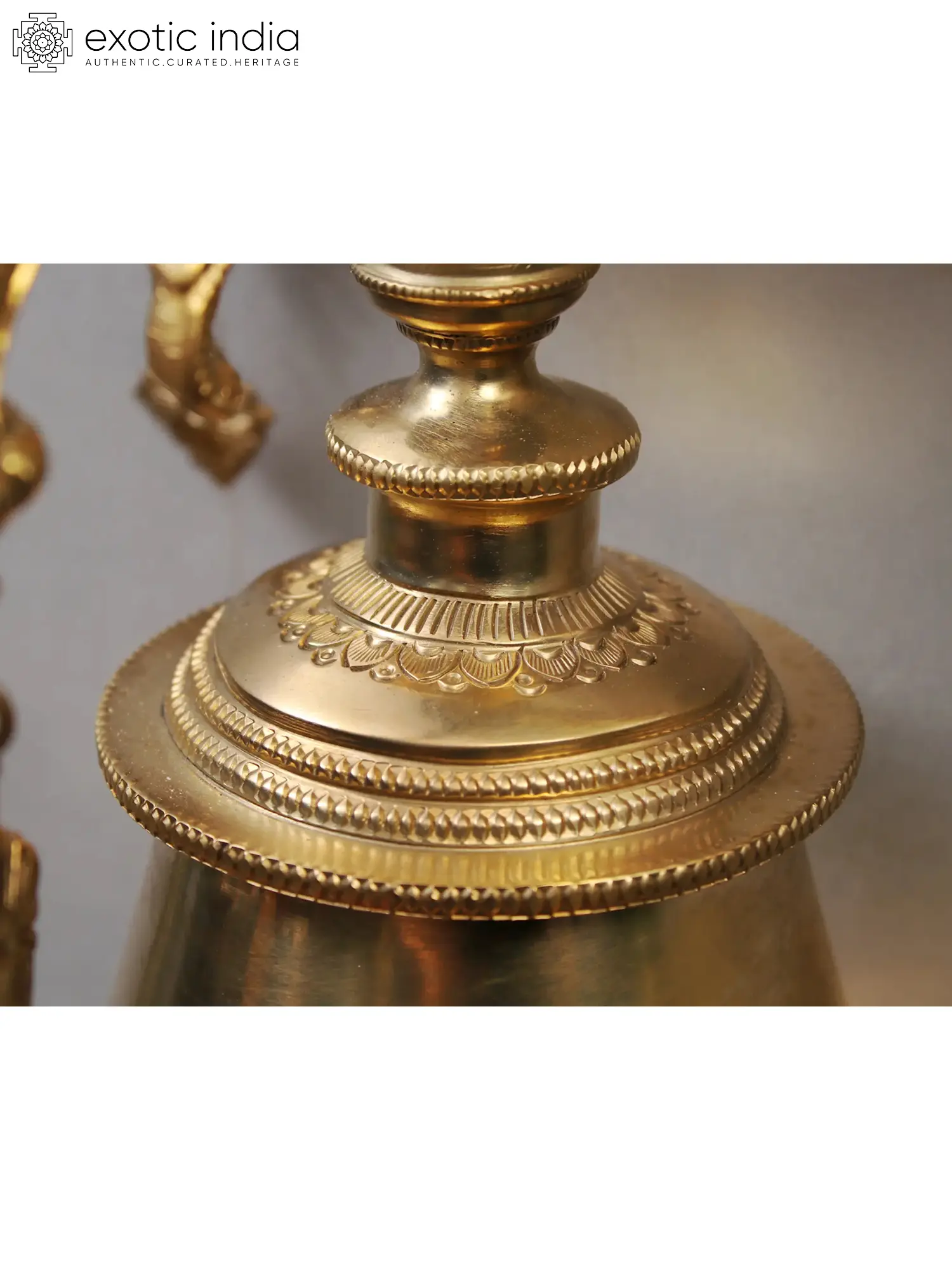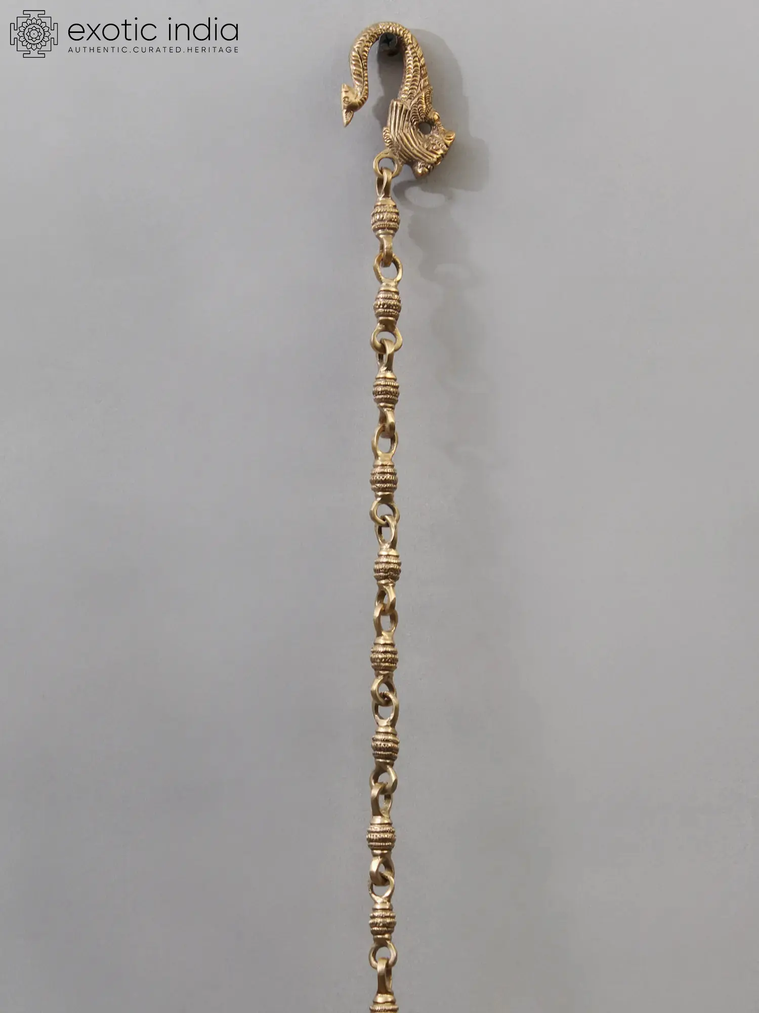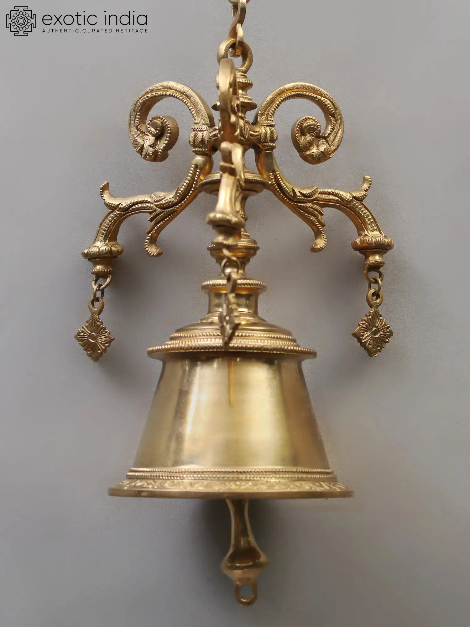 Rung to repel bad energy while attracting positive energy, brass bells are an important component of Hindu ceremonial rites. The round form of the bell represents infinity and completion. The sound of the bell is considered to reflect the primal sound of creation (Om), and it is seen as a kind of divine communication. This metal bell with curled vines on the surface is a great example of how planetary energy interacts with natural forces. The bells come with a robust interconnected chain for hanging. Placing this bell at a place of worship would not only help to harmonize heavenly forces, but it will also fill the environment with a sense of inspiration.