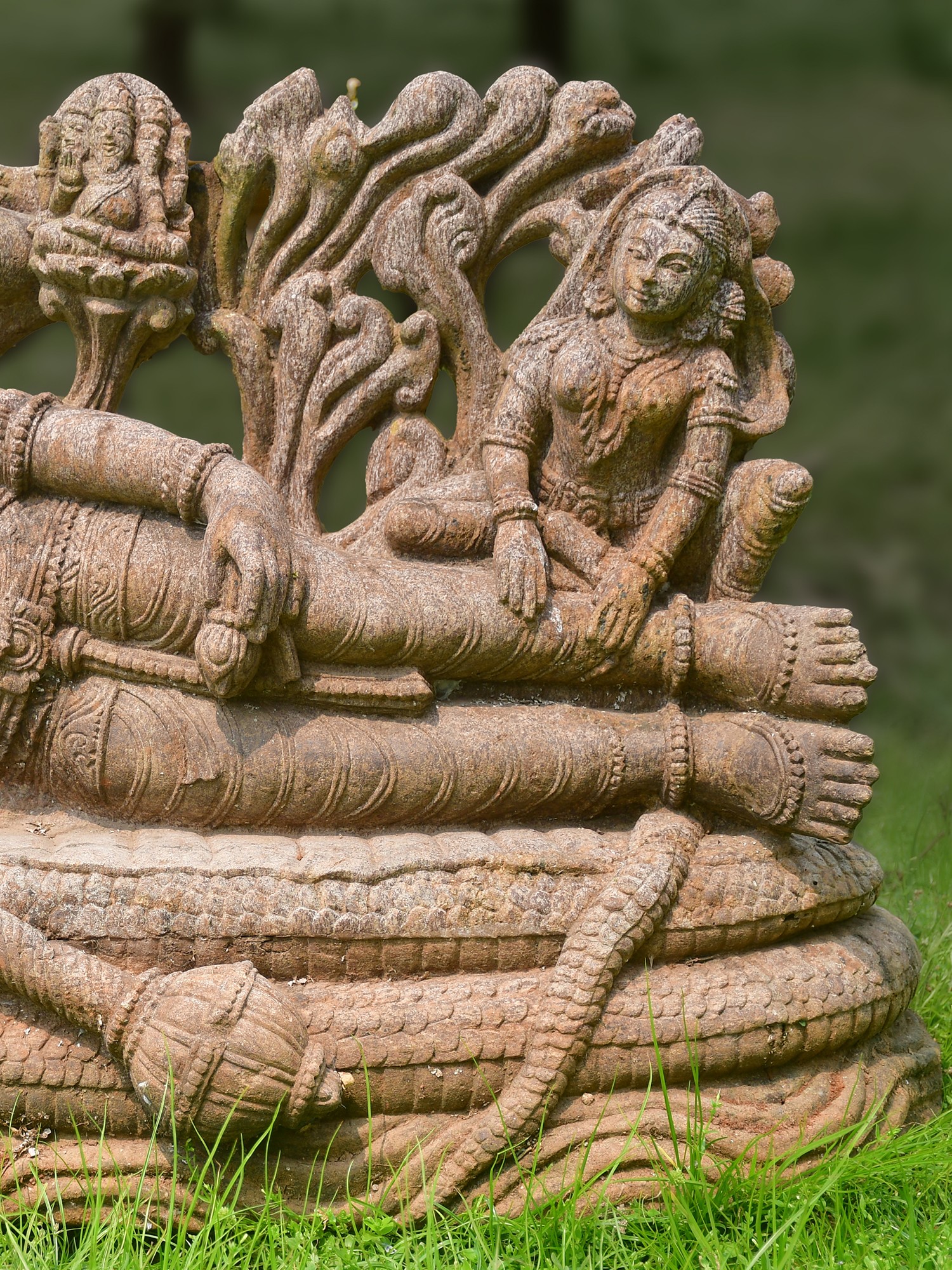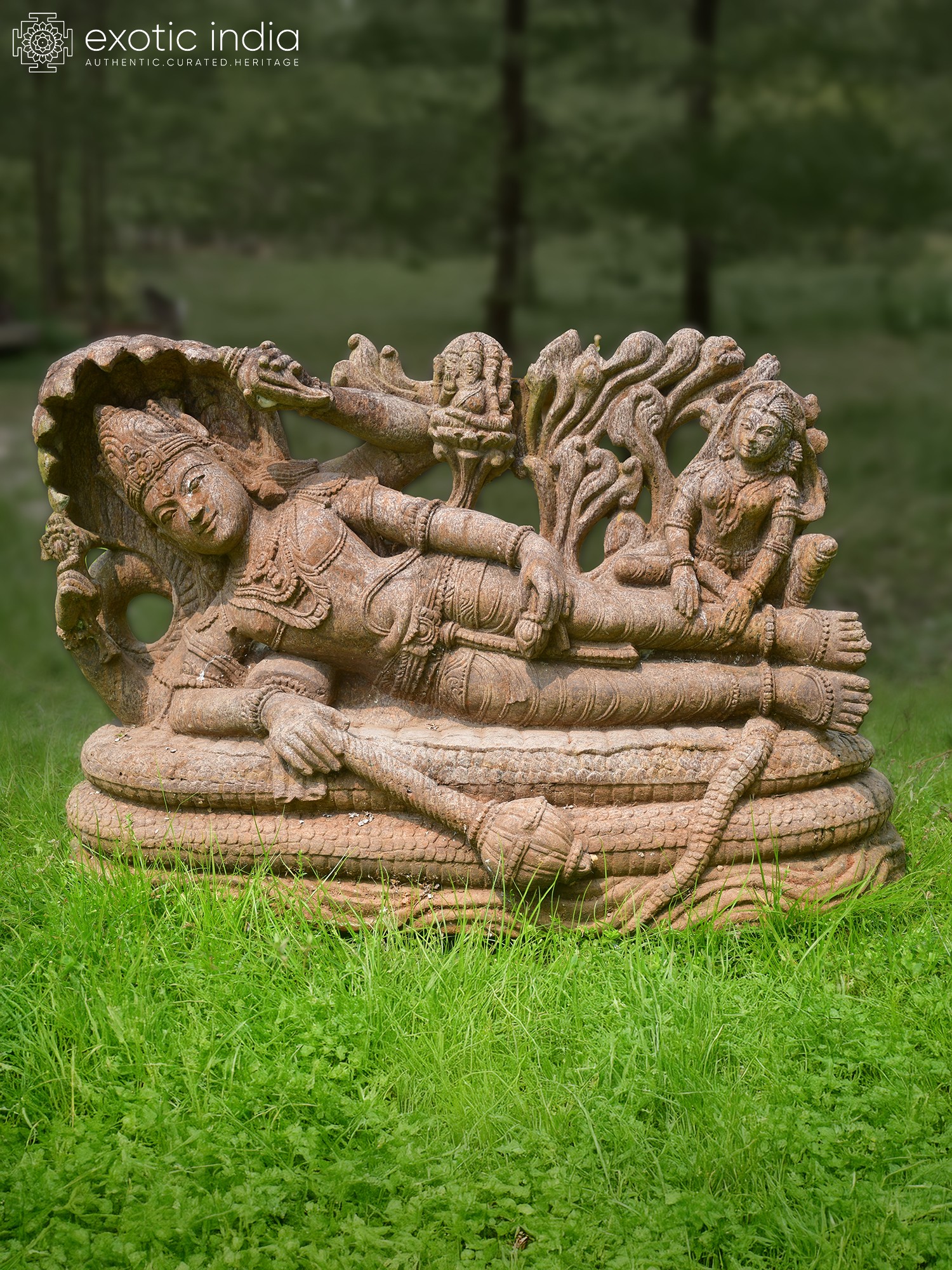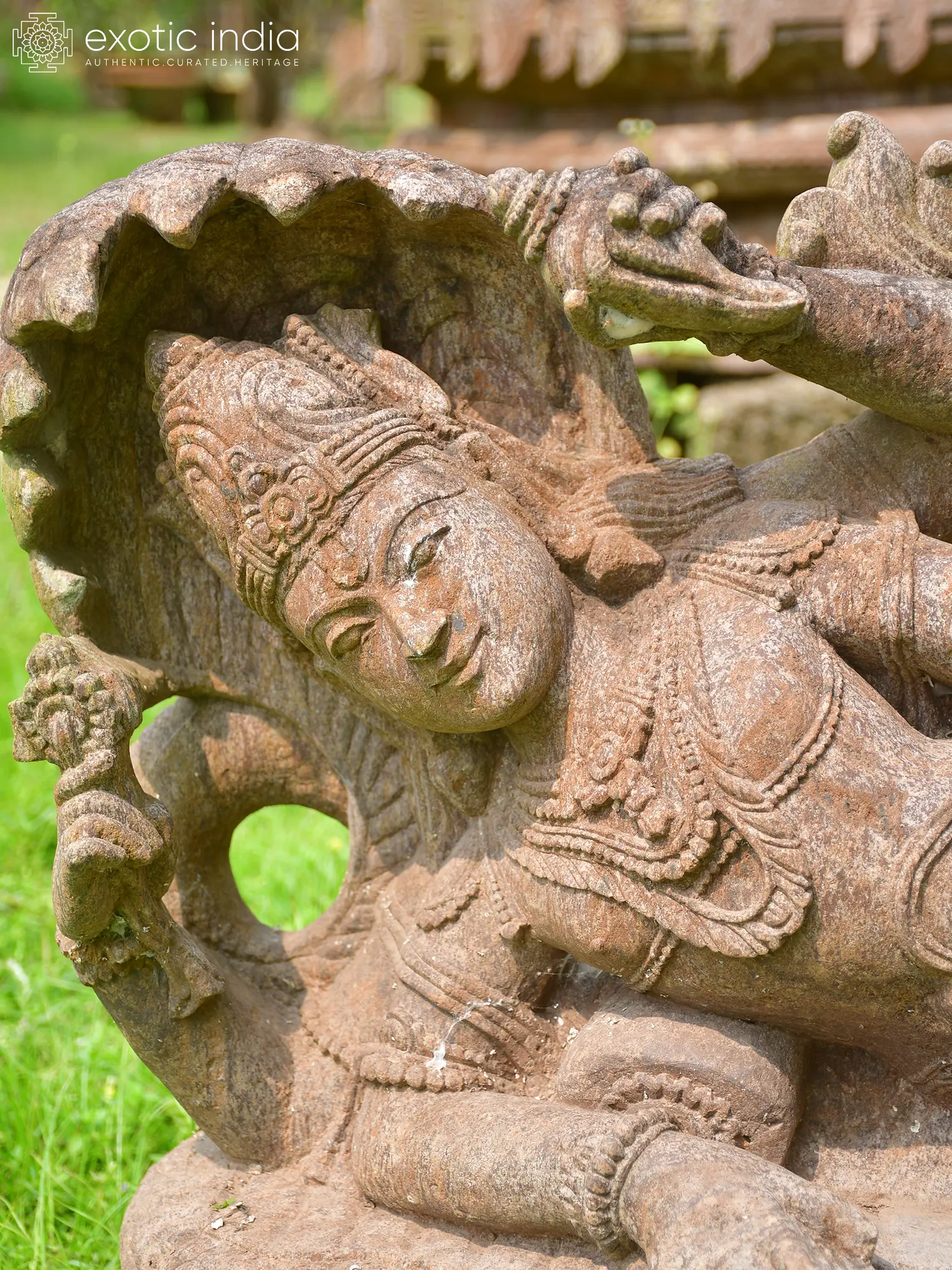 You will appreciate the exquisite detailing that brings this scene to life, from the serene visage of the reclining deity to the delicate rendering of the serpentine coils. The subtle textures and lifelike forms speak to the artisan's profound understanding of their medium. The considerable scale, standing at an impressive 28 inches, ensures a commanding presence, while its thoughtful proportions, measuring 22 inches in depth and 7 inches in width, allow it to be displayed with grace.