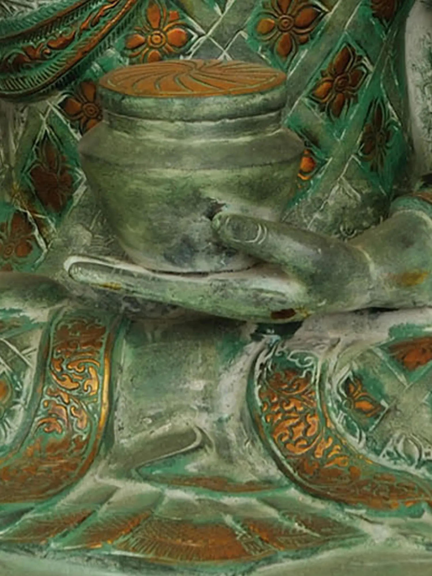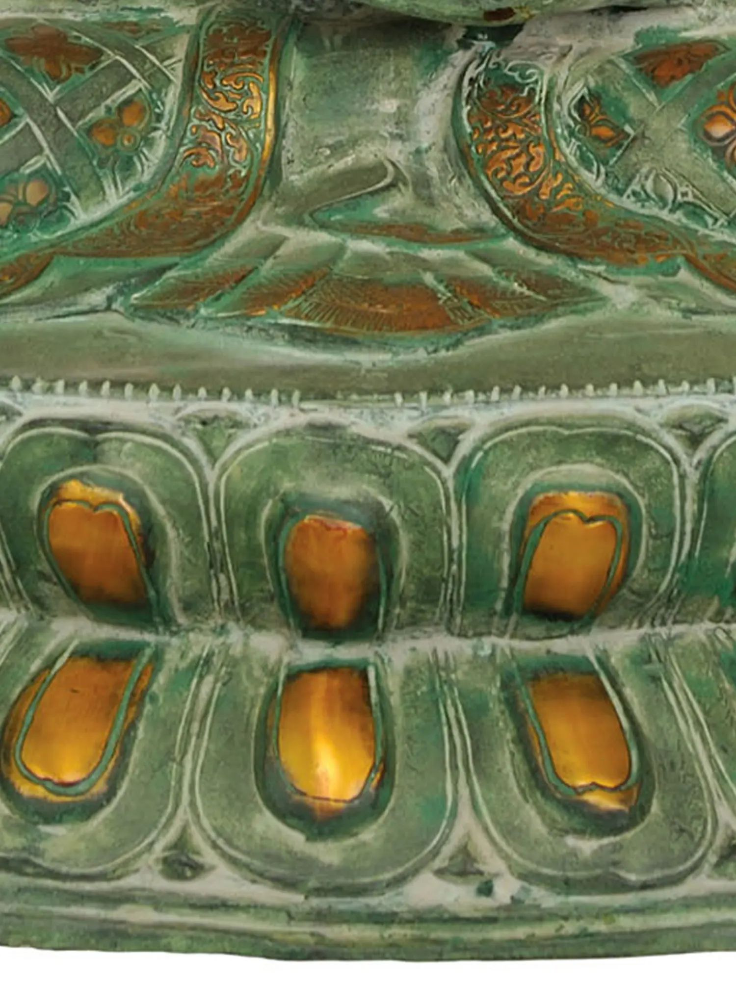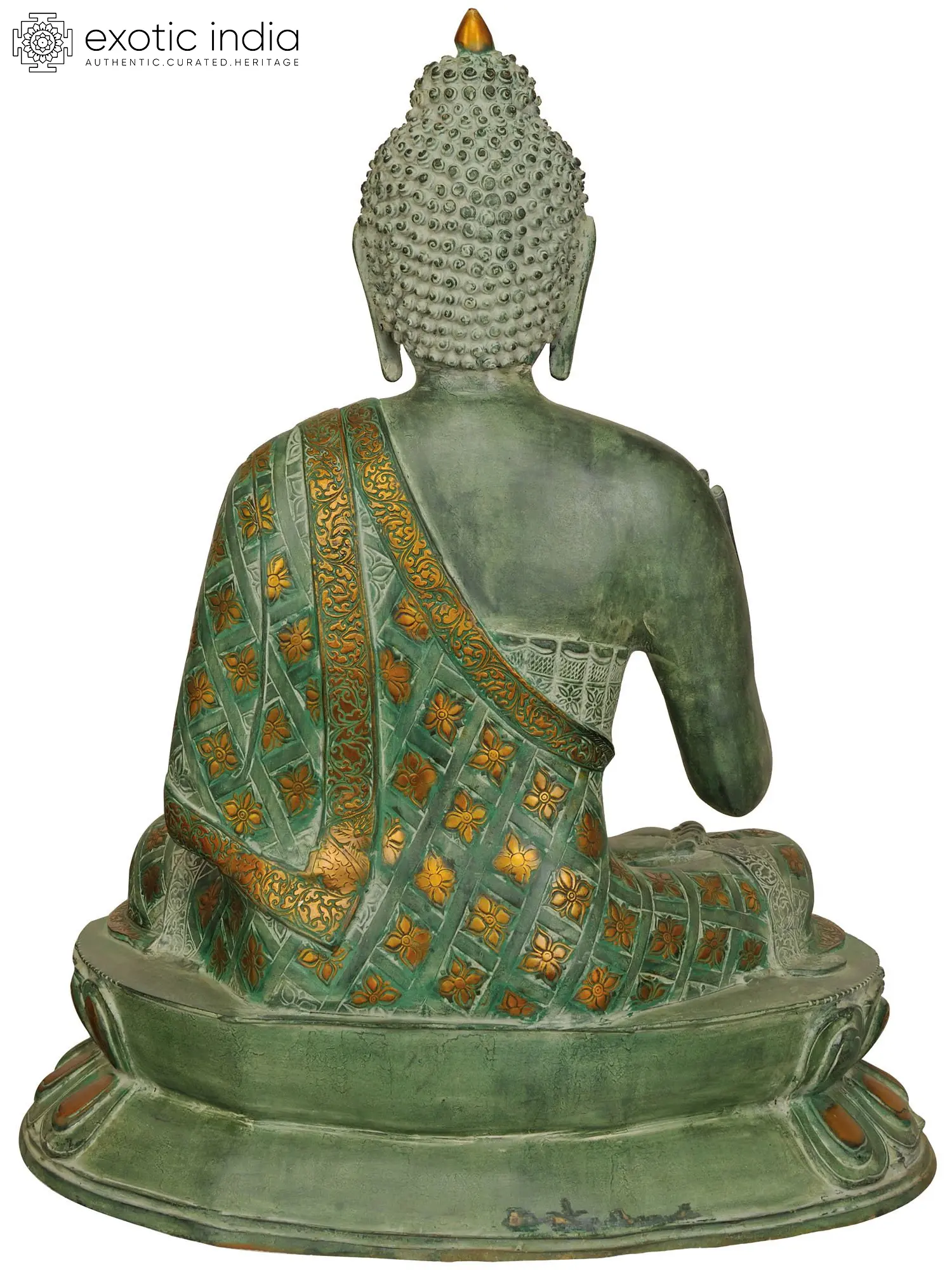 Handmade in India, this substantial brass statue is a masterpiece of traditional craftsmanship. The verdigris patina lends an ancient, timeless aura to the piece, evoking the deep history and spiritual significance associated with Buddhist art. The intricate details of the Buddha's robes are a marvel to behold, adorned with delicate floral motifs in a contrasting gold hue. These floral patterns are not merely decorative; they often symbolize purity, rebirth, and the blossoming of enlightenment. The urna, the auspicious mark on the forehead, and the ushnisha, the cranial protuberance signifying wisdom, are rendered with precision, further enhancing the spiritual essence of the figure. The Buddha is seated in the classic lotus posture (Padmasana) atop a beautifully sculpted lotus throne. The lotus, a potent symbol in many Eastern traditions, represents purity of heart and mind, rising untainted from the mud to blossom in the light. The multiple layers of the lotus petals on the base add to the grandeur and stability of the sculpture, grounding the divine figure in earthly beauty.